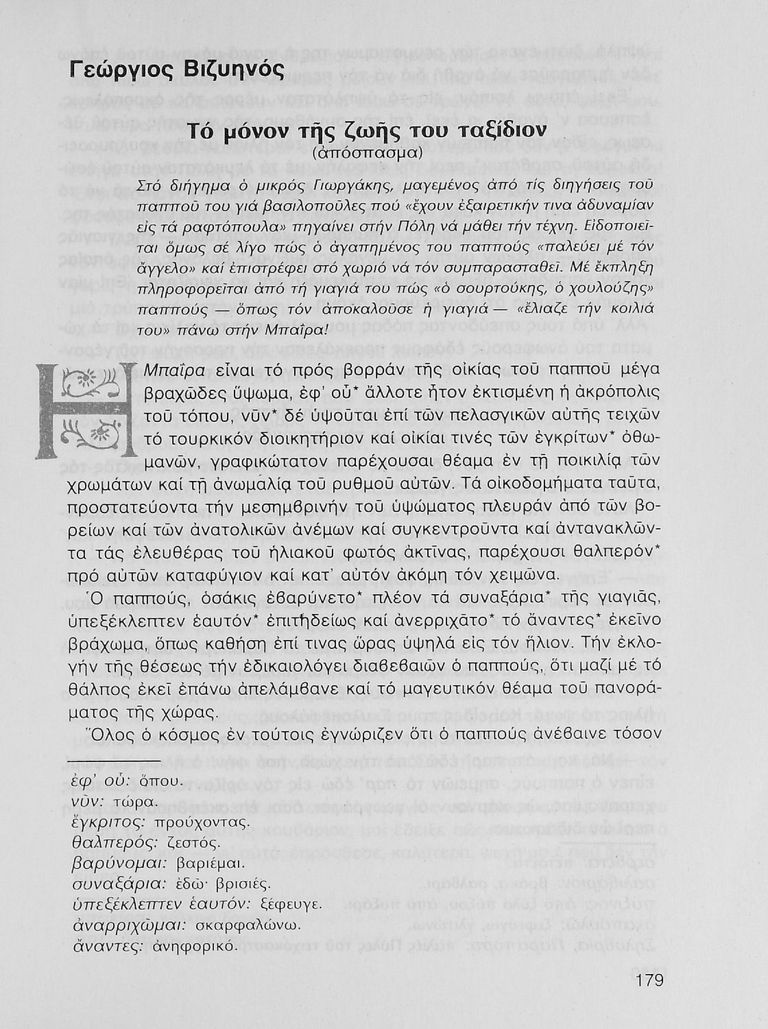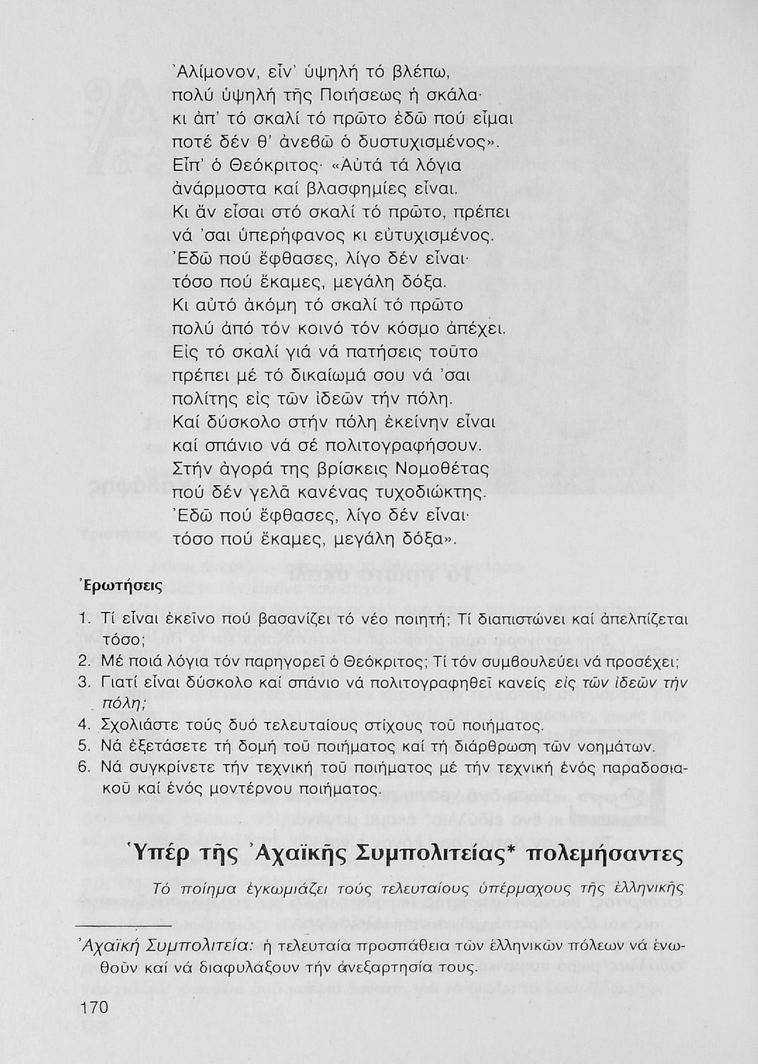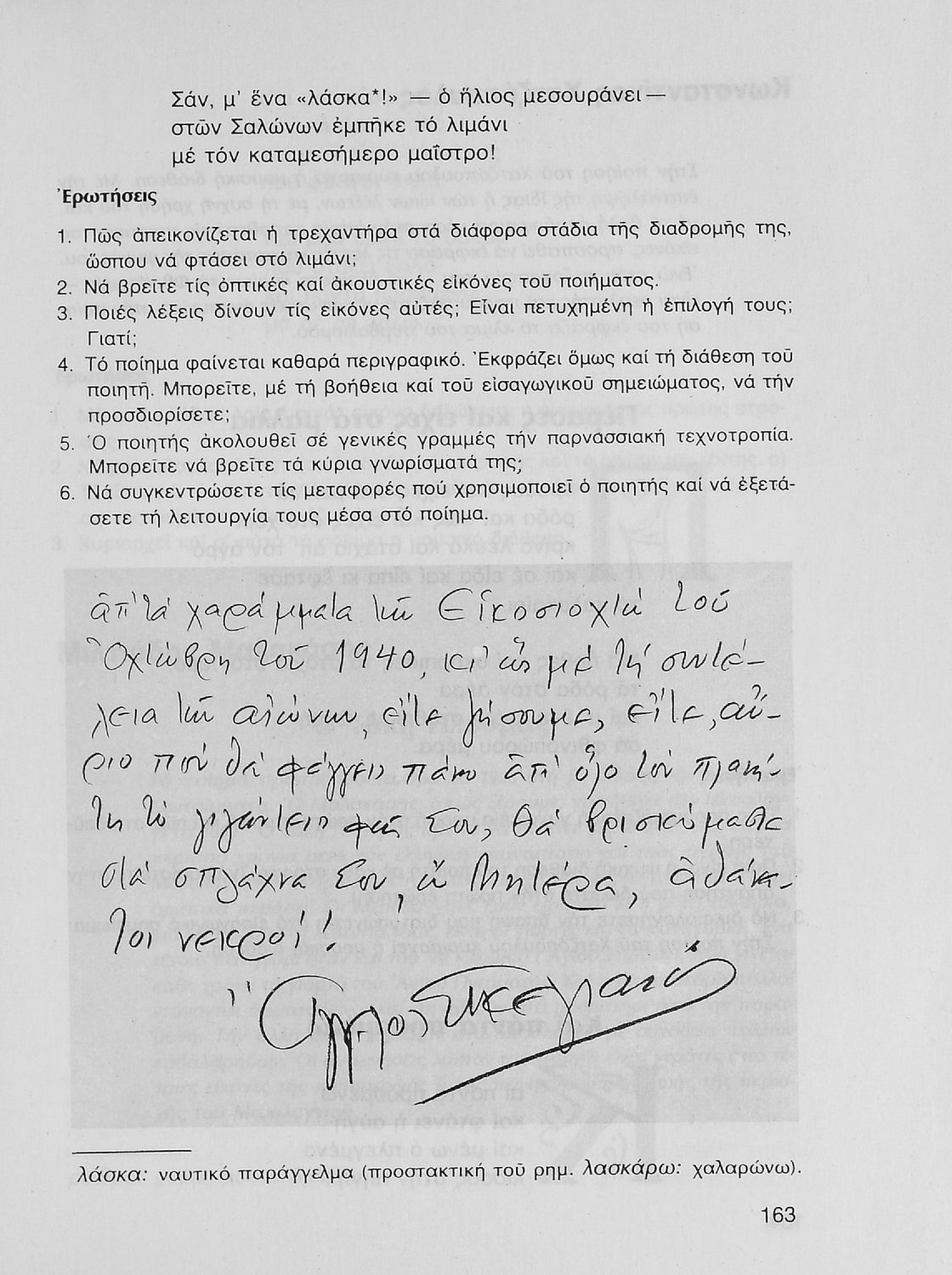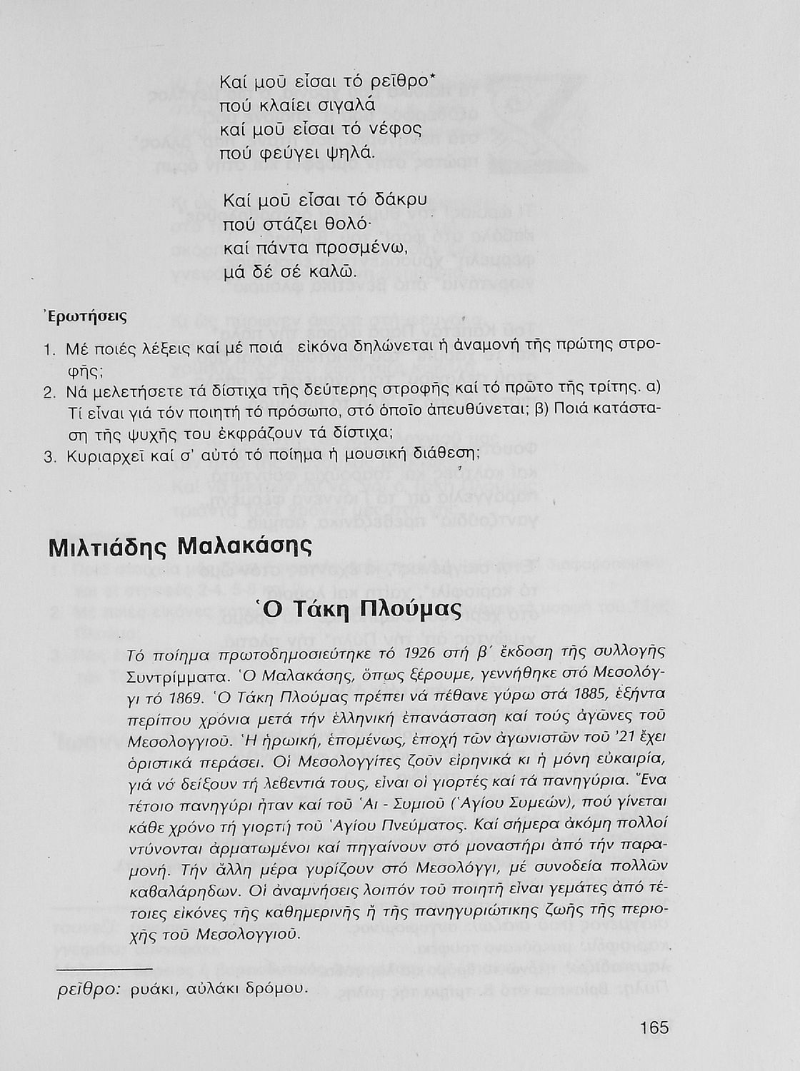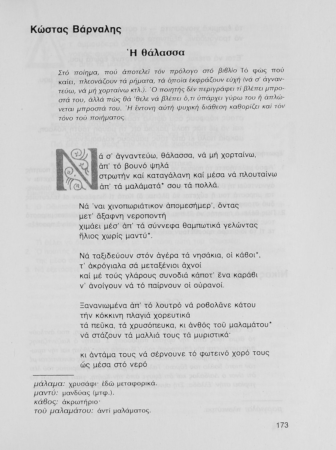 Σχολικό εγχειρίδιο Νέων Ελληνικών Γ΄ Γυμνασίου που περιλαμβάνει δημοτικά τραγούδια, και χαρακτηριστικά δείγματα της κρητικής λογοτεχνίας, της επτανησιακής και ρομαντικής σχολής, της Νέας Αθηναϊκής Σχολής και της νεότερης και μεταπολεμικής λογοτεχνίας. Περιέχει και έργα σύγχρονων ξένων συγγραφέων, βιογραφικά και εισαγωγικά σημειώματα.