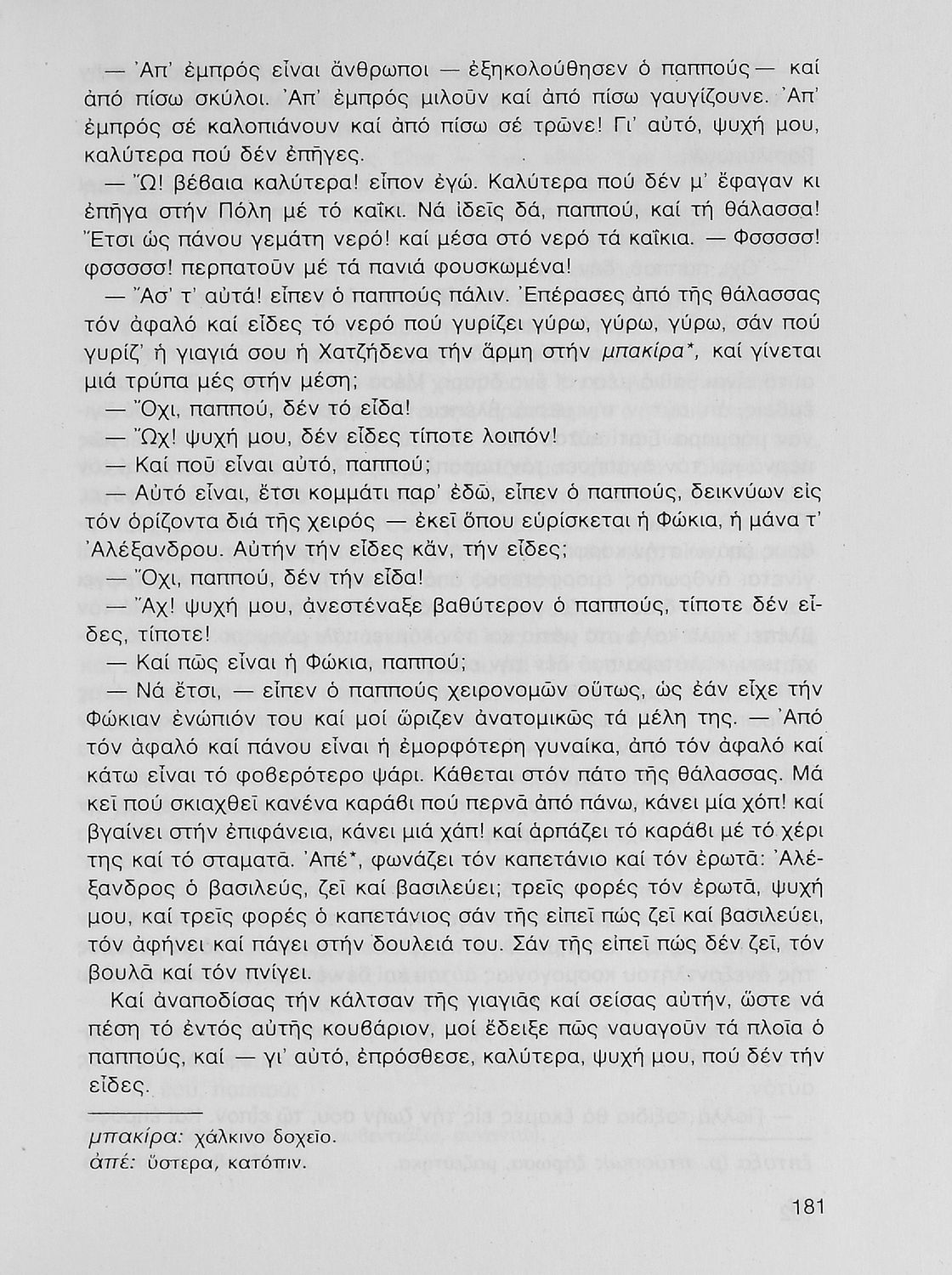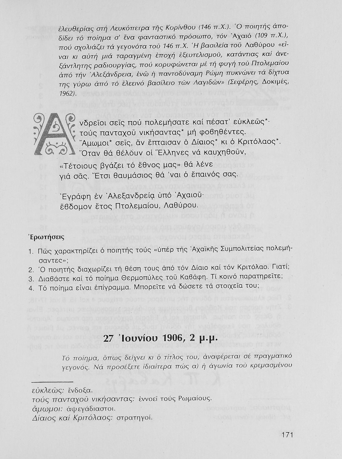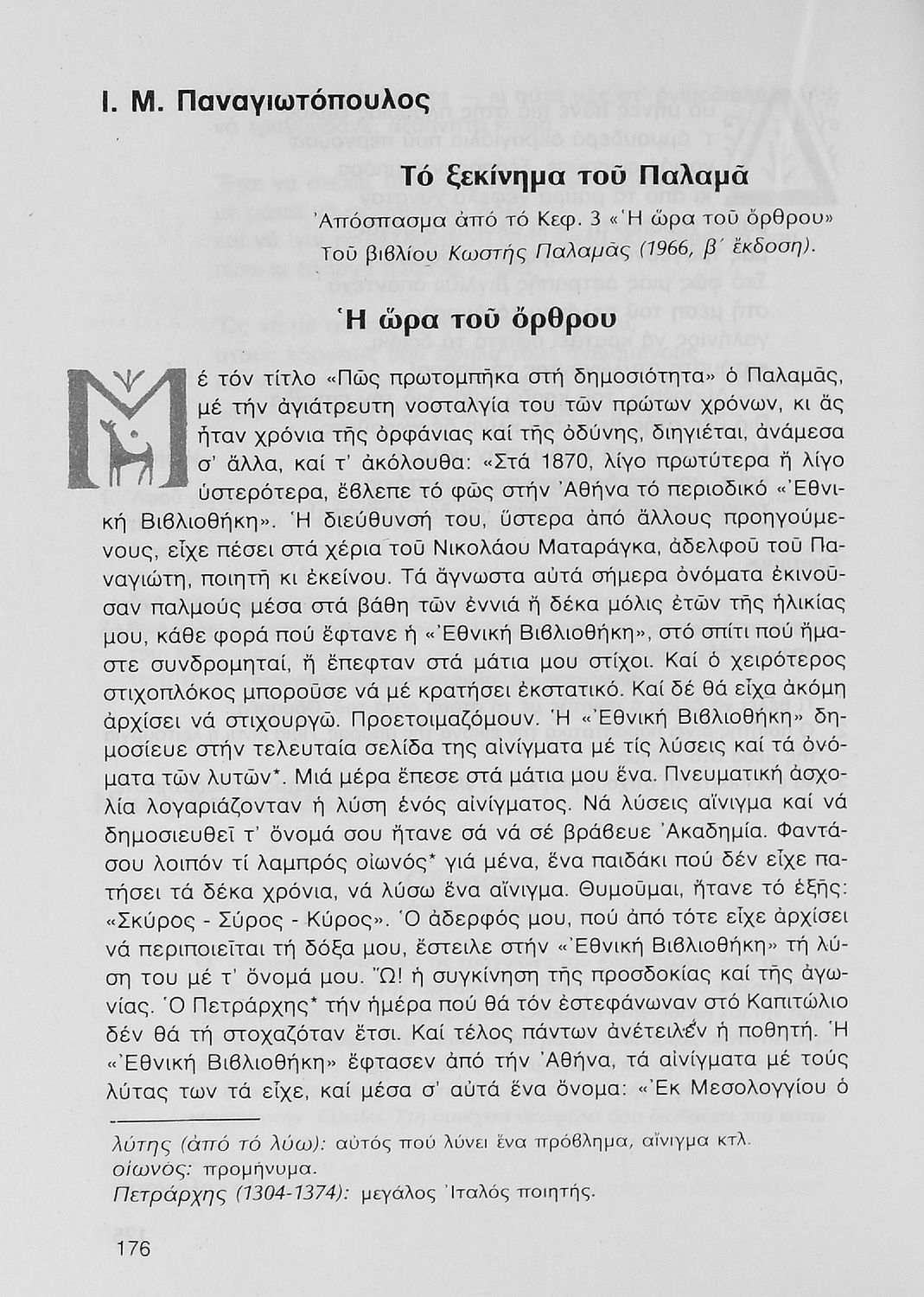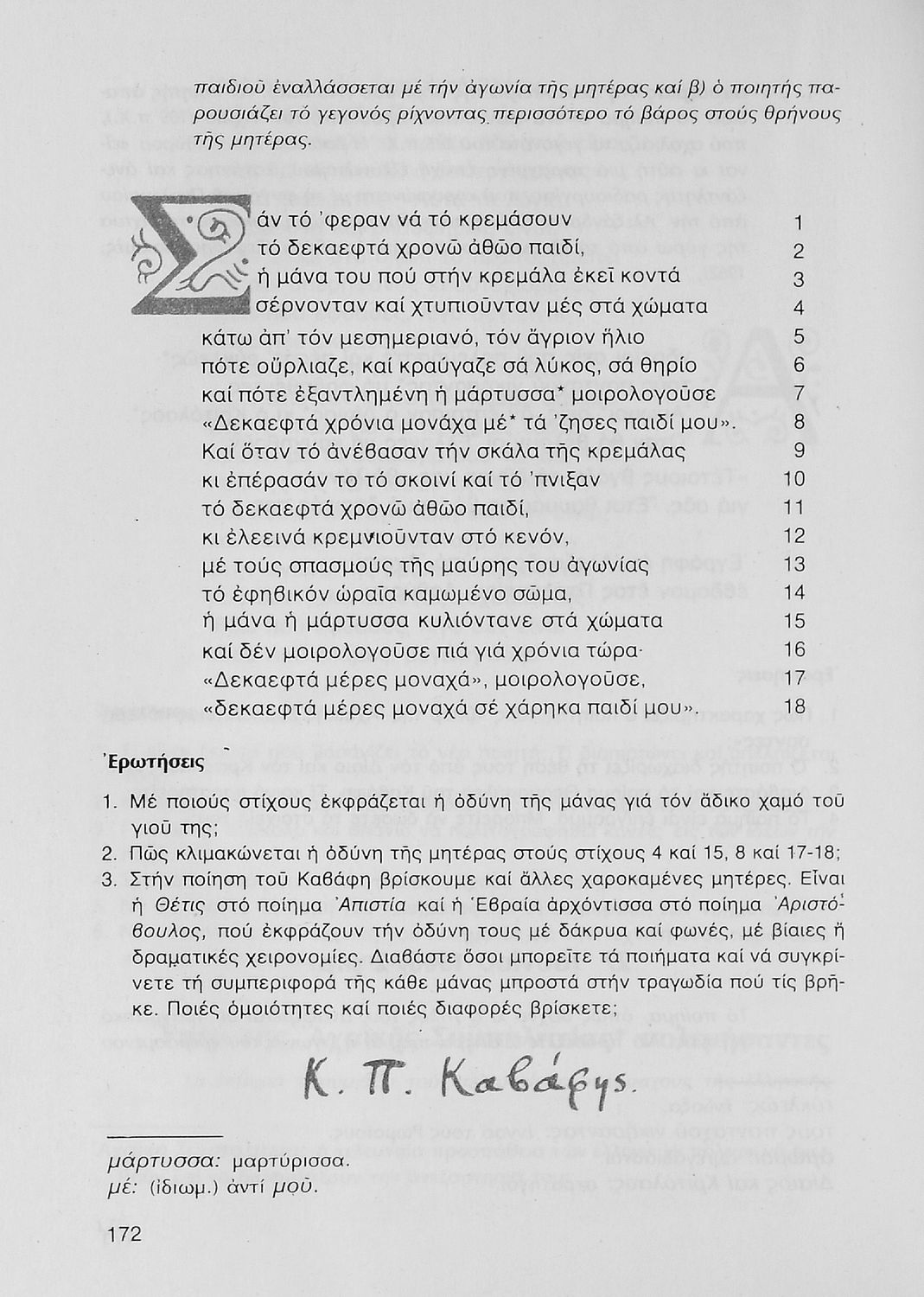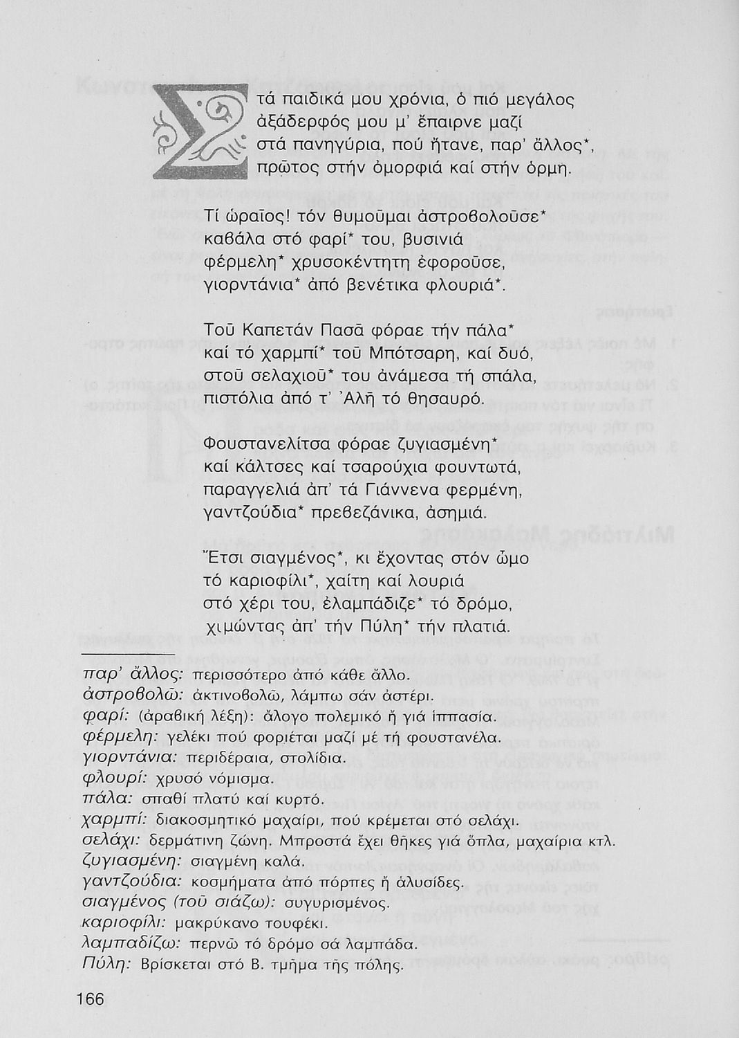 Σχολικό εγχειρίδιο Νέων Ελληνικών Γ΄ Γυμνασίου που περιλαμβάνει δημοτικά τραγούδια, και χαρακτηριστικά δείγματα της κρητικής λογοτεχνίας, της επτανησιακής και ρομαντικής σχολής, της Νέας Αθηναϊκής Σχολής και της νεότερης και μεταπολεμικής λογοτεχνίας. Περιέχει και έργα σύγχρονων ξένων συγγραφέων, βιογραφικά και εισαγωγικά σημειώματα.