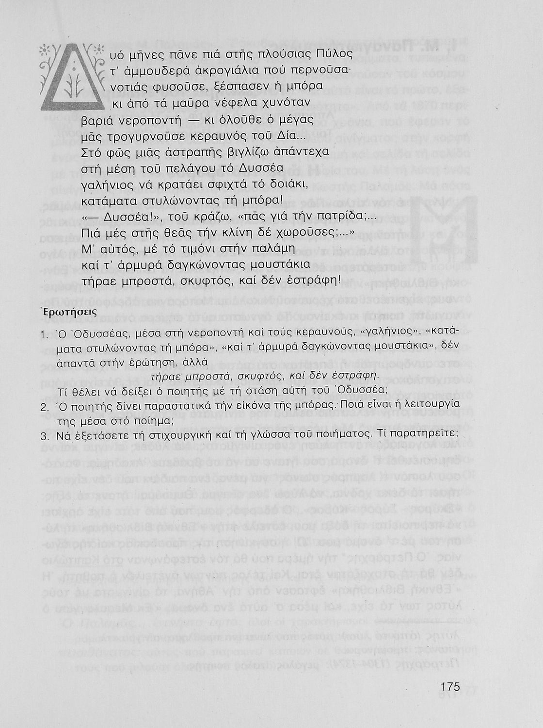 Σχολικό εγχειρίδιο Νέων Ελληνικών Α΄ Γυμνασίου που περιλαμβάνει δοκίμια, πεζά και ποιήματα Ελλήνων συγγραφέων και δημοτικά τραγούδια εμπνευσμένα από τη θρησκευτική, εθνική και κοινωνική ζωή, τη "δοκιμασία της ...