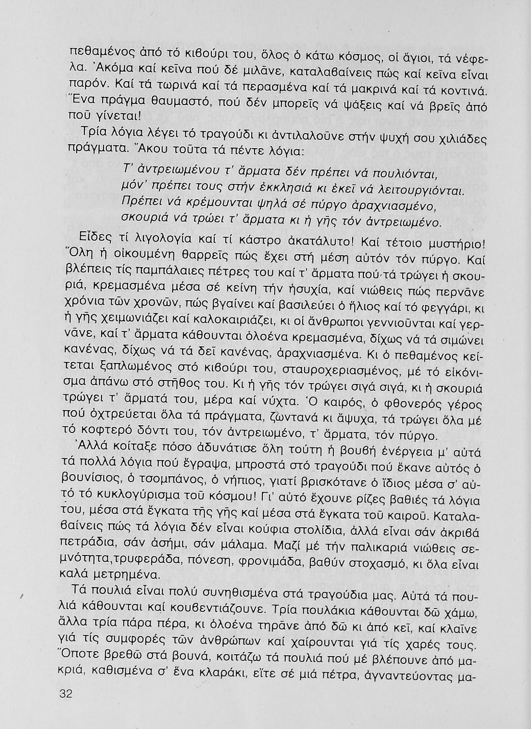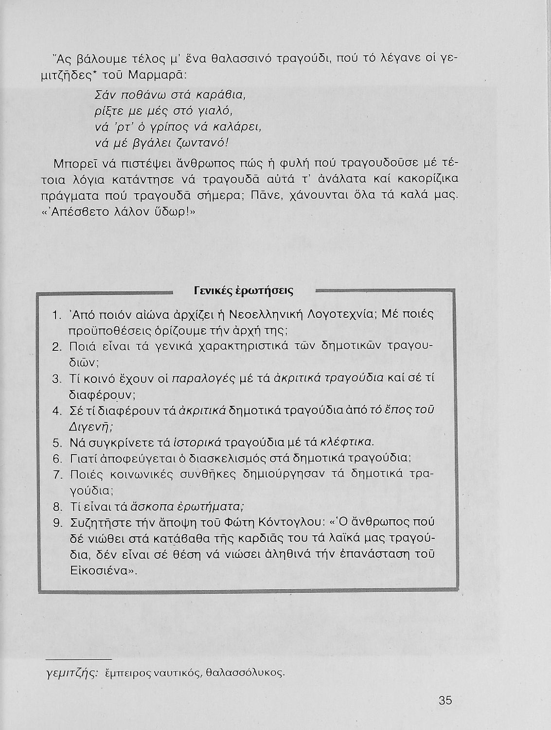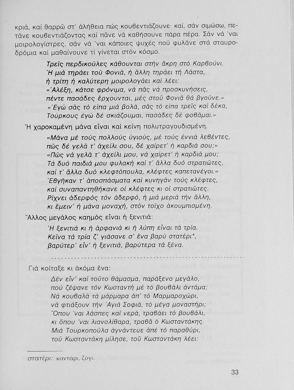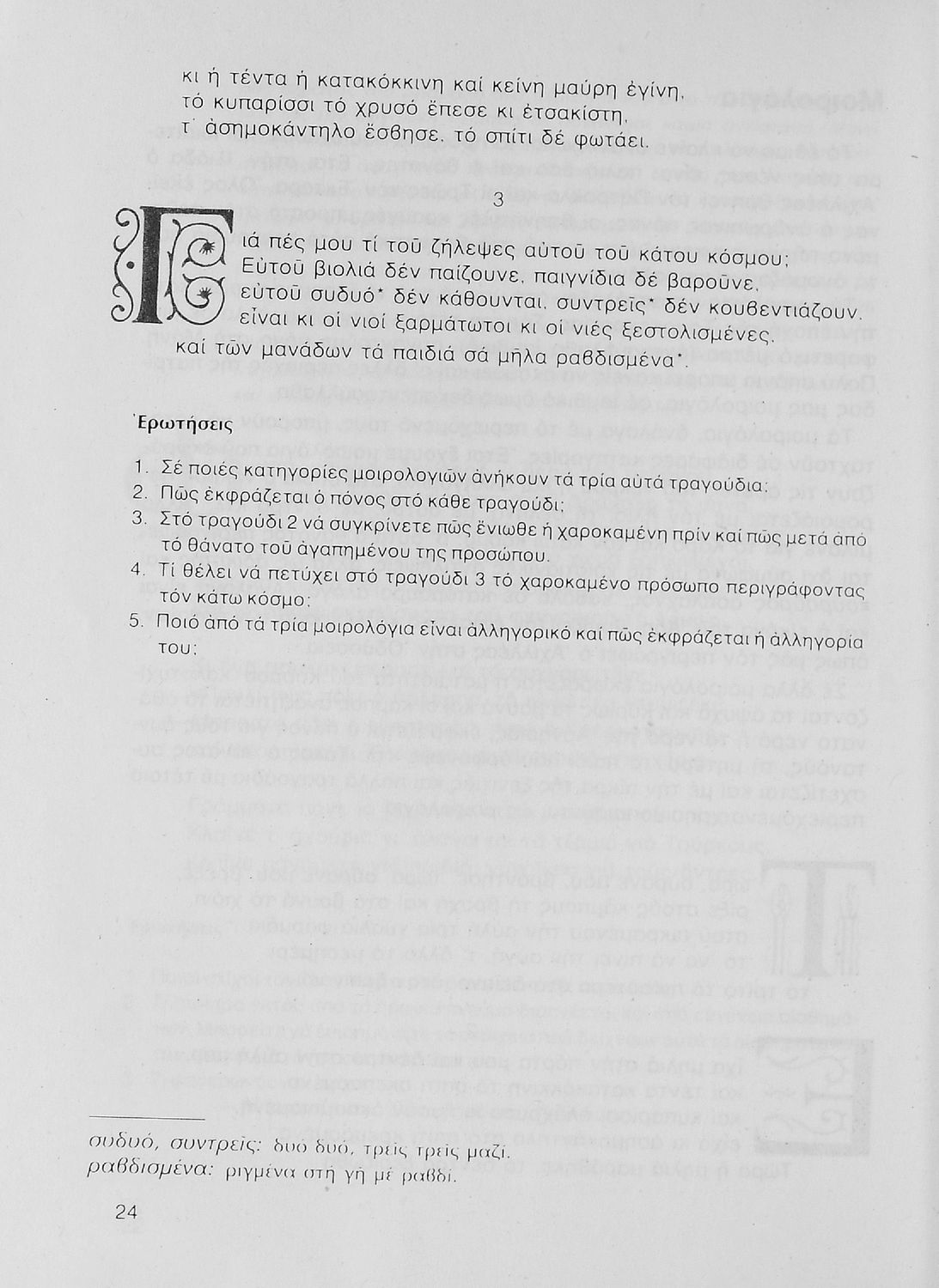 Σχολικό εγχειρίδιο Νέων Ελληνικών Γ΄ Γυμνασίου που περιλαμβάνει δημοτικά τραγούδια, και χαρακτηριστικά δείγματα της κρητικής λογοτεχνίας, της επτανησιακής και ρομαντικής σχολής, της Νέας Αθηναϊκής Σχολής και της νεότερης και μεταπολεμικής λογοτεχνίας. Περιέχει και έργα σύγχρονων ξένων συγγραφέων, βιογραφικά και εισαγωγικά σημειώματα.