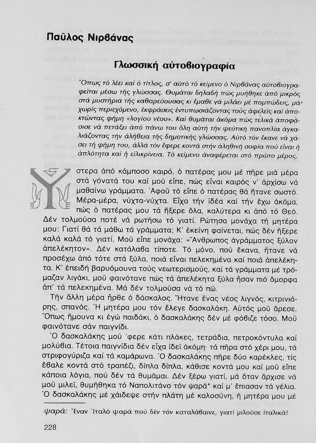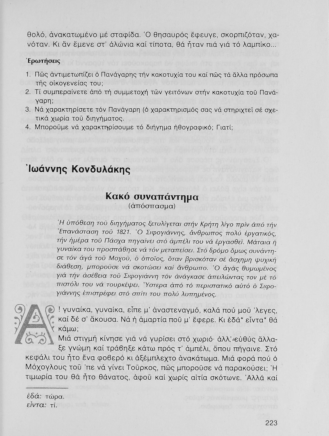 Σχολικό εγχειρίδιο Νέων Ελληνικών Α΄ Γυμνασίου που περιλαμβάνει δοκίμια, πεζά και ποιήματα Ελλήνων συγγραφέων και δημοτικά τραγούδια εμπνευσμένα από τη θρησκευτική, εθνική και κοινωνική ζωή, τη "δοκιμασία της ...