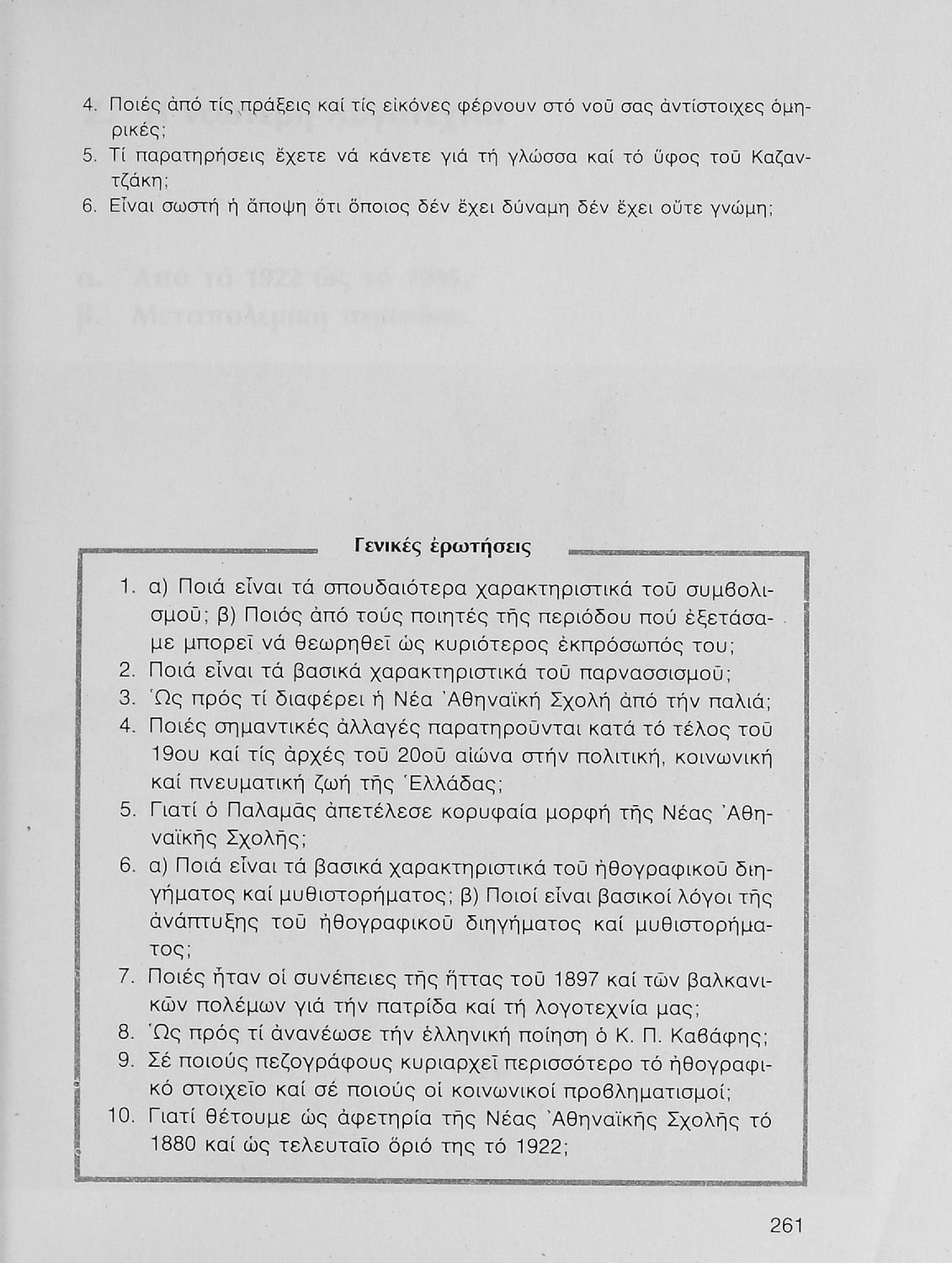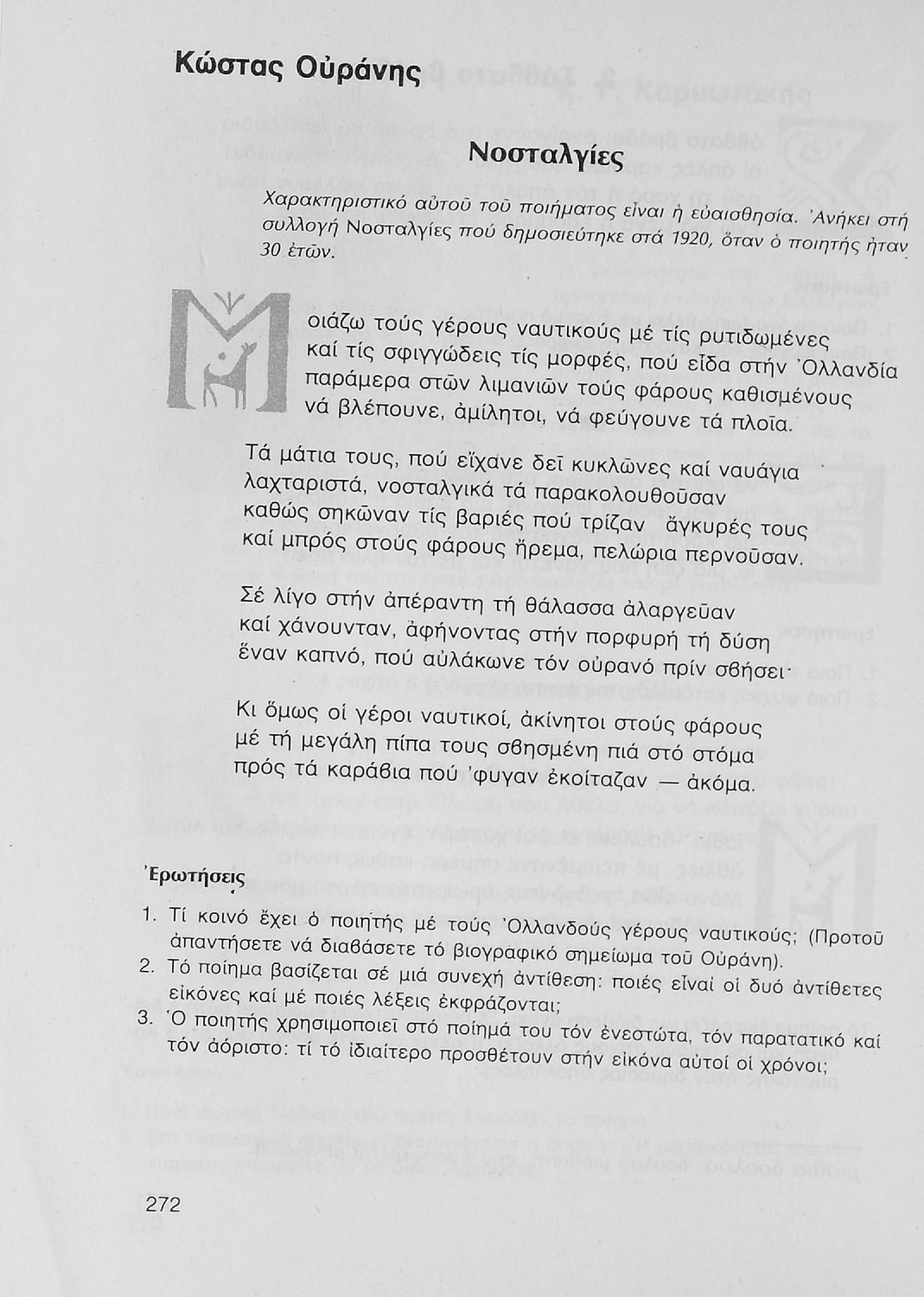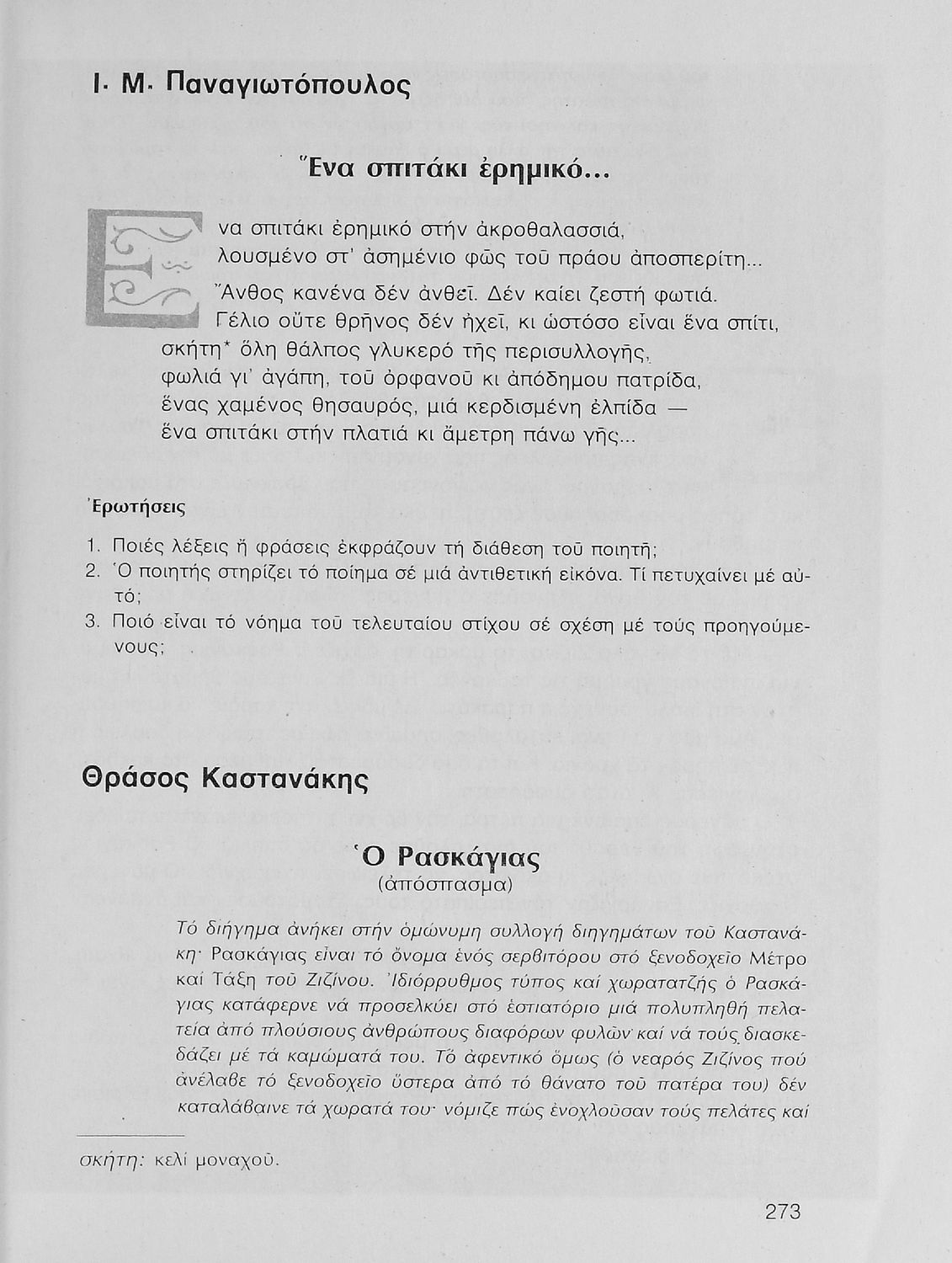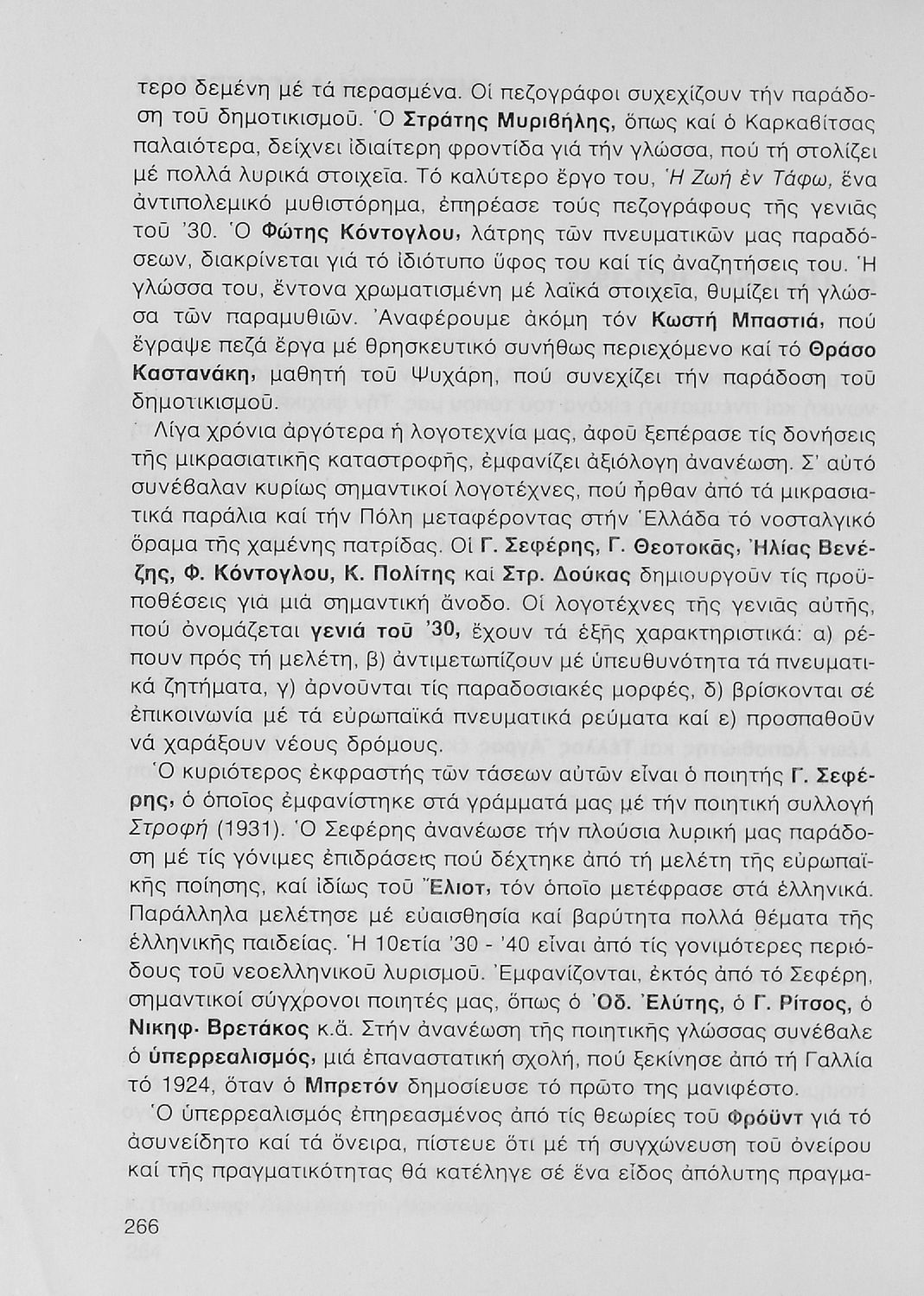 Σχολικό εγχειρίδιο Νέων Ελληνικών Γ΄ Γυμνασίου που περιλαμβάνει δημοτικά τραγούδια, και χαρακτηριστικά δείγματα της κρητικής λογοτεχνίας, της επτανησιακής και ρομαντικής σχολής, της Νέας Αθηναϊκής Σχολής και της νεότερης και μεταπολεμικής λογοτεχνίας. Περιέχει και έργα σύγχρονων ξένων συγγραφέων, βιογραφικά και εισαγωγικά σημειώματα.
