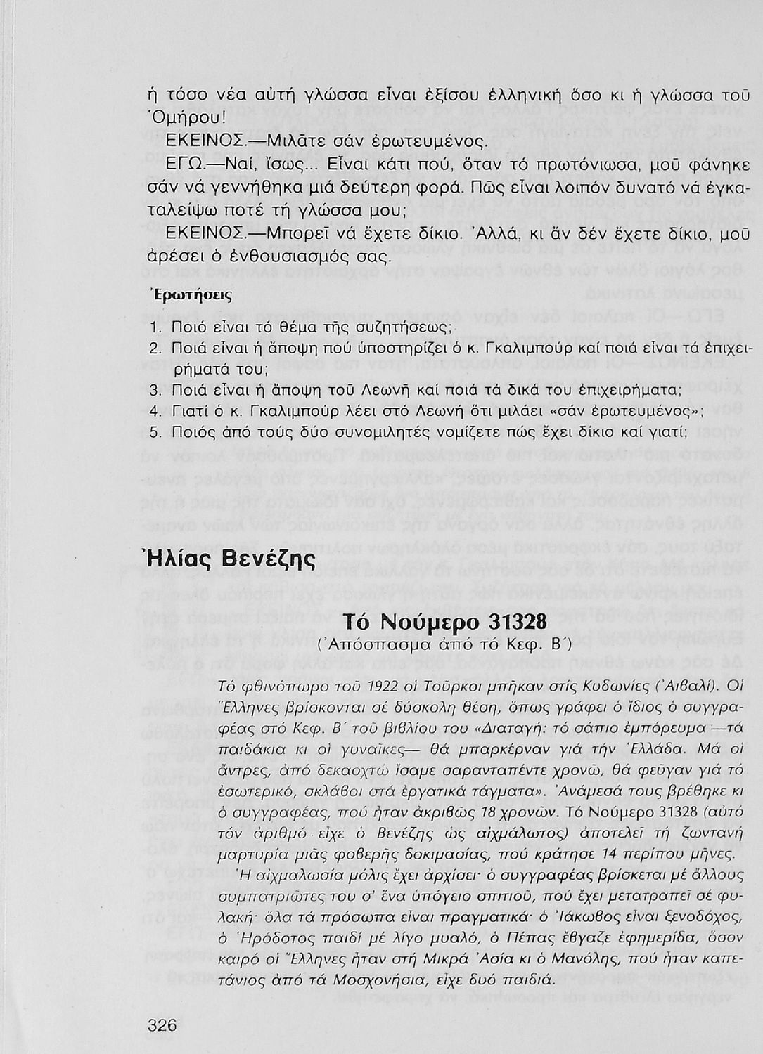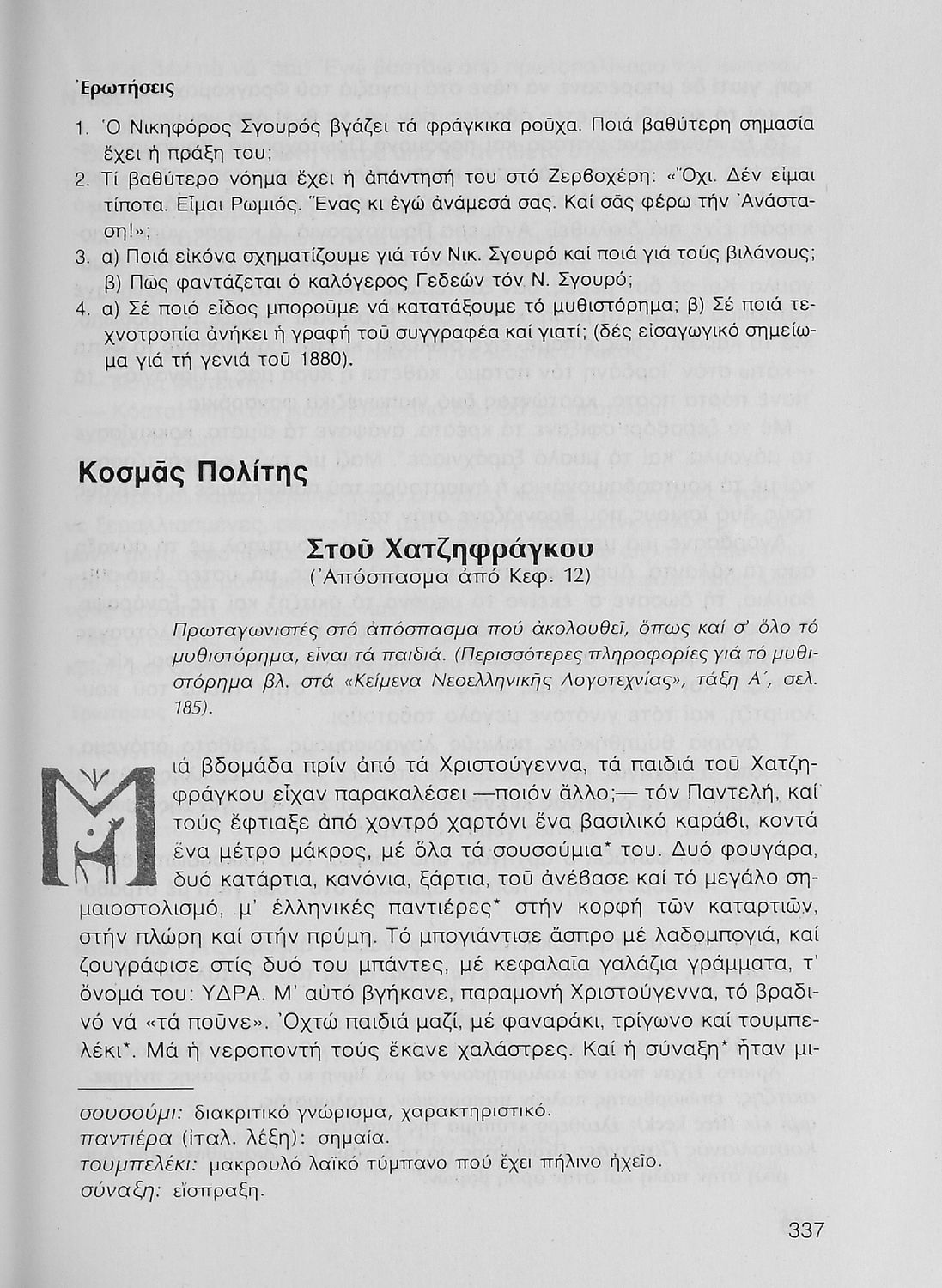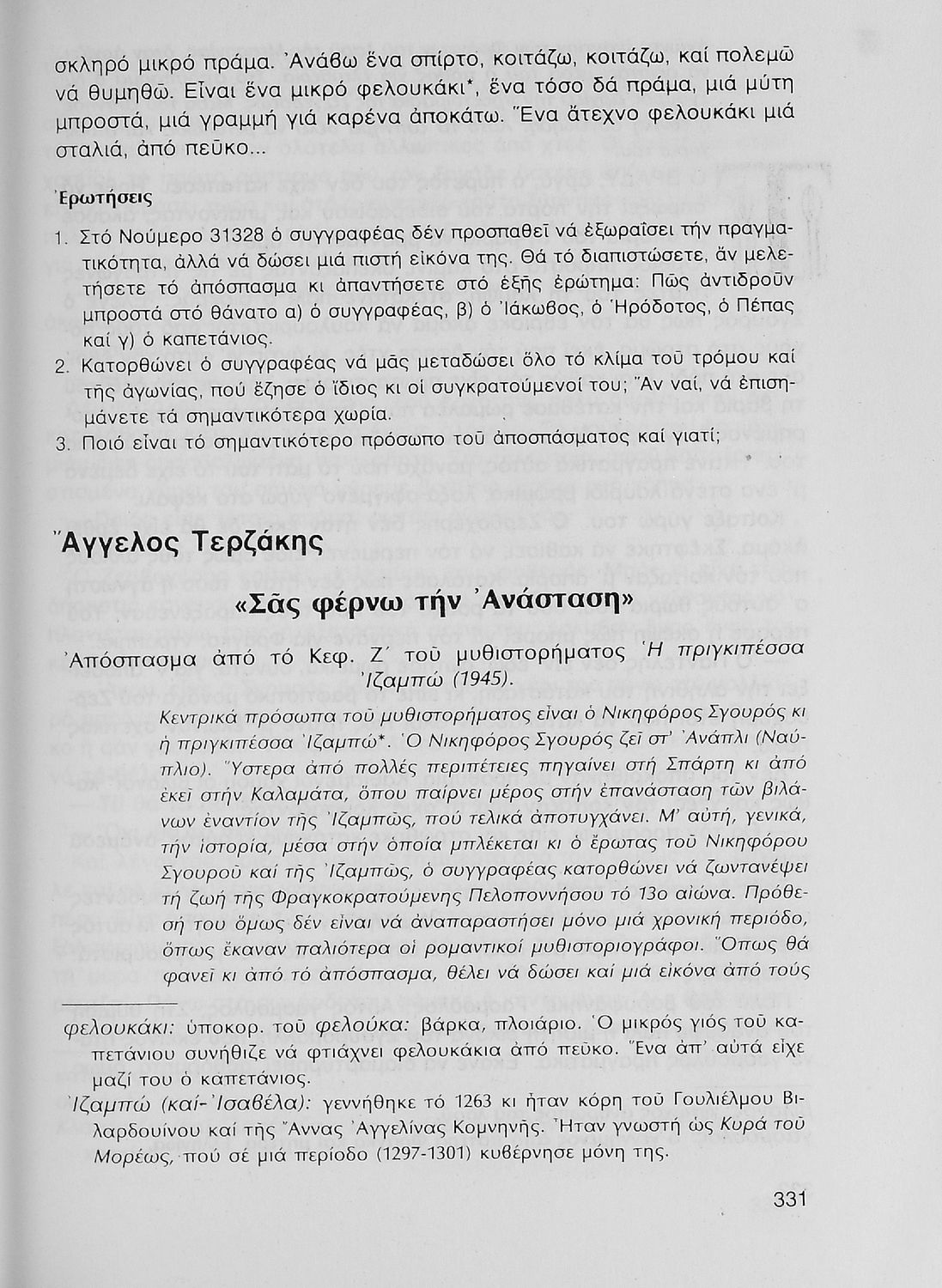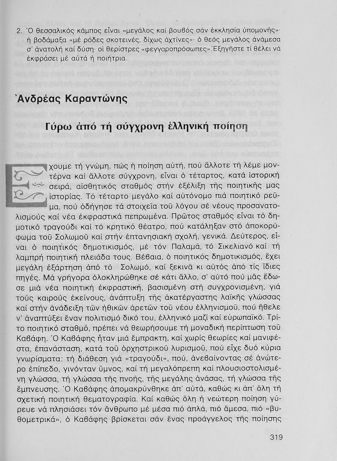 Σχολικό εγχειρίδιο Νέων Ελληνικών Γ΄ Γυμνασίου που περιλαμβάνει δημοτικά τραγούδια, και χαρακτηριστικά δείγματα της κρητικής λογοτεχνίας, της επτανησιακής και ρομαντικής σχολής, της Νέας Αθηναϊκής Σχολής και της νεότερης και μεταπολεμικής λογοτεχνίας. Περιέχει και έργα σύγχρονων ξένων συγγραφέων, βιογραφικά και εισαγωγικά σημειώματα.