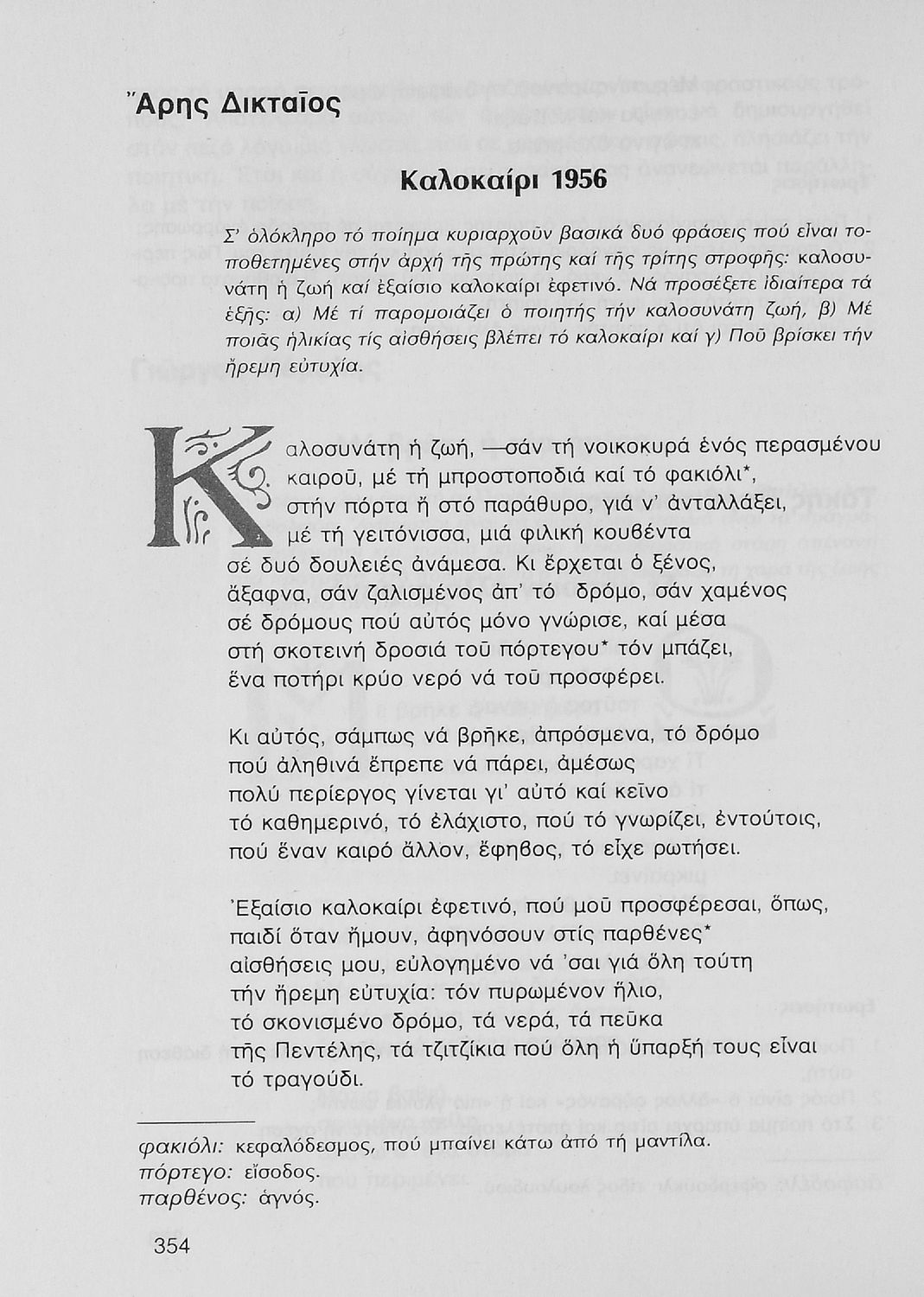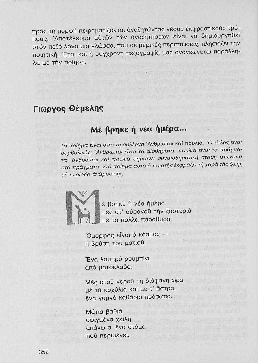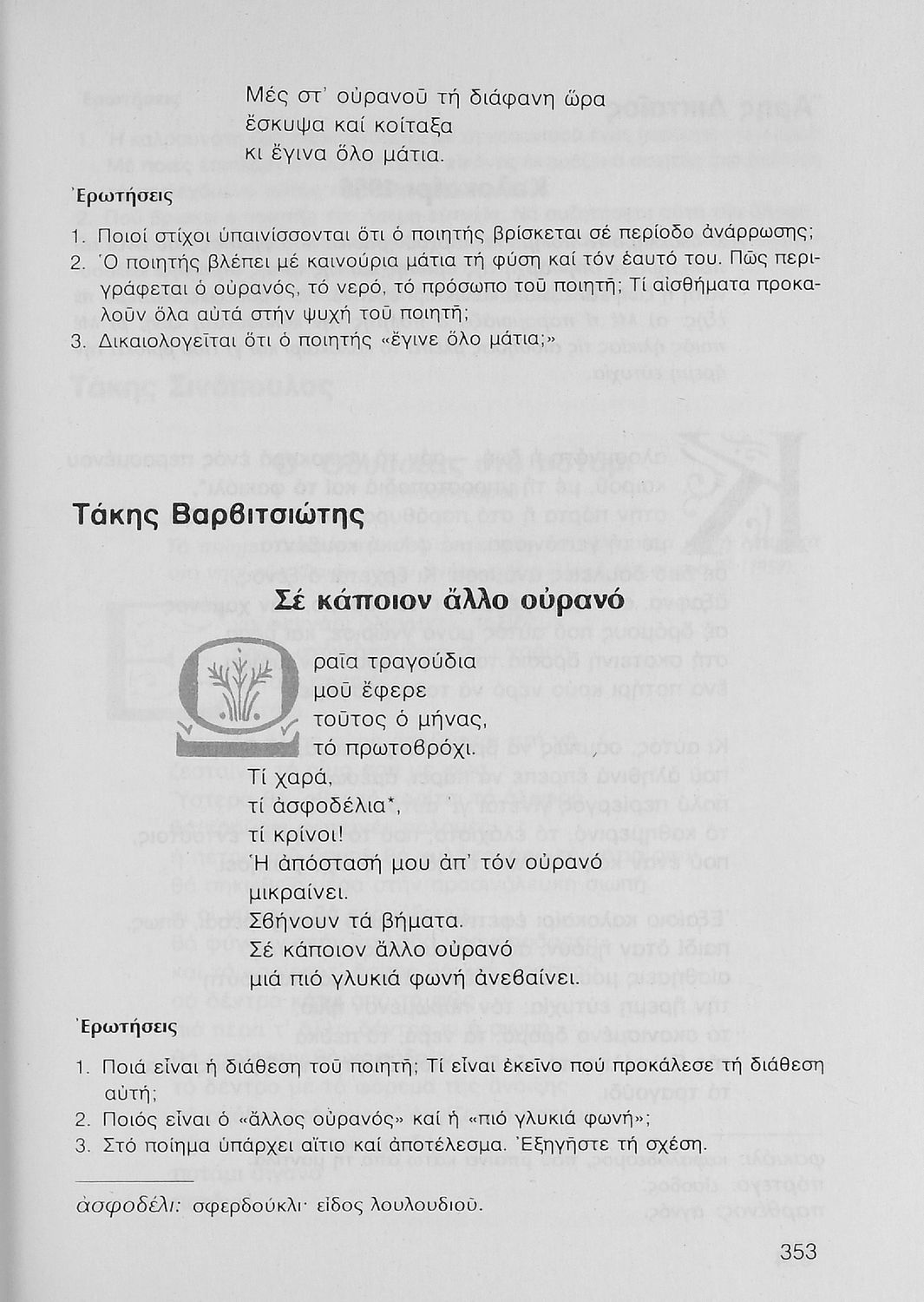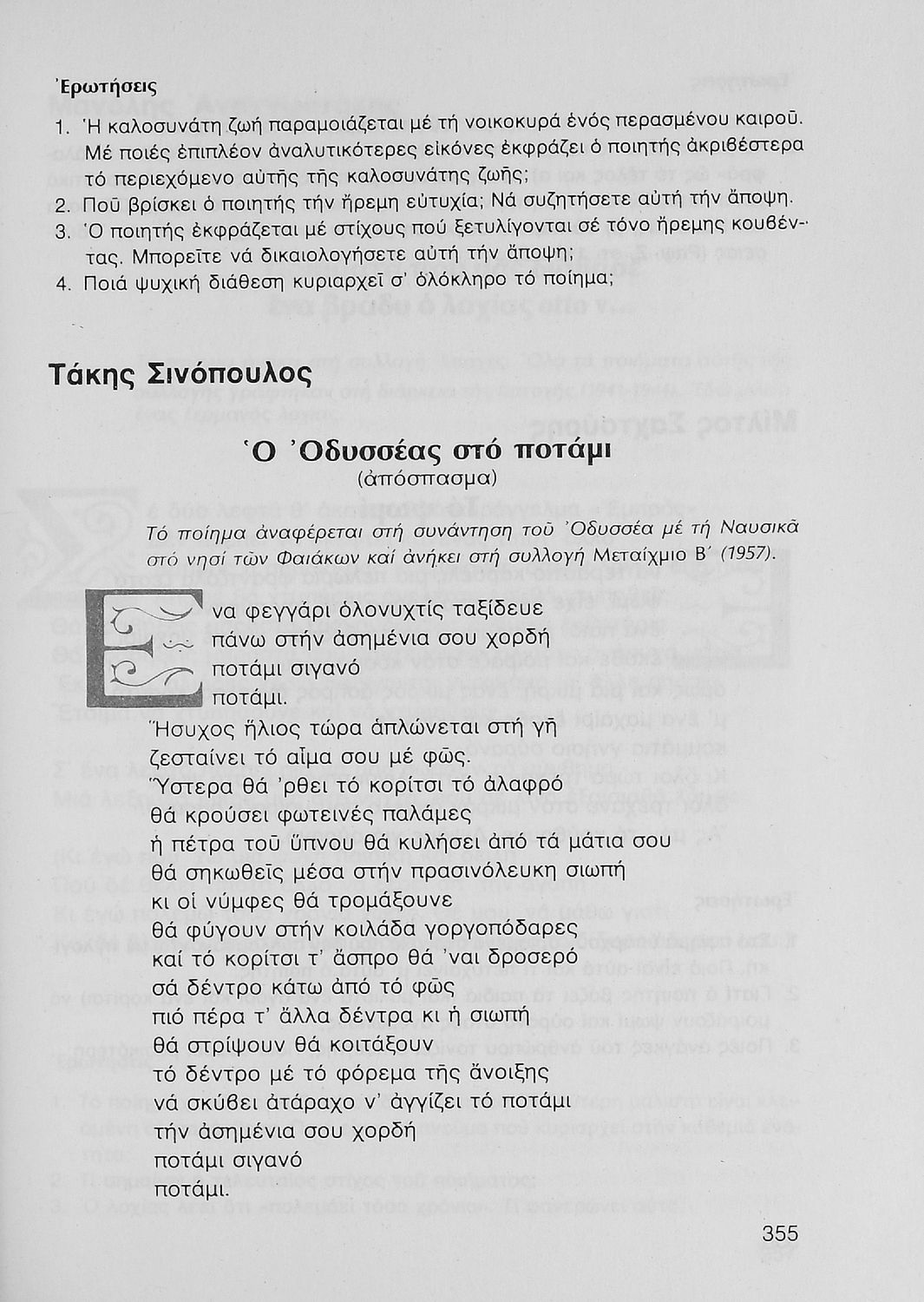 Σχολικό εγχειρίδιο Νέων Ελληνικών Γ΄ Γυμνασίου που περιλαμβάνει δημοτικά τραγούδια, και χαρακτηριστικά δείγματα της κρητικής λογοτεχνίας, της επτανησιακής και ρομαντικής σχολής, της Νέας Αθηναϊκής Σχολής και της νεότερης και μεταπολεμικής λογοτεχνίας. Περιέχει και έργα σύγχρονων ξένων συγγραφέων, βιογραφικά και εισαγωγικά σημειώματα.