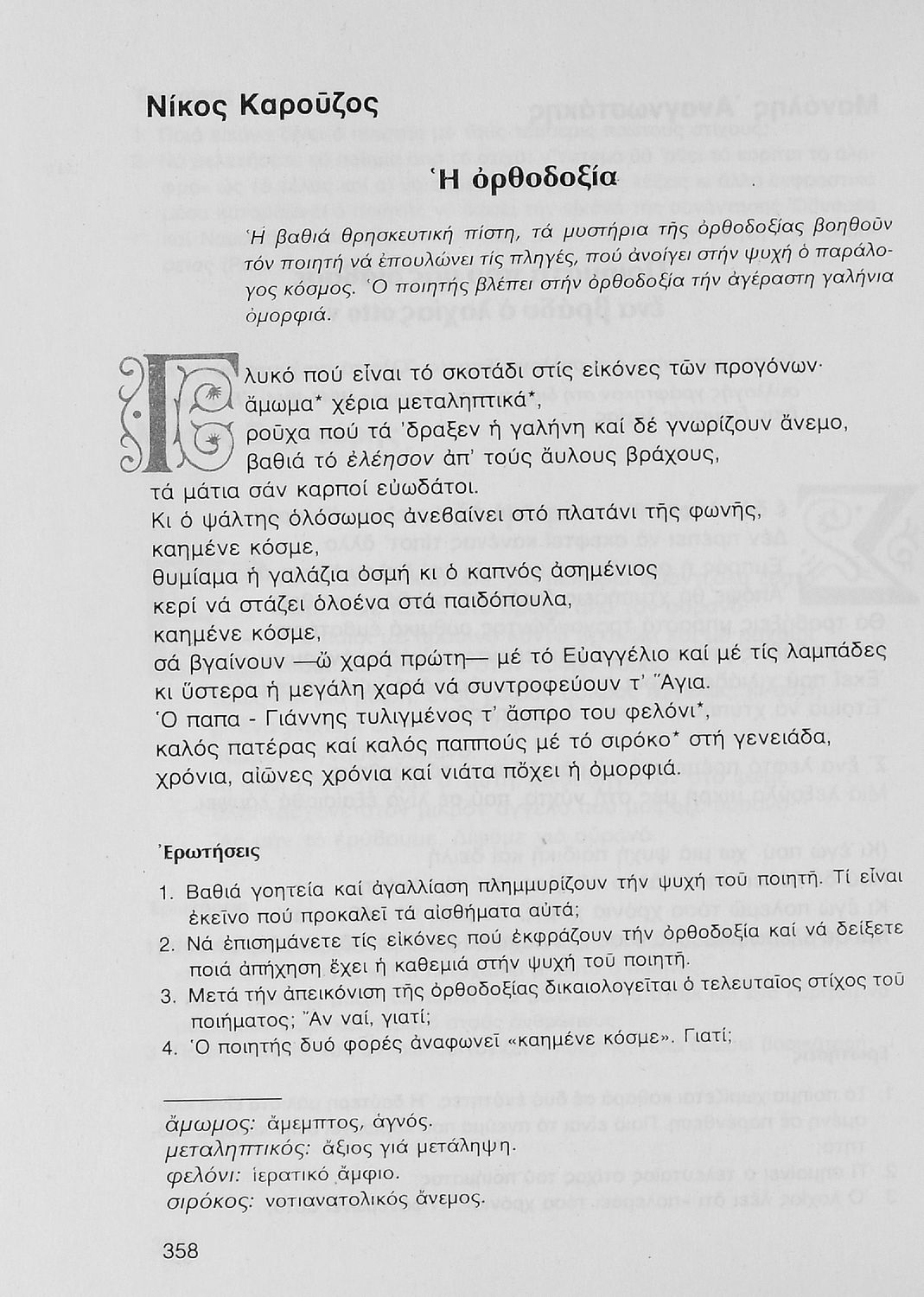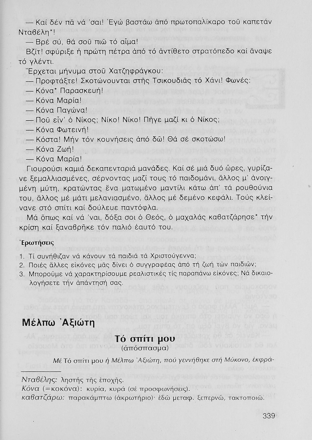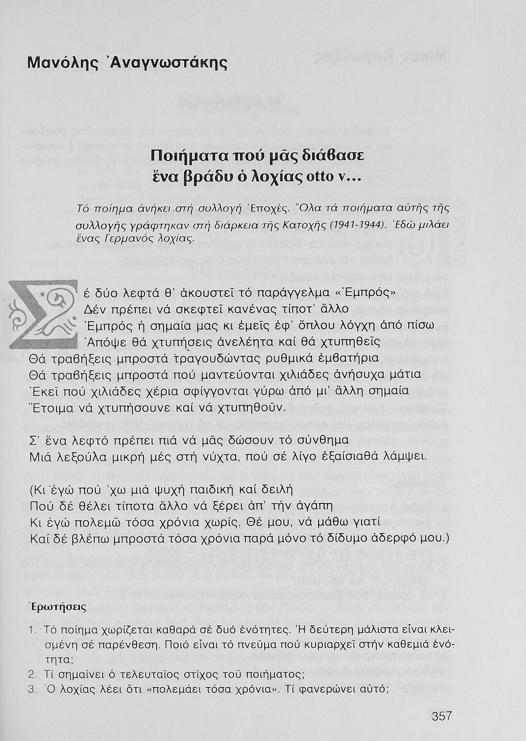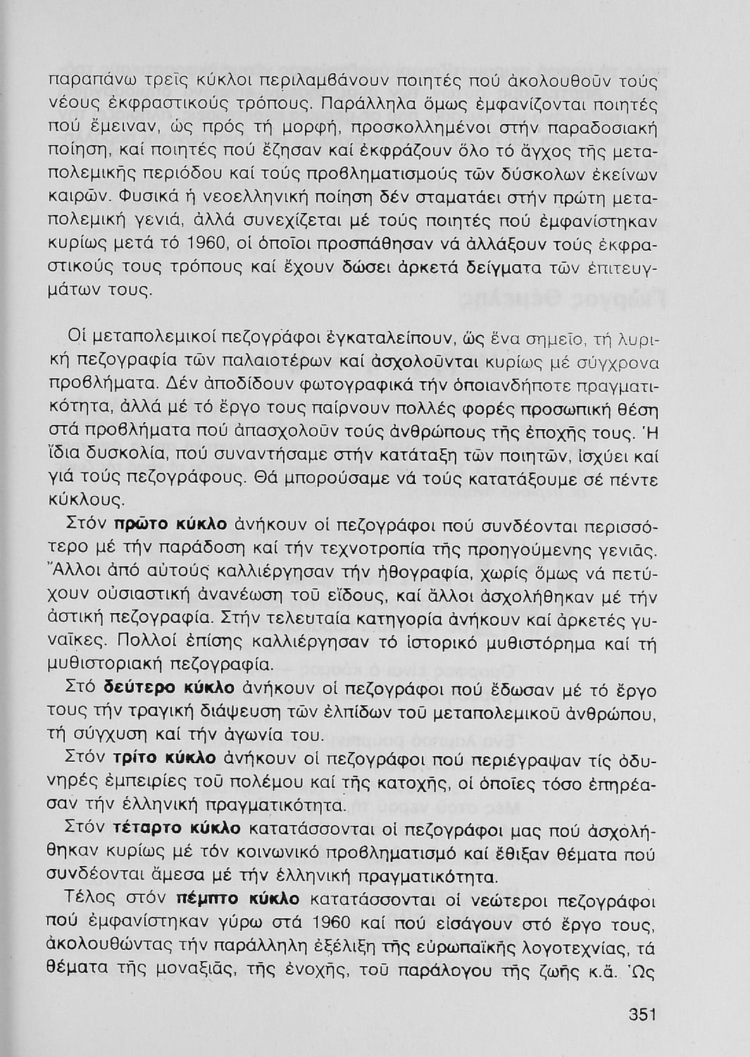 Σχολικό εγχειρίδιο Νέων Ελληνικών Γ΄ Γυμνασίου που περιλαμβάνει δημοτικά τραγούδια, και χαρακτηριστικά δείγματα της κρητικής λογοτεχνίας, της επτανησιακής και ρομαντικής σχολής, της Νέας Αθηναϊκής Σχολής και της νεότερης και μεταπολεμικής λογοτεχνίας. Περιέχει και έργα σύγχρονων ξένων συγγραφέων, βιογραφικά και εισαγωγικά σημειώματα.