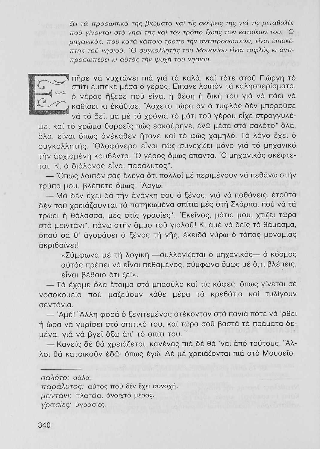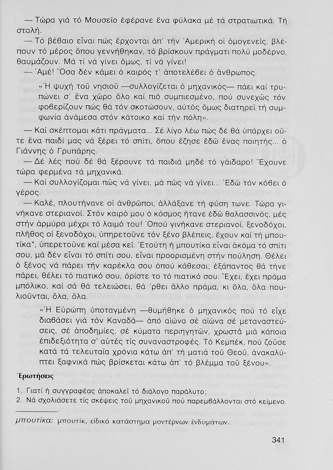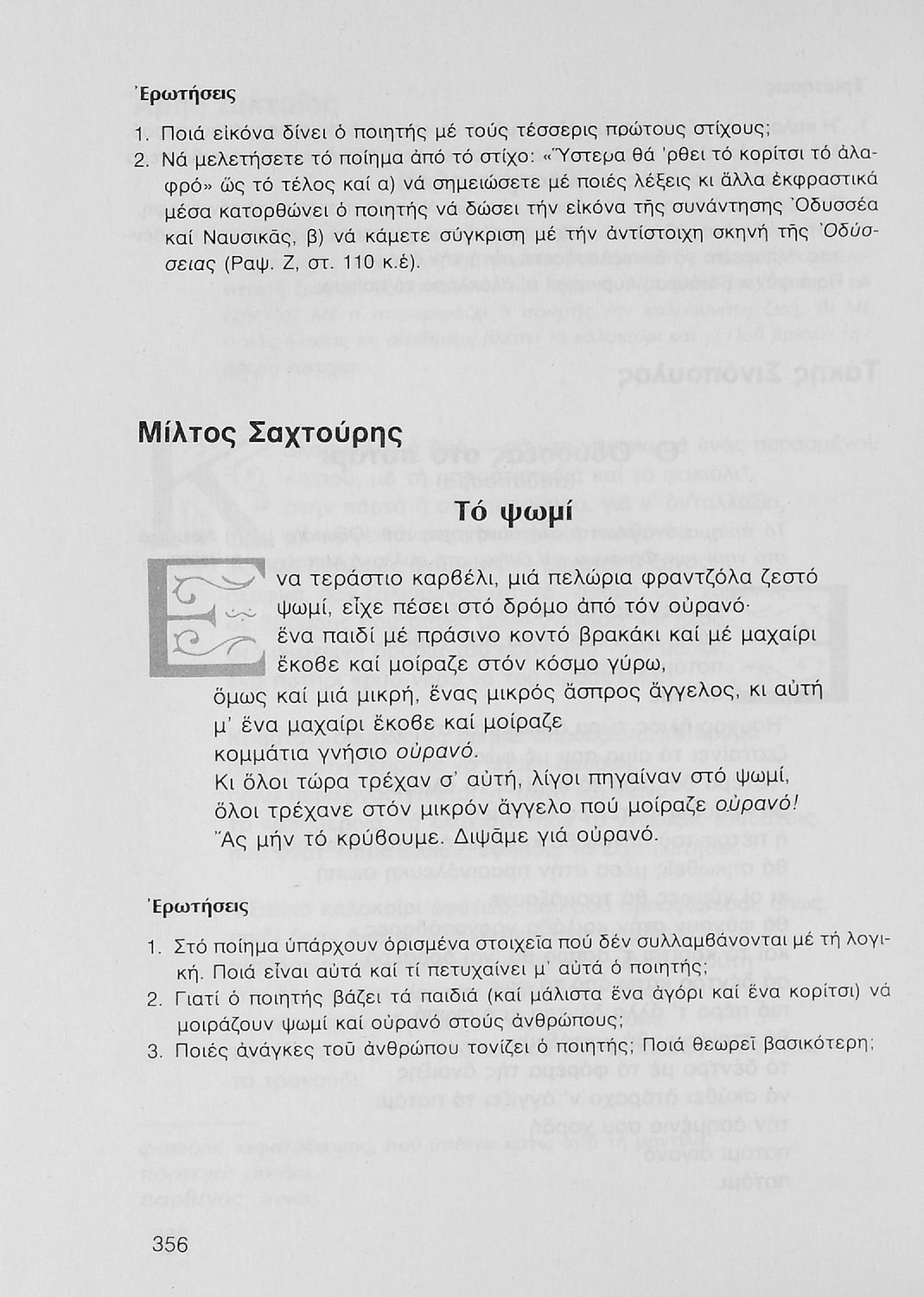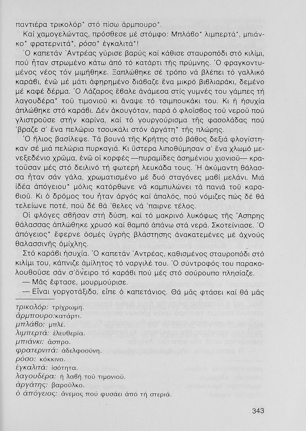 Σχολικό εγχειρίδιο Νέων Ελληνικών Γ΄ Γυμνασίου που περιλαμβάνει δημοτικά τραγούδια, και χαρακτηριστικά δείγματα της κρητικής λογοτεχνίας, της επτανησιακής και ρομαντικής σχολής, της Νέας Αθηναϊκής Σχολής και της νεότερης και μεταπολεμικής λογοτεχνίας. Περιέχει και έργα σύγχρονων ξένων συγγραφέων, βιογραφικά και εισαγωγικά σημειώματα.