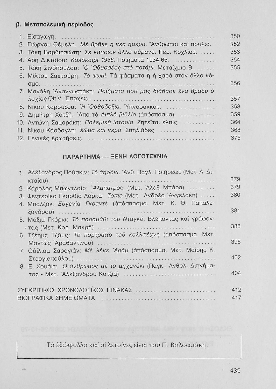 Σχολικό εγχειρίδιο Νέων Ελληνικών Γ΄ Γυμνασίου που περιλαμβάνει δημοτικά τραγούδια, και χαρακτηριστικά δείγματα της κρητικής λογοτεχνίας, της επτανησιακής και ρομαντικής σχολής, της Νέας Αθηναϊκής Σχολής και της νεότερης και μεταπολεμικής λογοτεχνίας. Περιέχει και έργα σύγχρονων ξένων συγγραφέων, βιογραφικά και εισαγωγικά σημειώματα.