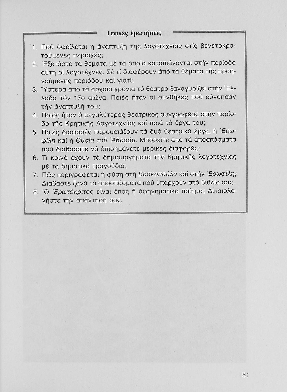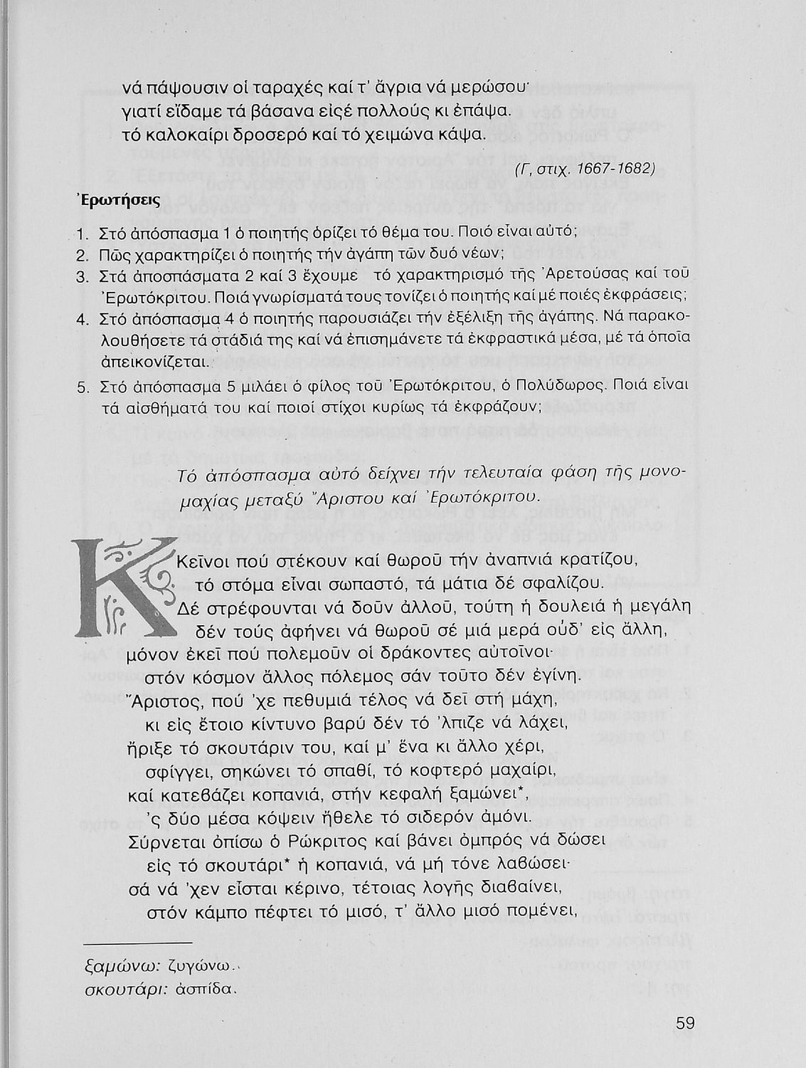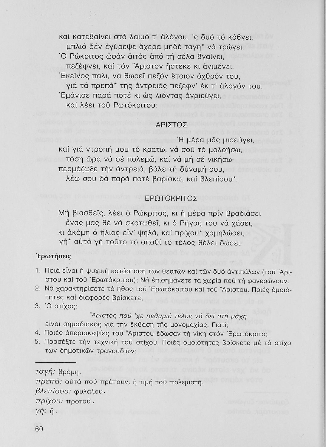 Σχολικό εγχειρίδιο Νέων Ελληνικών Γ΄ Γυμνασίου που περιλαμβάνει δημοτικά τραγούδια, και χαρακτηριστικά δείγματα της κρητικής λογοτεχνίας, της επτανησιακής και ρομαντικής σχολής, της Νέας Αθηναϊκής Σχολής και της νεότερης και μεταπολεμικής λογοτεχνίας. Περιέχει και έργα σύγχρονων ξένων συγγραφέων, βιογραφικά και εισαγωγικά σημειώματα.