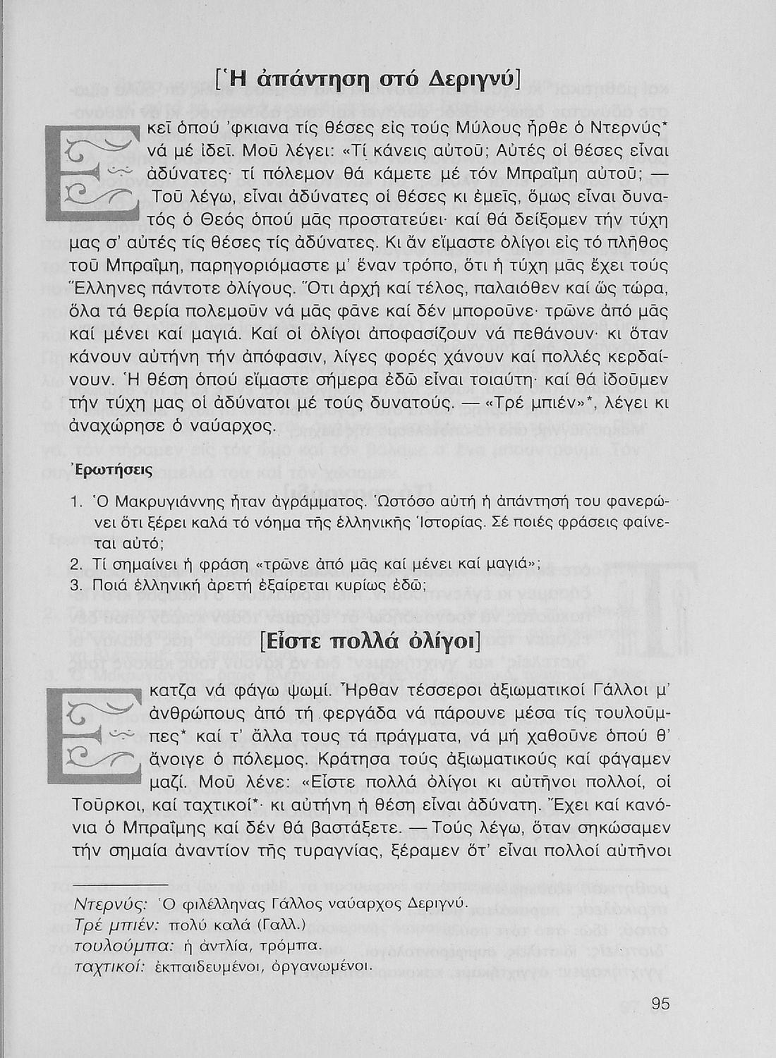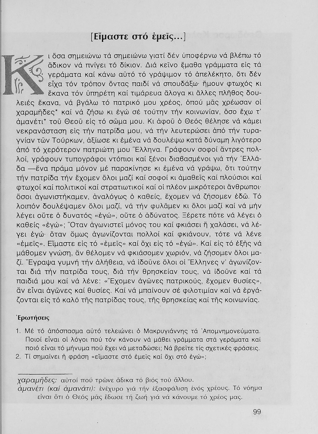 Σχολικό εγχειρίδιο Νέων Ελληνικών Α΄ Γυμνασίου που περιλαμβάνει δοκίμια, πεζά και ποιήματα Ελλήνων συγγραφέων και δημοτικά τραγούδια εμπνευσμένα από τη θρησκευτική, εθνική και κοινωνική ζωή, τη "δοκιμασία της ...