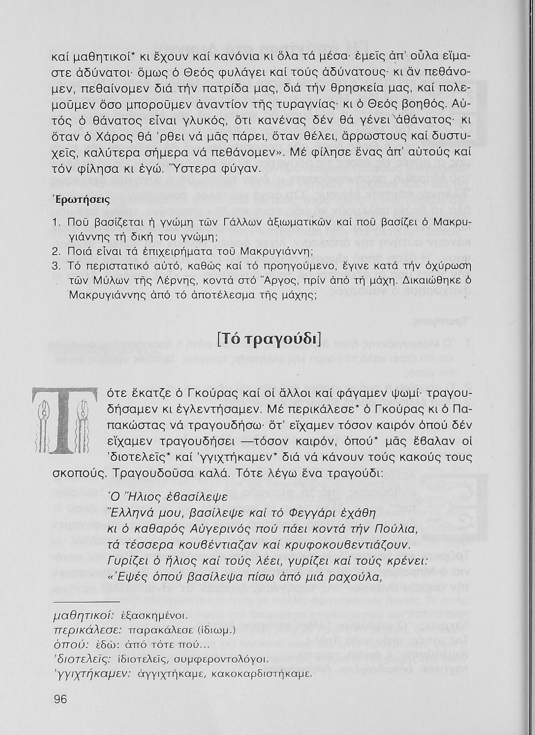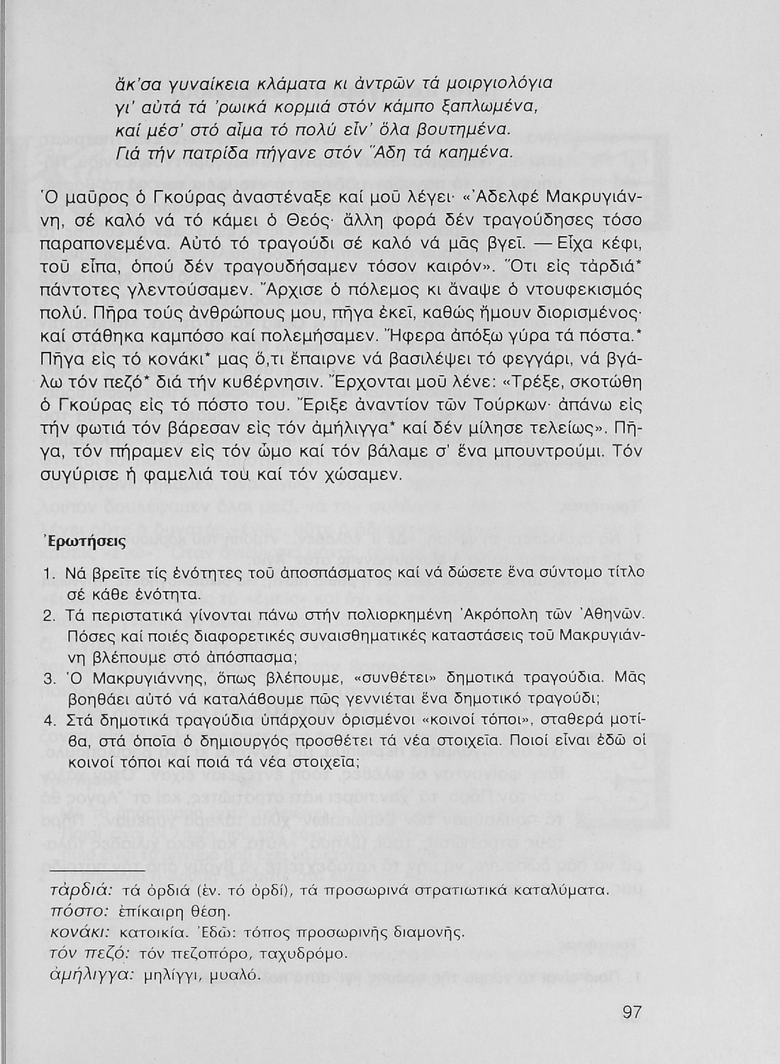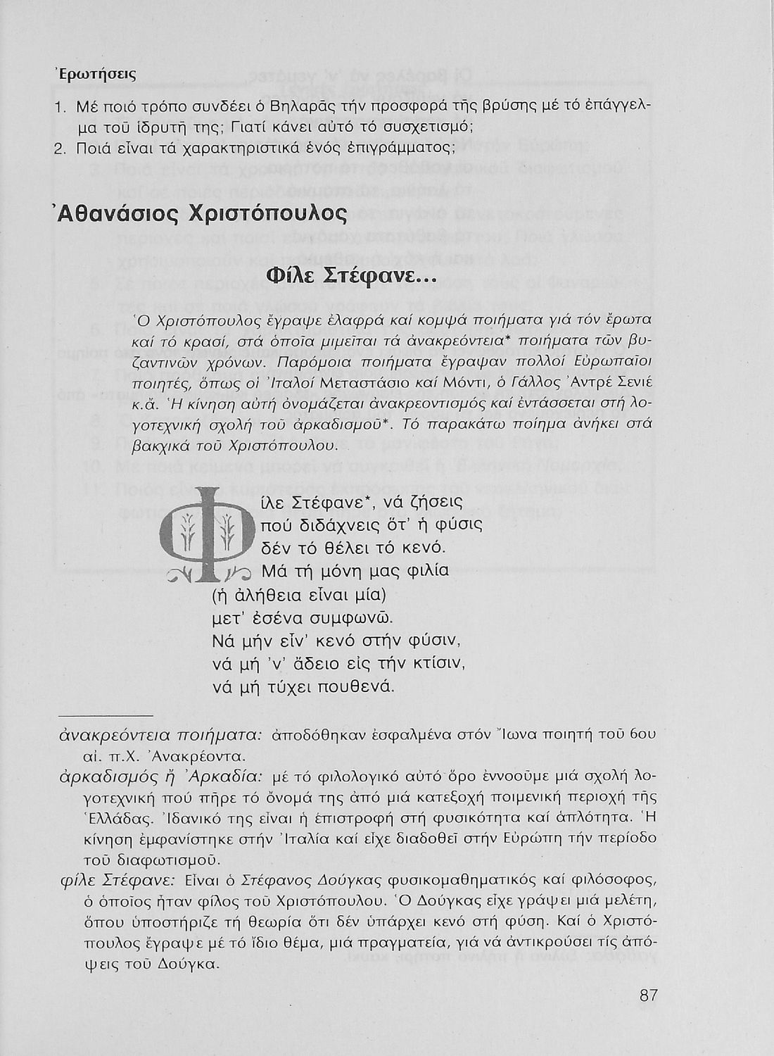 Σχολικό εγχειρίδιο Νέων Ελληνικών Γ΄ Γυμνασίου που περιλαμβάνει δημοτικά τραγούδια, και χαρακτηριστικά δείγματα της κρητικής λογοτεχνίας, της επτανησιακής και ρομαντικής σχολής, της Νέας Αθηναϊκής Σχολής και της νεότερης και μεταπολεμικής λογοτεχνίας. Περιέχει και έργα σύγχρονων ξένων συγγραφέων, βιογραφικά και εισαγωγικά σημειώματα.