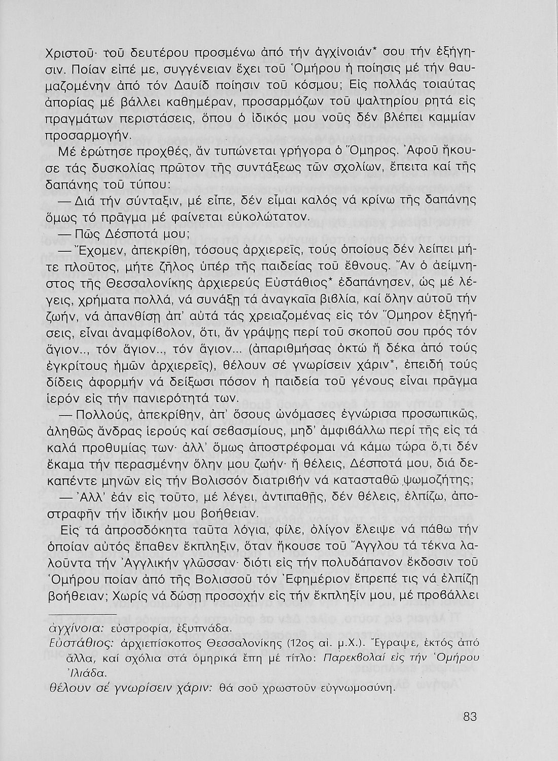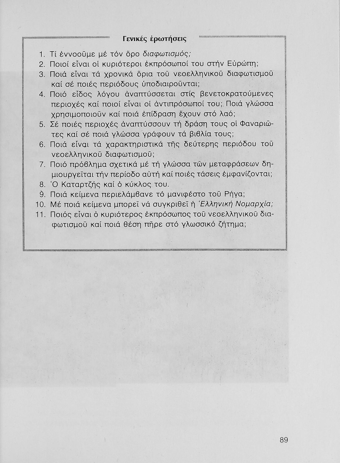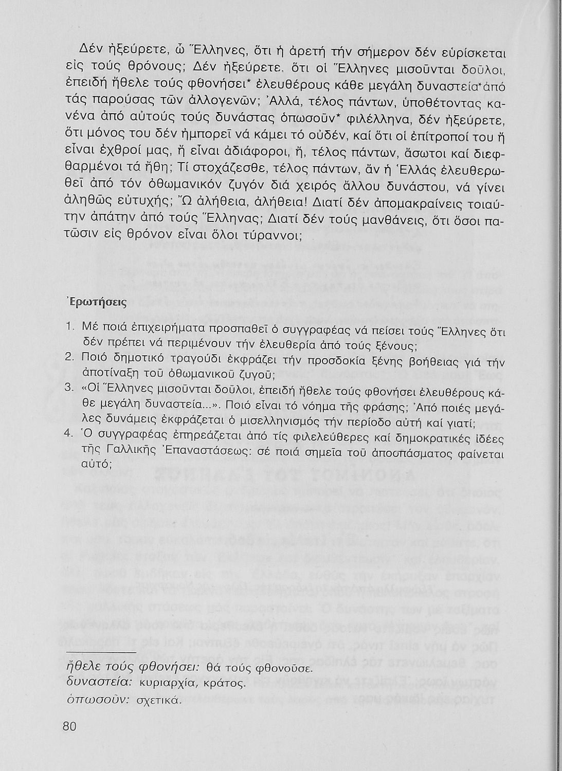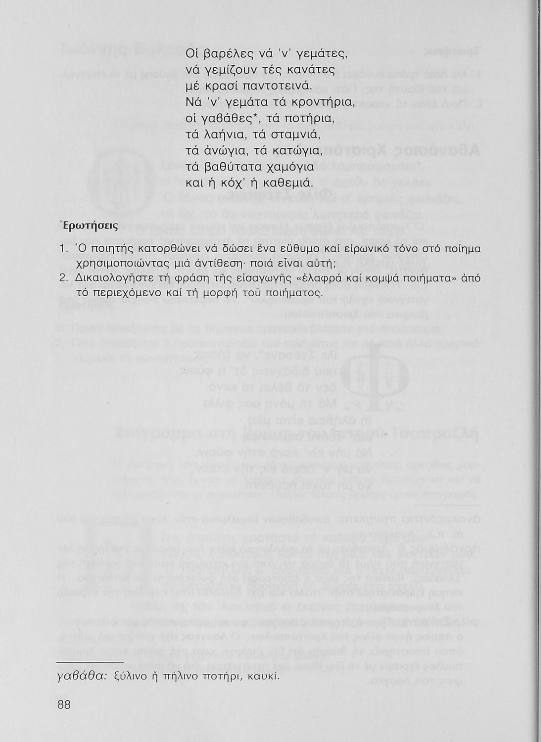Σχολικό εγχειρίδιο Νέων Ελληνικών Γ΄ Γυμνασίου που περιλαμβάνει δημοτικά τραγούδια, και χαρακτηριστικά δείγματα της κρητικής λογοτεχνίας, της επτανησιακής και ρομαντικής σχολής, της Νέας Αθηναϊκής Σχολής και της νεότερης και μεταπολεμικής λογοτεχνίας. Περιέχει και έργα σύγχρονων ξένων συγγραφέων, βιογραφικά και εισαγωγικά σημειώματα.