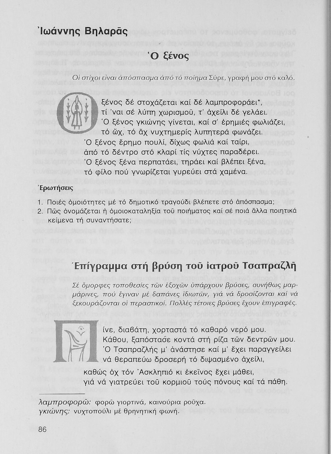 Σχολικό εγχειρίδιο Νέων Ελληνικών Β' Γυμνασίου που περιέχει δημοτικά τραγούδια, πεζά, δοκίμια και ποιήματα σύγχρονων Ελλήνων συγγραφέων και είναι χωρισμένο σε θεματικές ενότητες όπως η πόλη και η ύπαιθρος, η ...