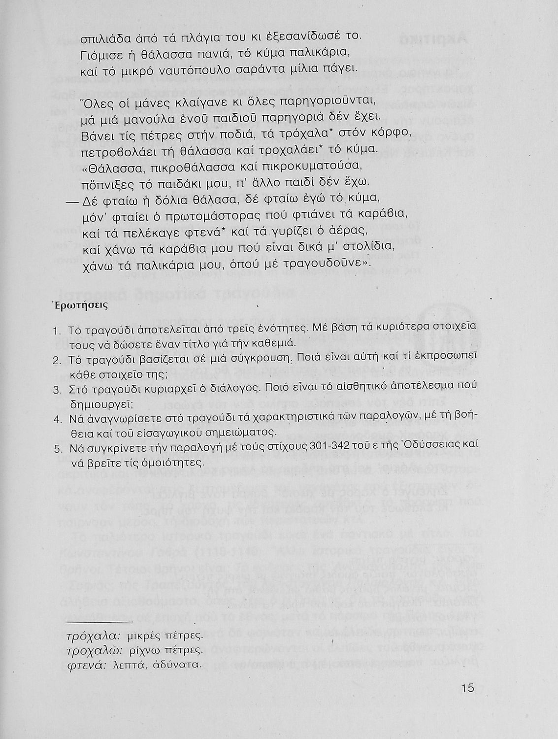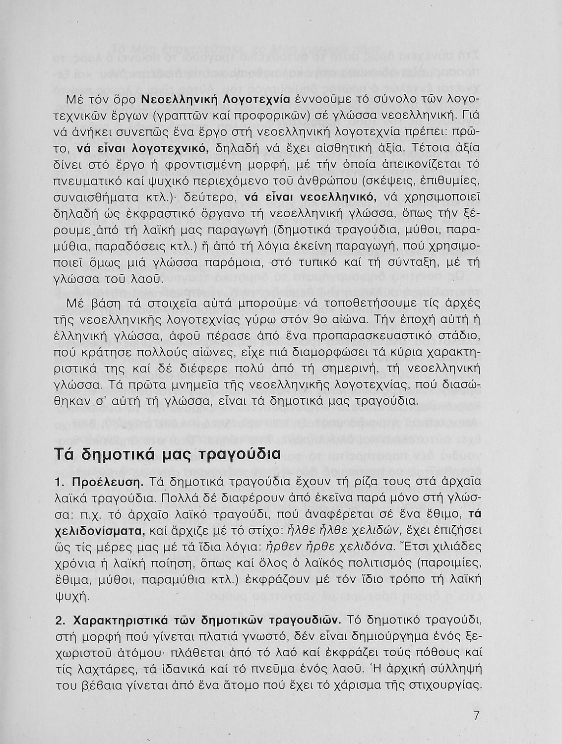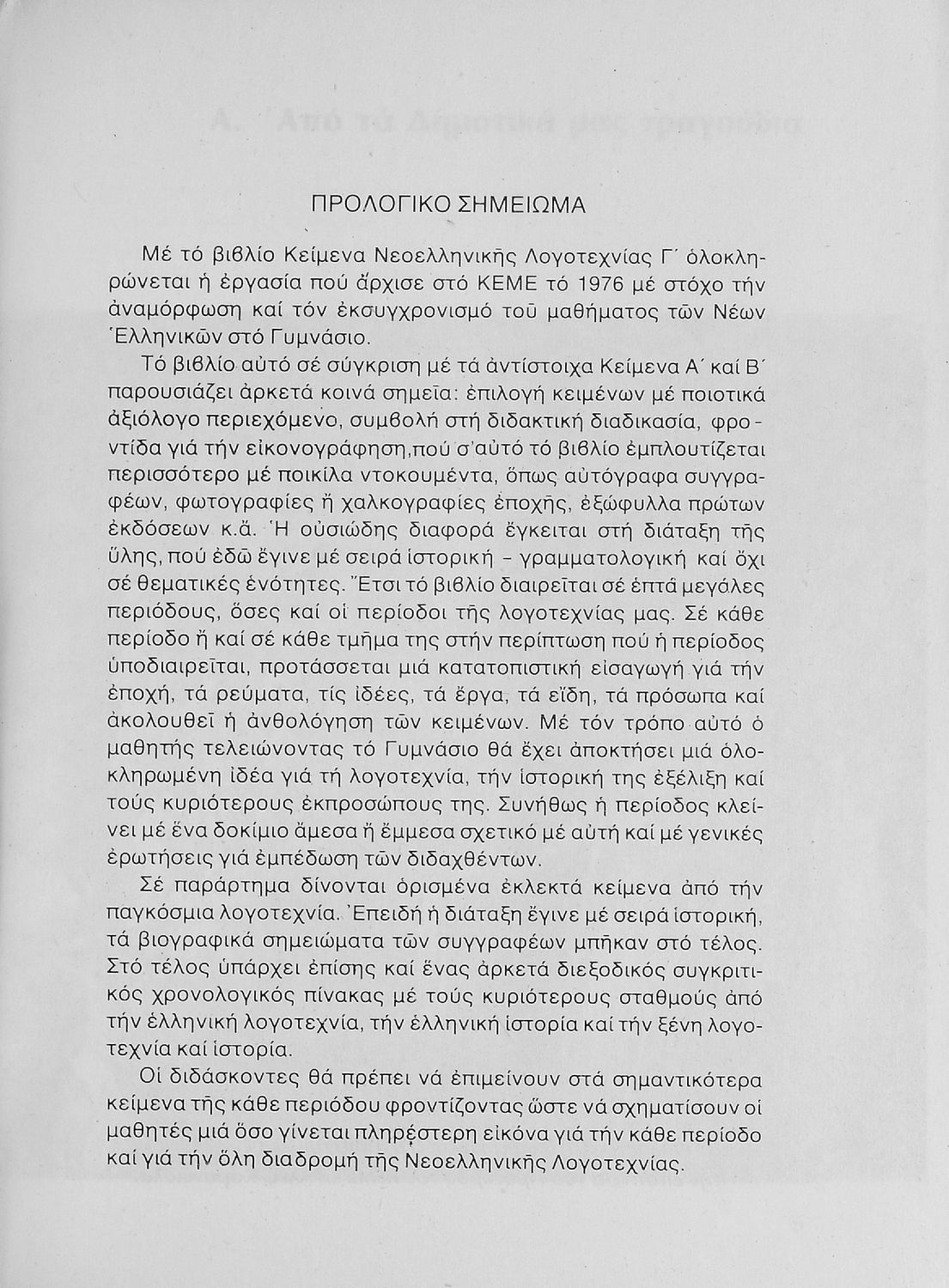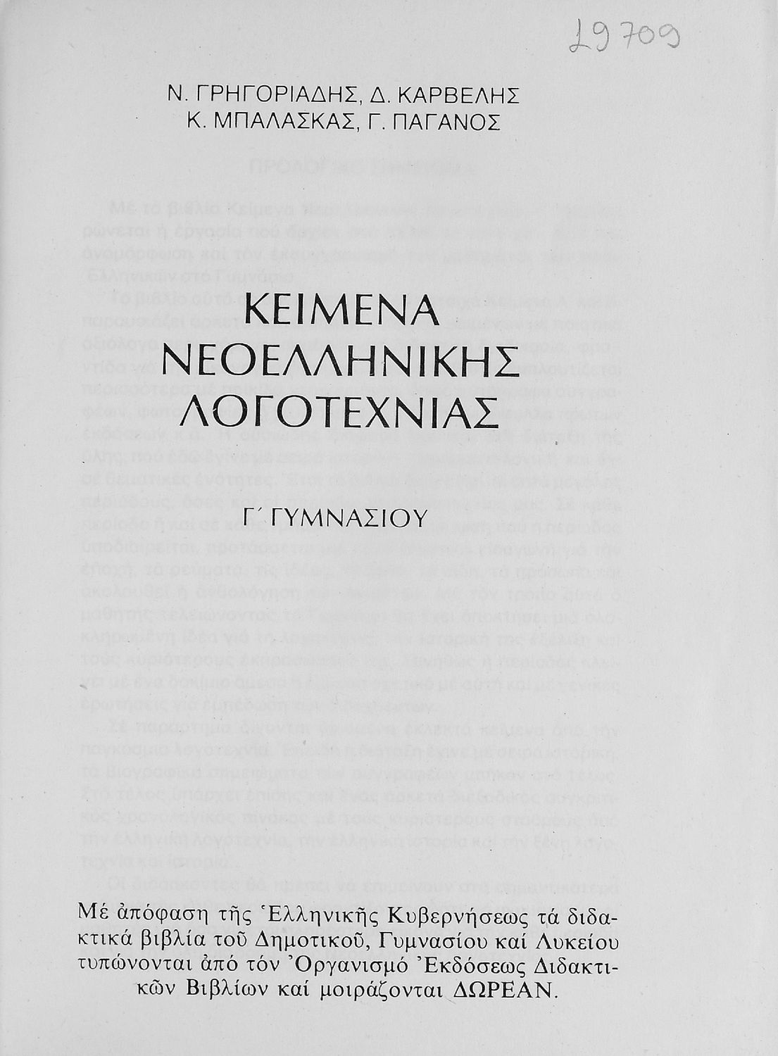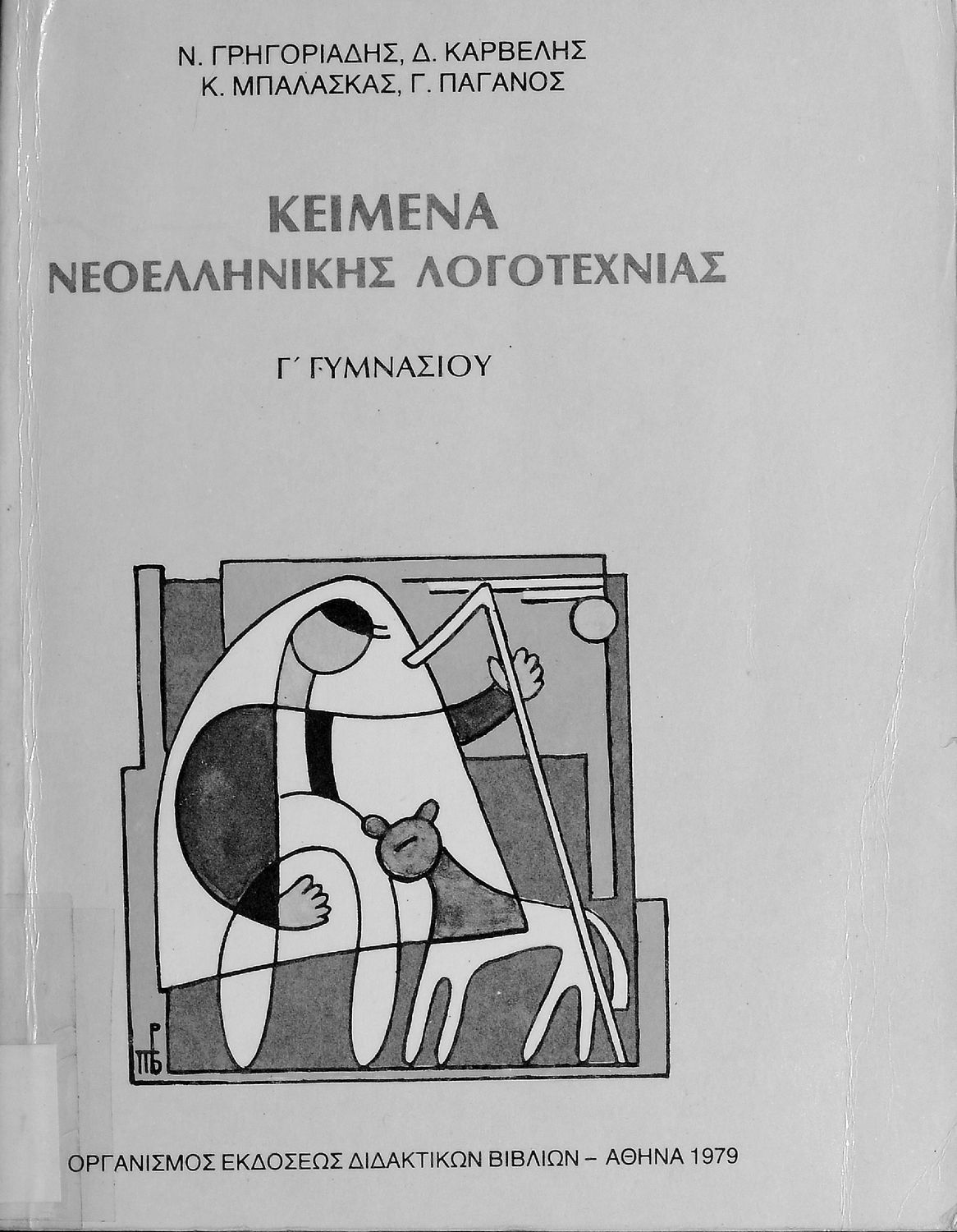 Σχολικό εγχειρίδιο Νέων Ελληνικών Γ΄ Γυμνασίου που περιλαμβάνει δημοτικά τραγούδια, και χαρακτηριστικά δείγματα της κρητικής λογοτεχνίας, της επτανησιακής και ρομαντικής σχολής, της Νέας Αθηναϊκής Σχολής και της νεότερης και μεταπολεμικής λογοτεχνίας. Περιέχει και έργα σύγχρονων ξένων συγγραφέων, βιογραφικά και εισαγωγικά σημειώματα.
