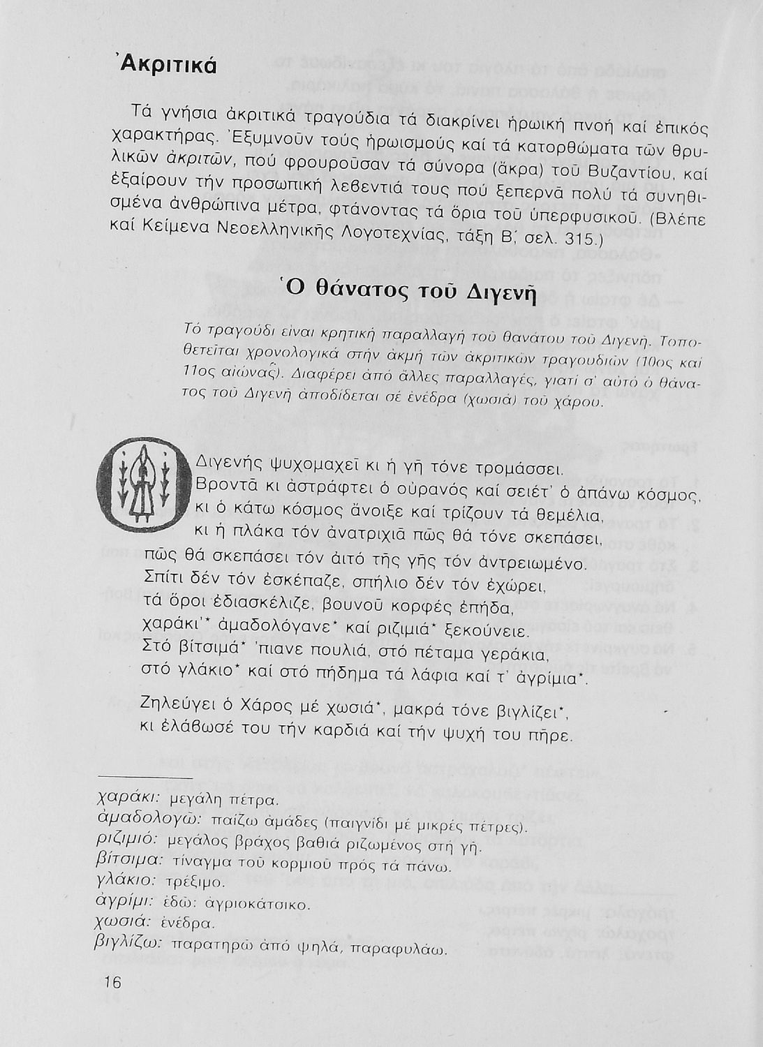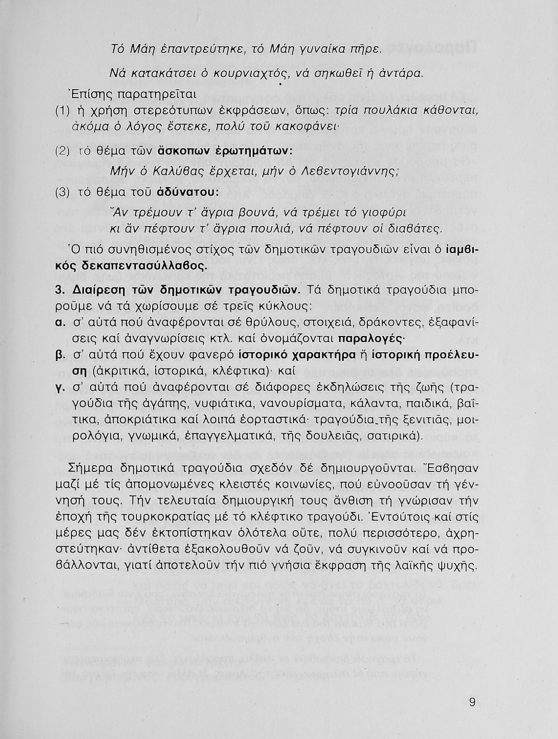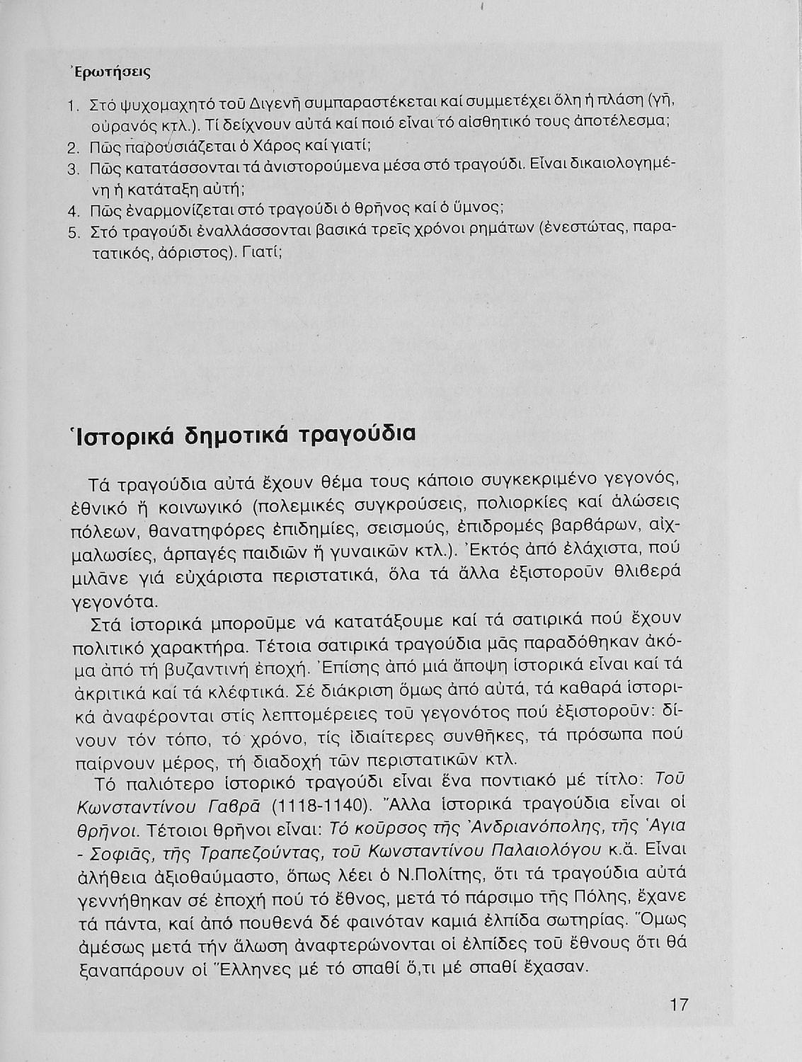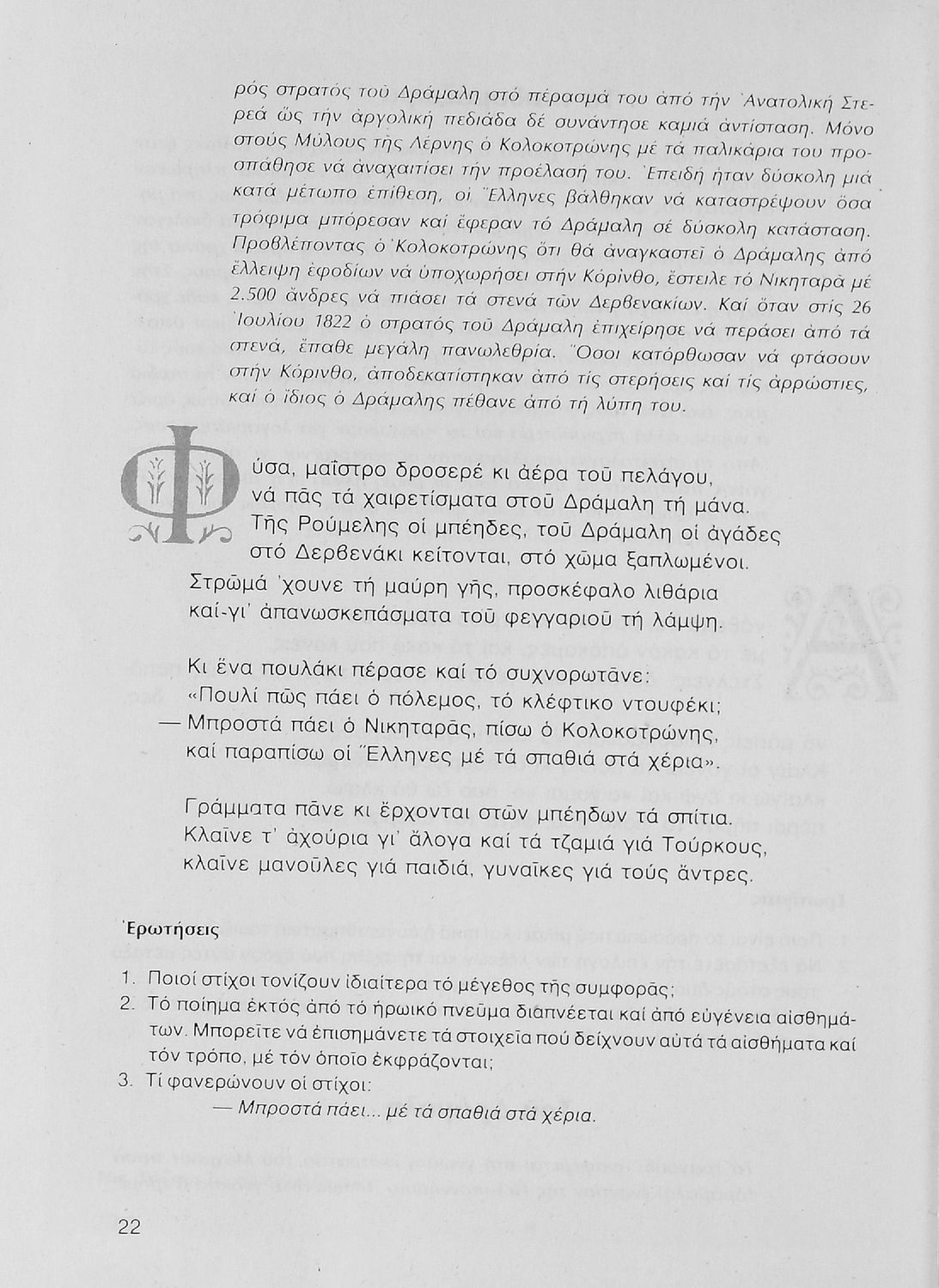 Σχολικό εγχειρίδιο Νέων Ελληνικών Γ΄ Γυμνασίου που περιλαμβάνει δημοτικά τραγούδια, και χαρακτηριστικά δείγματα της κρητικής λογοτεχνίας, της επτανησιακής και ρομαντικής σχολής, της Νέας Αθηναϊκής Σχολής και της νεότερης και μεταπολεμικής λογοτεχνίας. Περιέχει και έργα σύγχρονων ξένων συγγραφέων, βιογραφικά και εισαγωγικά σημειώματα.