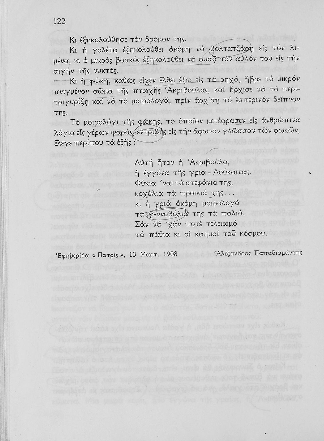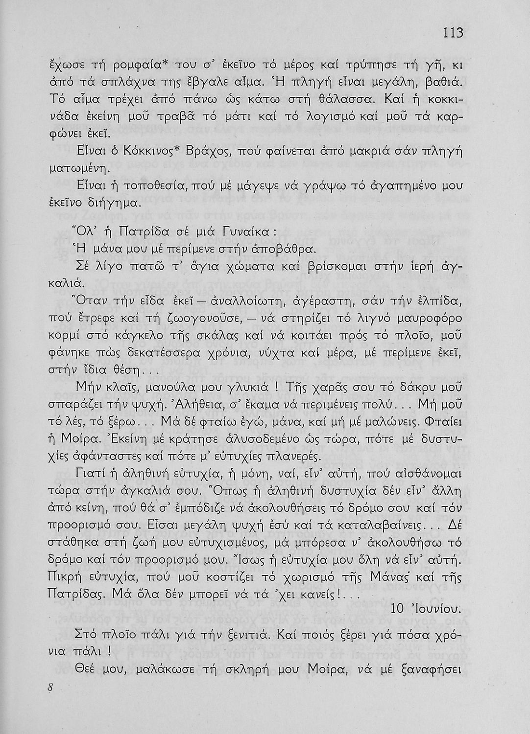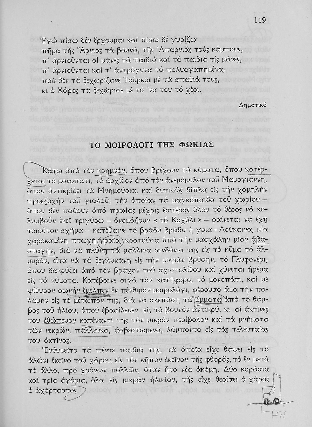 Σχολικό εγχειρίδιο Νέων Ελληνικών της Γ΄ Γυμνασίου με κείμενα και ποιήματα από το πρόσφατο και παλαιότερο ιστορικό παρελθόν της χώρας καθώς και από τη θρησκευτική και κοινωνική ζωή του τόπου και την οργάνωση του κράτους. Σχόλια και σχέδια της μαθήτριας στις σελίδες του βιβλίου. Στο τέλος του βιβλίου υπάρχει λεξιλόγιο και βιογραφίες των συγγραφέων.