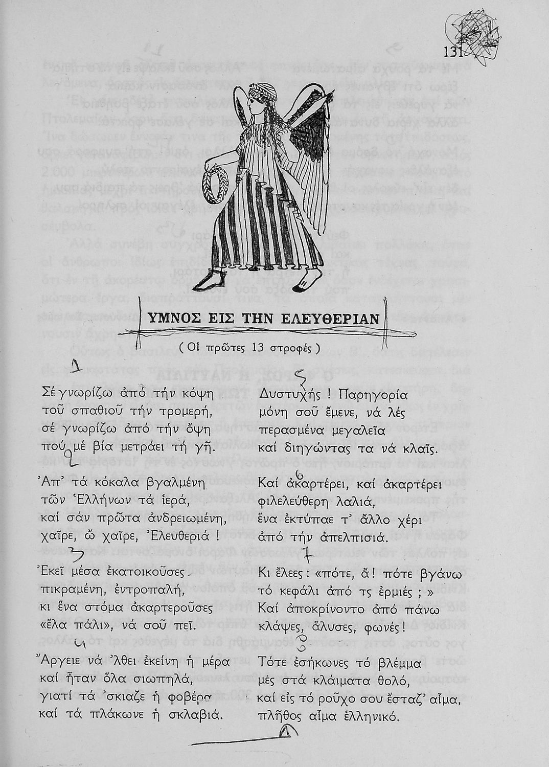 Σχολικό εγχειρίδιο Νέων Ελληνικών της Γ΄ Γυμνασίου με κείμενα και ποιήματα από το πρόσφατο και παλαιότερο ιστορικό παρελθόν της χώρας καθώς και από τη θρησκευτική και κοινωνική ζωή του τόπου και την οργάνωση του κράτους. Σχόλια και σχέδια της μαθήτριας στις σελίδες του βιβλίου. Στο τέλος του βιβλίου υπάρχει λεξιλόγιο και βιογραφίες των συγγραφέων.