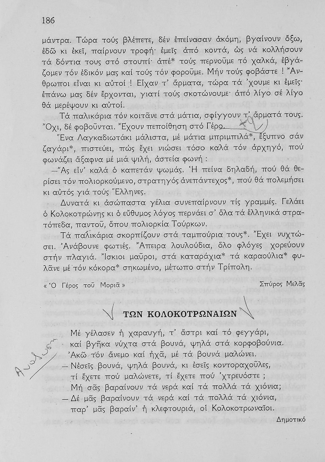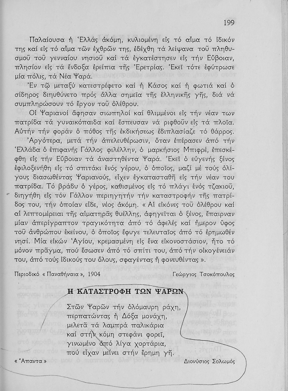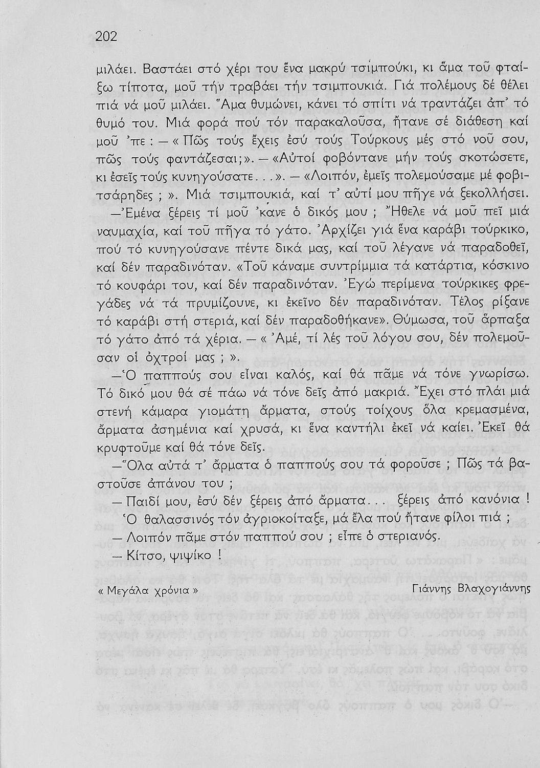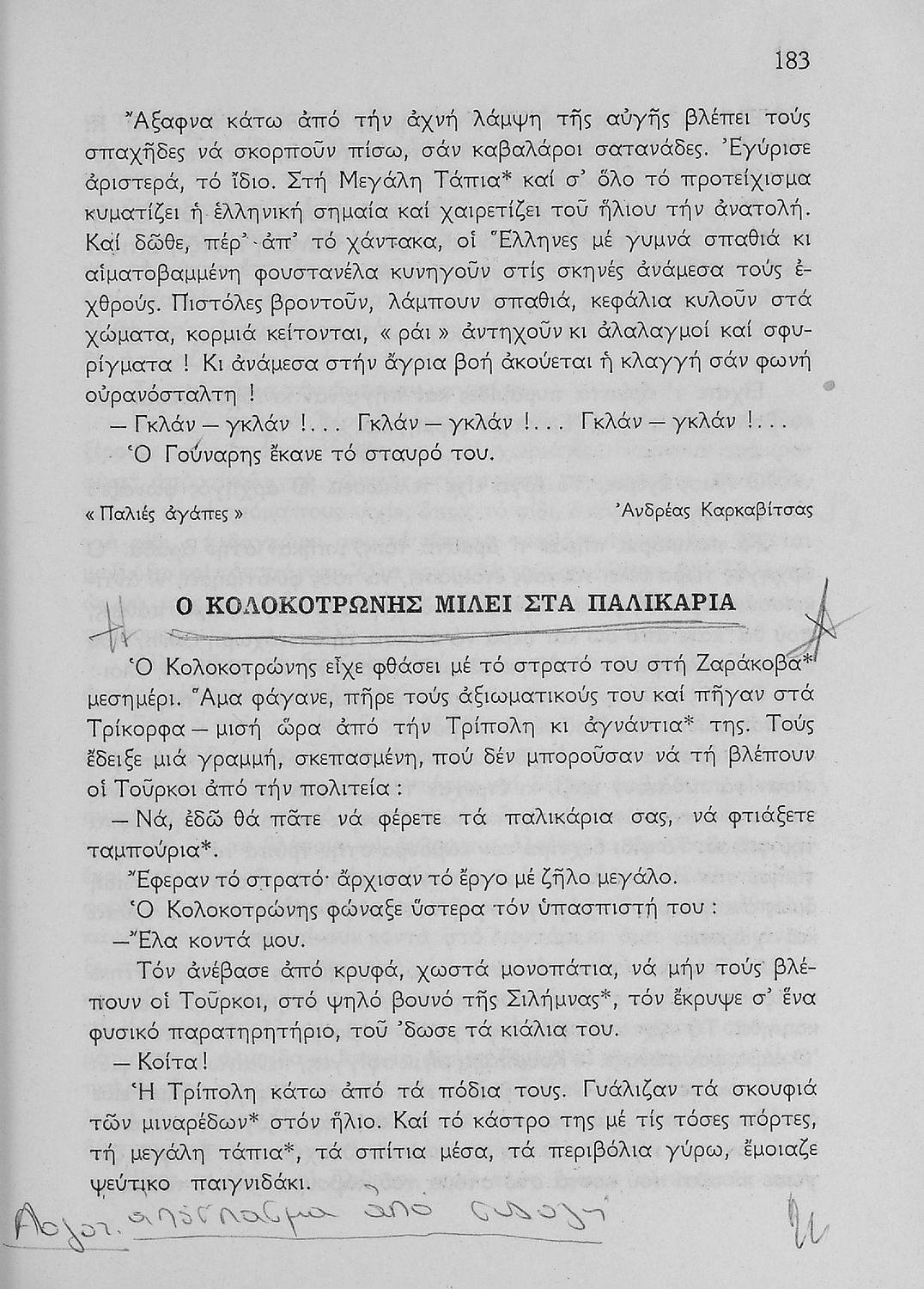 Σχολικό εγχειρίδιο Νέων Ελληνικών της Γ΄ Γυμνασίου με κείμενα και ποιήματα από το πρόσφατο και παλαιότερο ιστορικό παρελθόν της χώρας καθώς και από τη θρησκευτική και κοινωνική ζωή του τόπου και την οργάνωση του κράτους. Σχόλια και σχέδια της μαθήτριας στις σελίδες του βιβλίου. Στο τέλος του βιβλίου υπάρχει λεξιλόγιο και βιογραφίες των συγγραφέων.