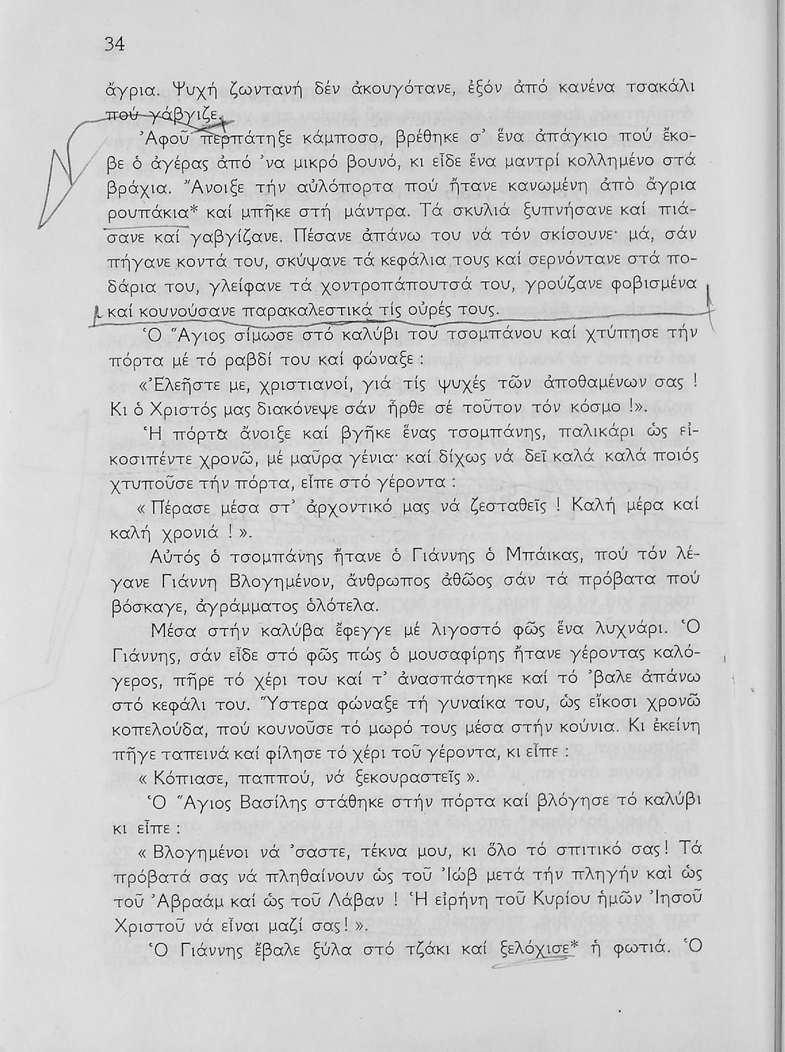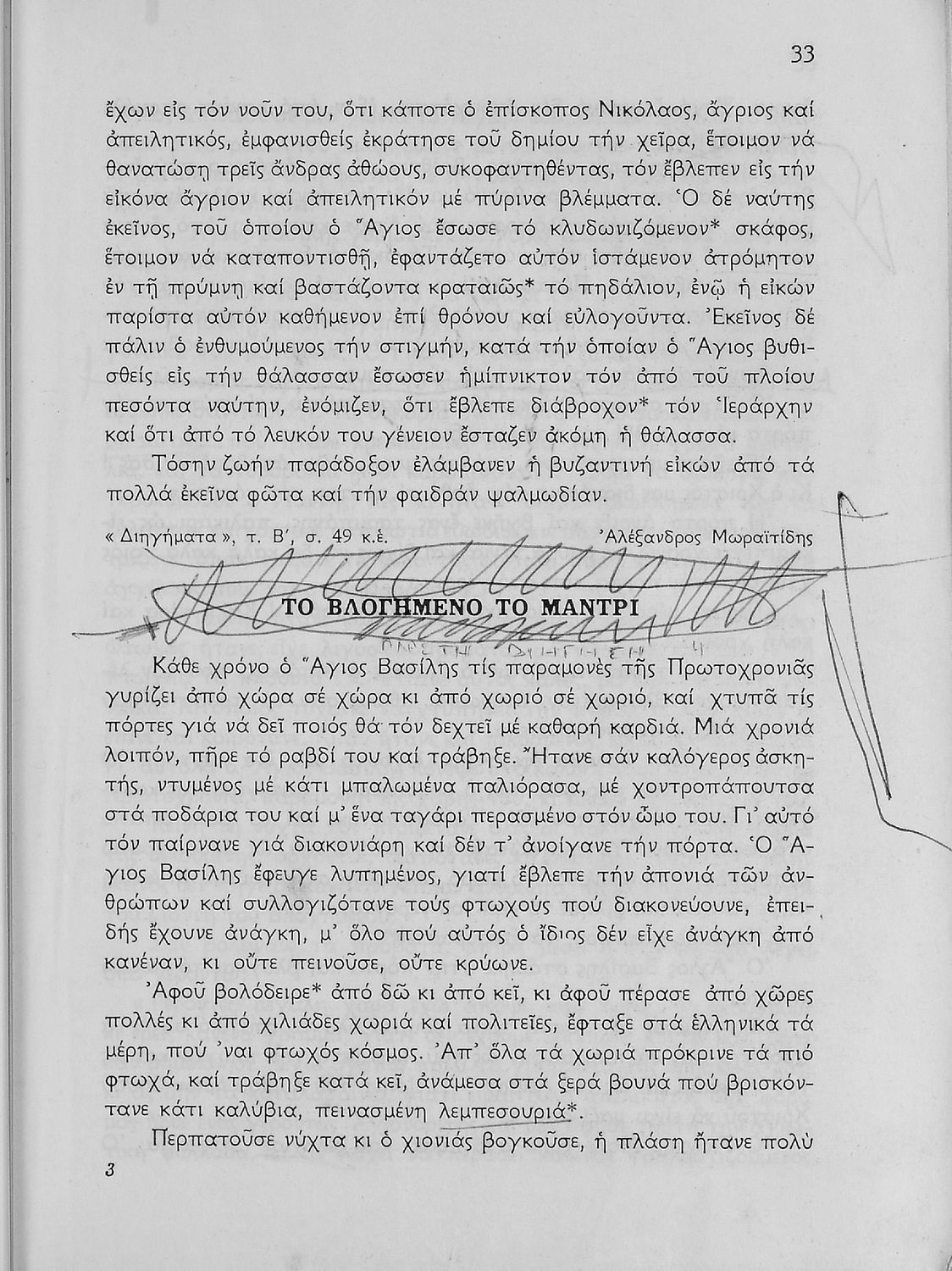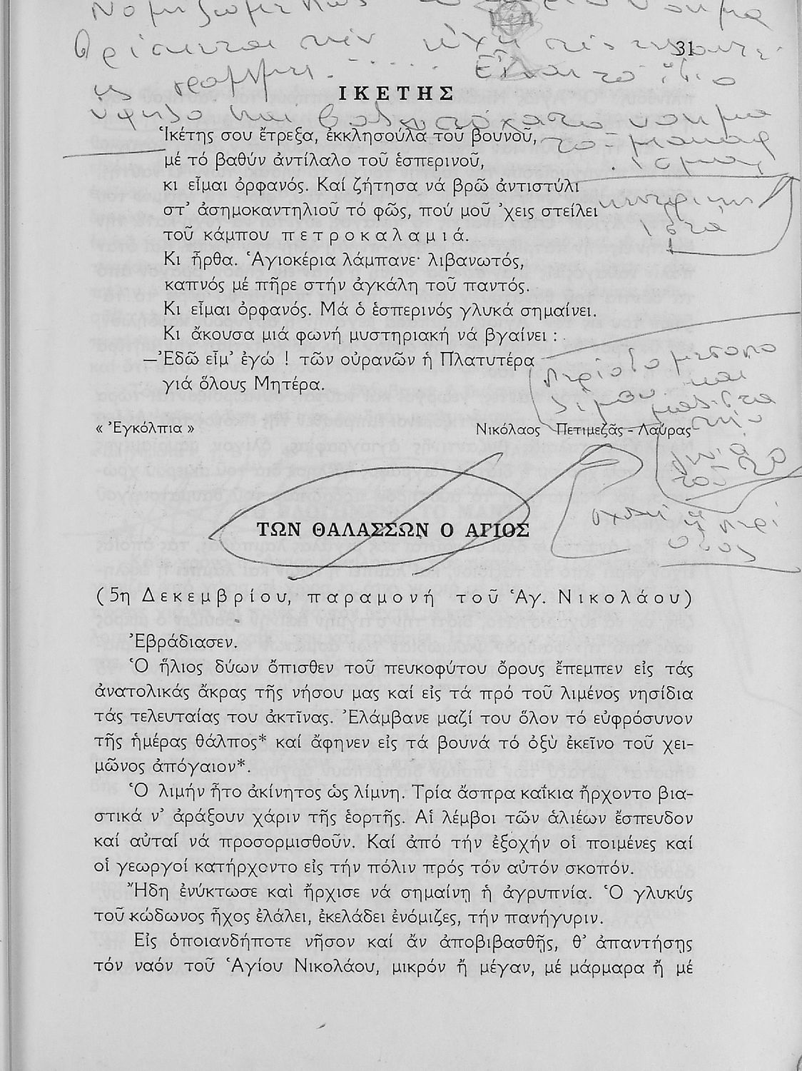 Σχολικό εγχειρίδιο Νέων Ελληνικών της Γ΄ Γυμνασίου με κείμενα και ποιήματα από το πρόσφατο και παλαιότερο ιστορικό παρελθόν της χώρας καθώς και από τη θρησκευτική και κοινωνική ζωή του τόπου και την οργάνωση του κράτους. Σχόλια και σχέδια της μαθήτριας στις σελίδες του βιβλίου. Στο τέλος του βιβλίου υπάρχει λεξιλόγιο και βιογραφίες των συγγραφέων.