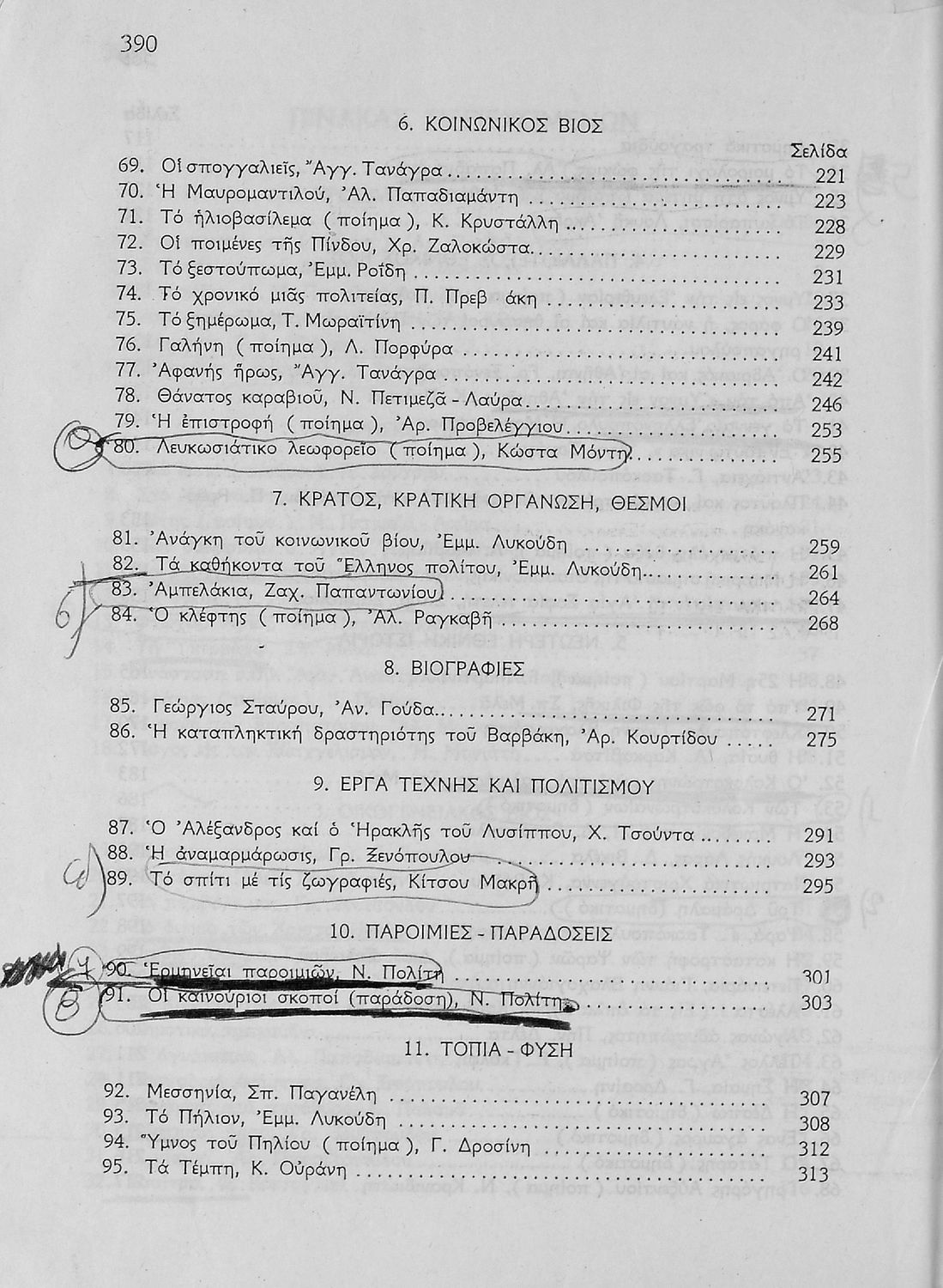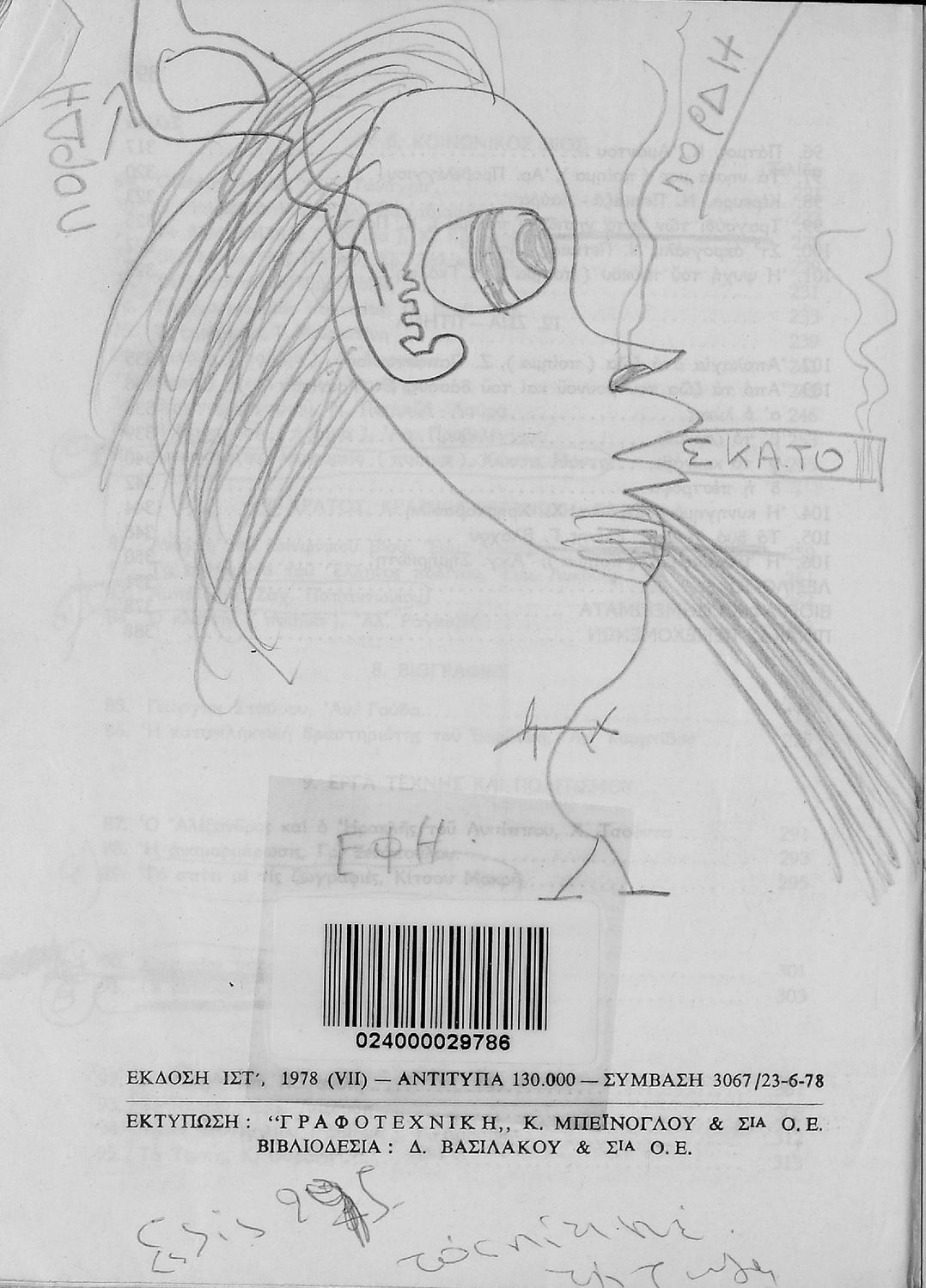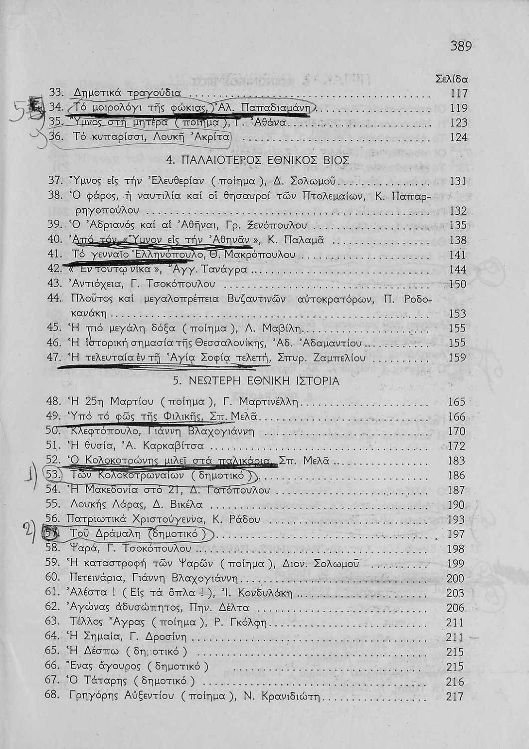 Σχολικό εγχειρίδιο Νέων Ελληνικών της Γ΄ Γυμνασίου με κείμενα και ποιήματα από το πρόσφατο και παλαιότερο ιστορικό παρελθόν της χώρας καθώς και από τη θρησκευτική και κοινωνική ζωή του τόπου και την οργάνωση του κράτους. Σχόλια και σχέδια της μαθήτριας στις σελίδες του βιβλίου. Στο τέλος του βιβλίου υπάρχει λεξιλόγιο και βιογραφίες των συγγραφέων.
