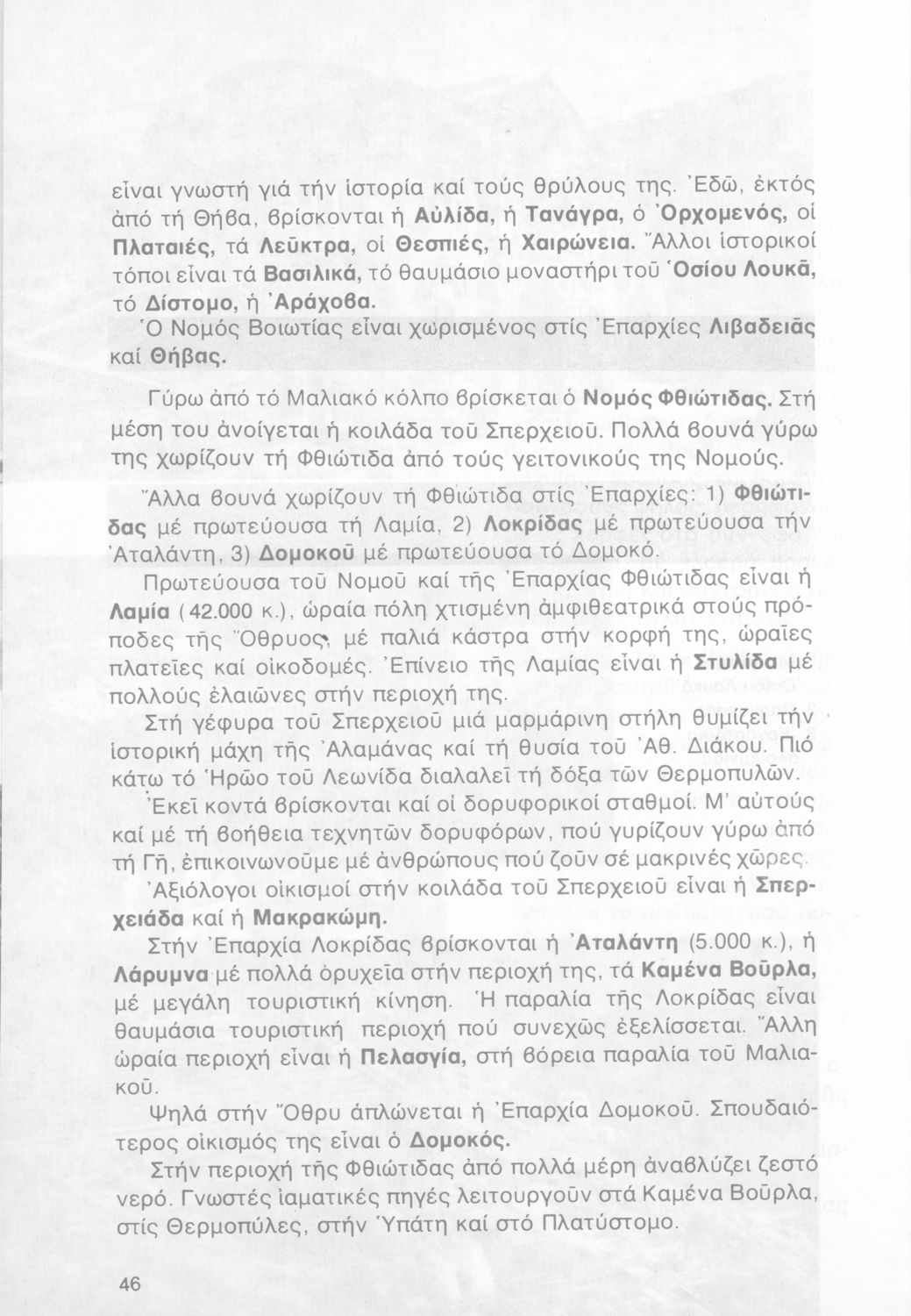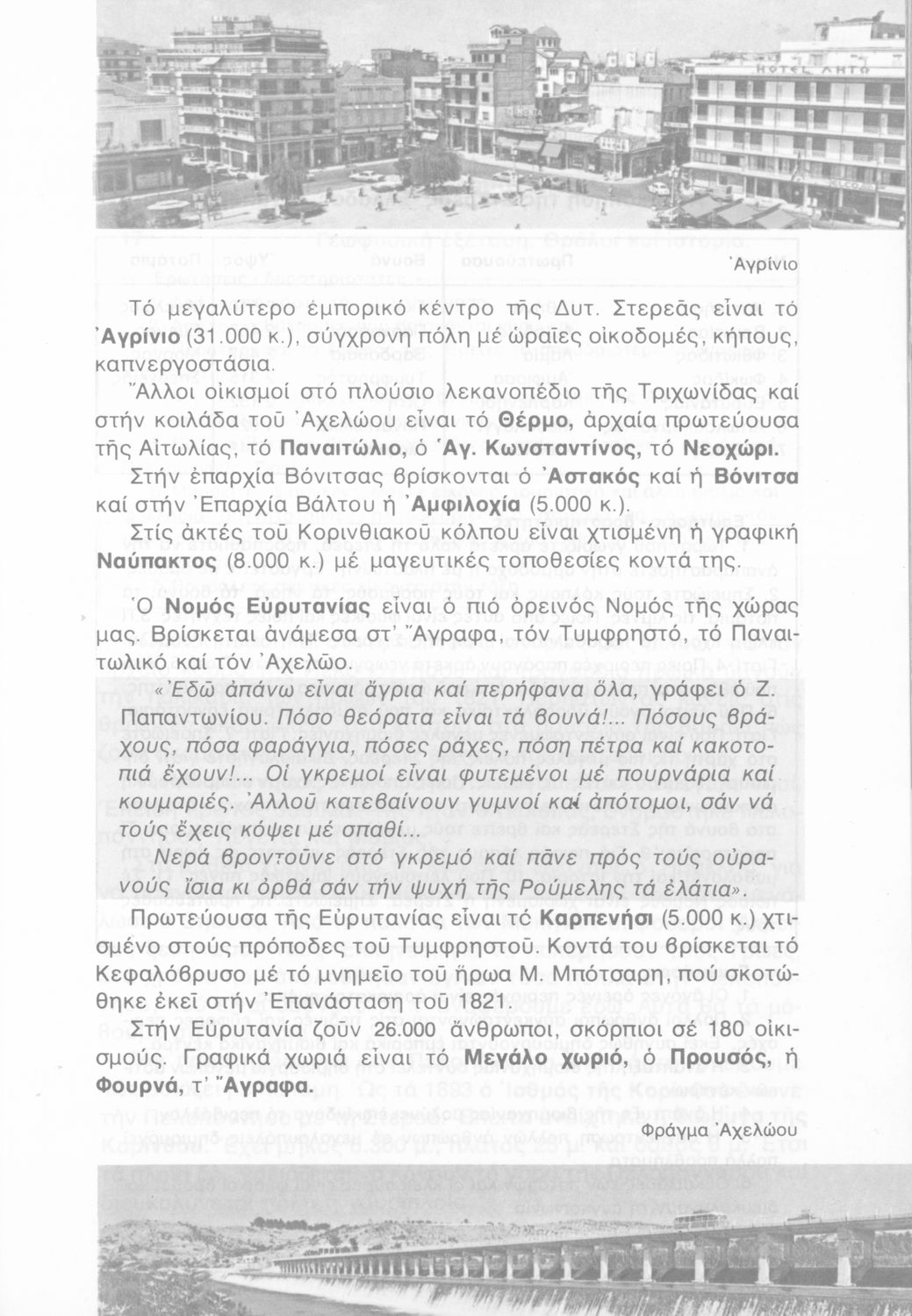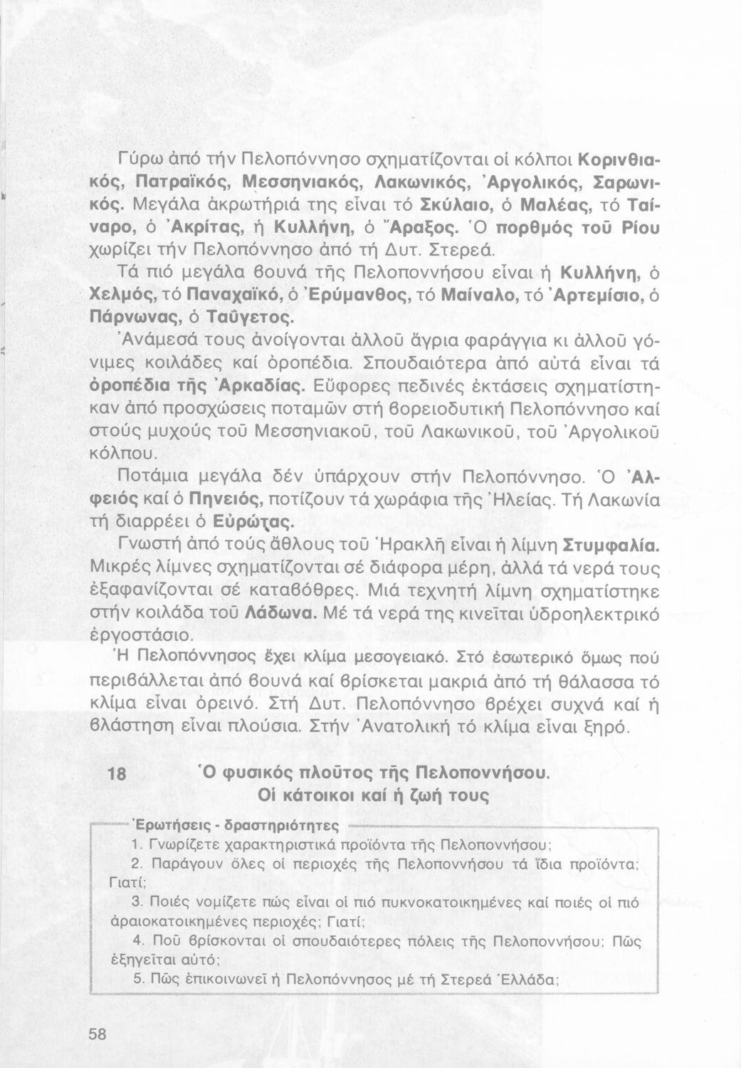 Σχολικό εγχειρίδιο Γεωγραφίας για τη Γ΄, Δ΄ Δημοτικού. Μελετά την Ελλάδα ανά γεωγραφικό νομό με πληροφορίες από το χάρτη της περιοχής και στοιχεία της ιστορίας και της οικονομικής ζωής.