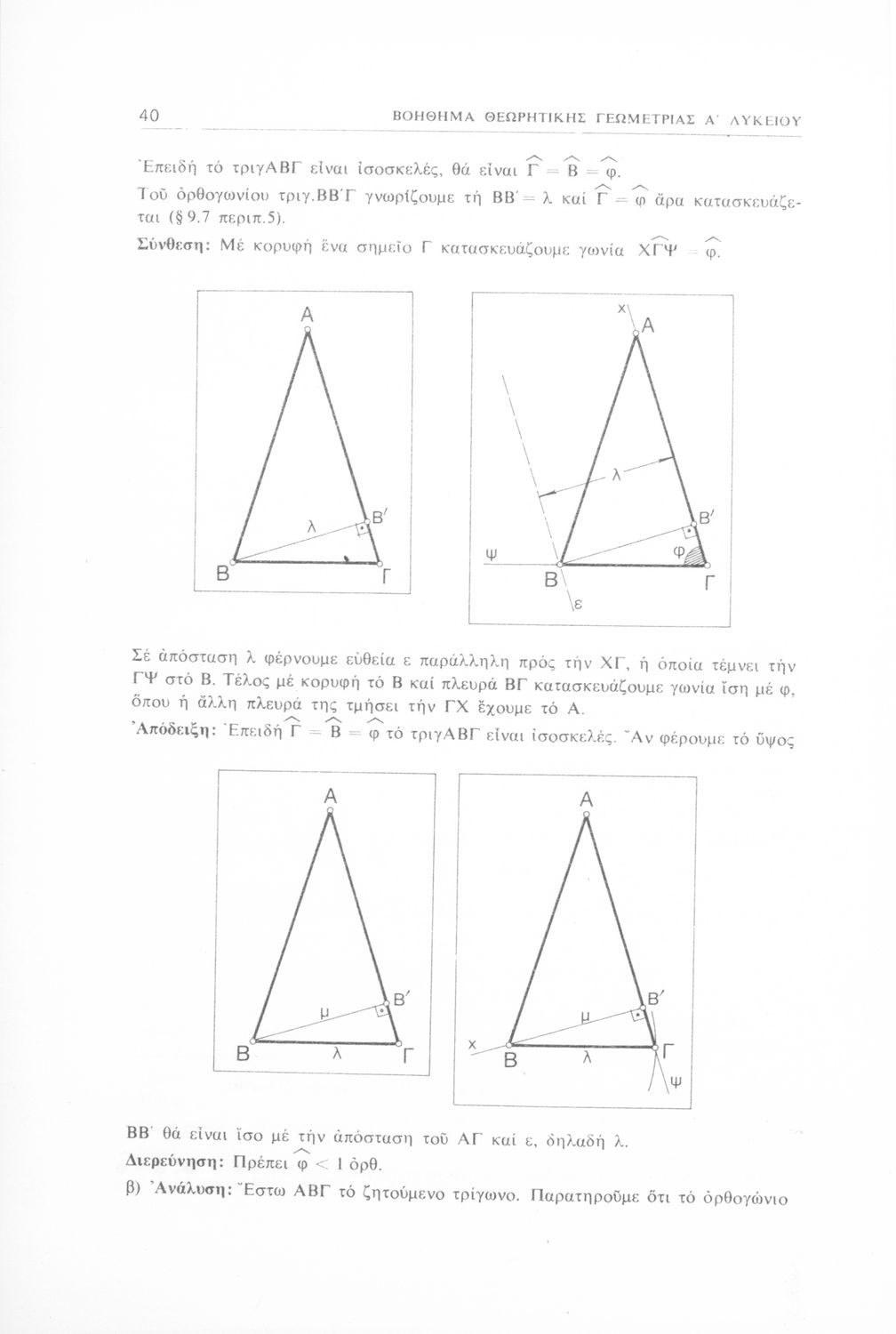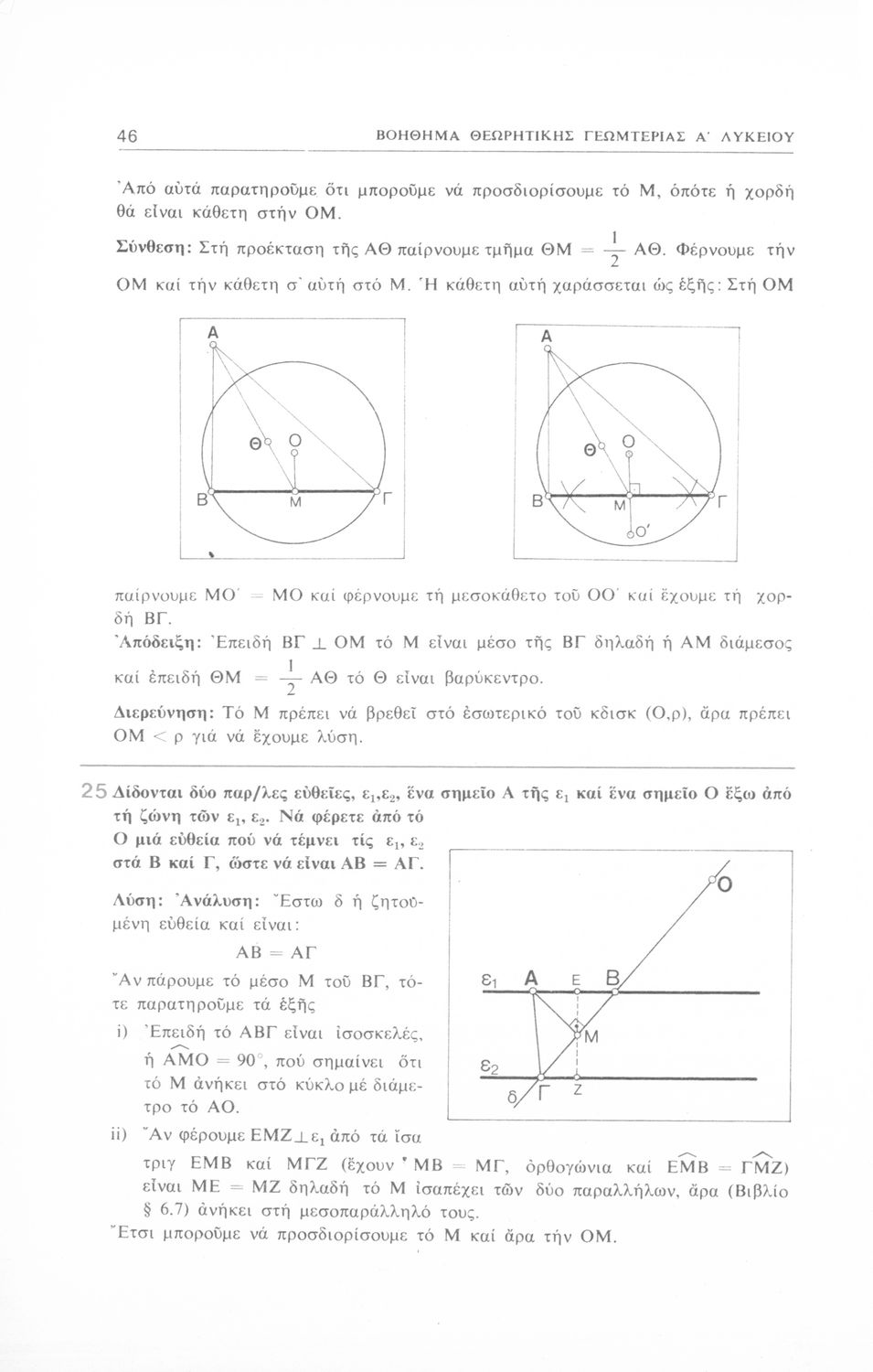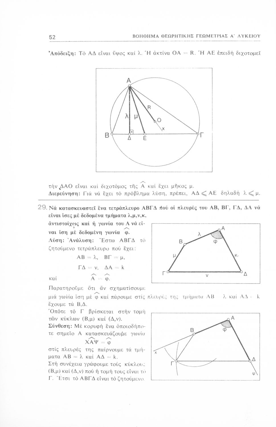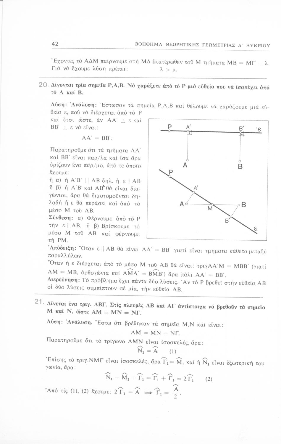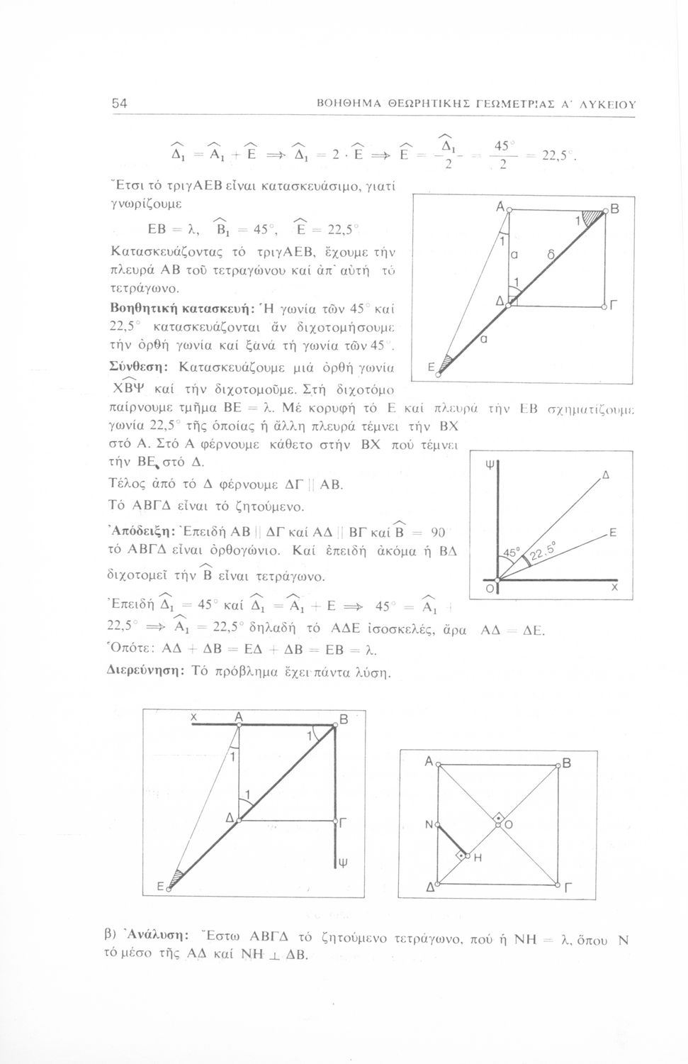 Σχολικό εγχειρίδιο Γεωμετρίας Α΄ Λυκείου χωρισμένο σε θεωρήματα, λυμένες ασκήσεις, ασκήσεις και επαναλήψεις κεφαλαίου. Περιέχει ένα παράρτημα με επαναληπτικά μαθήματα και ένα με ευρετήριο όρων.