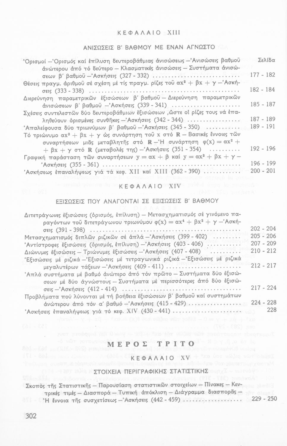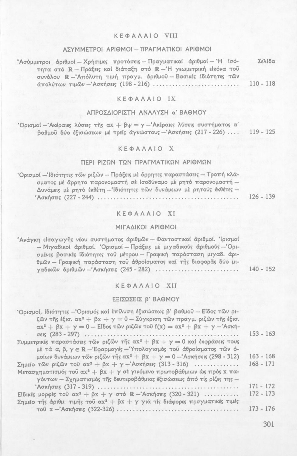 Σχολικό εγχειρίδιο Μαθηματικών Γυμνασίου που είναι χωρισμένο σε θεωρήματα, παραδείγματα και ασκήσεις και περιλαμβάνει στοιχεία Ανώτερης Άλγεβρας και Μαθηματικής Ανάλυσης.