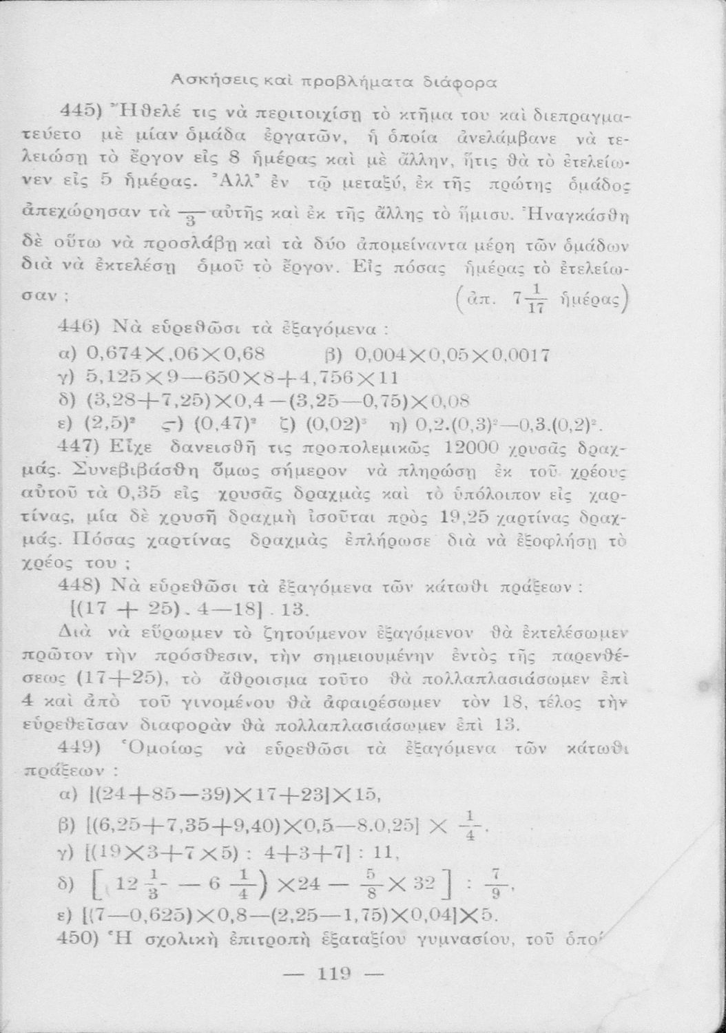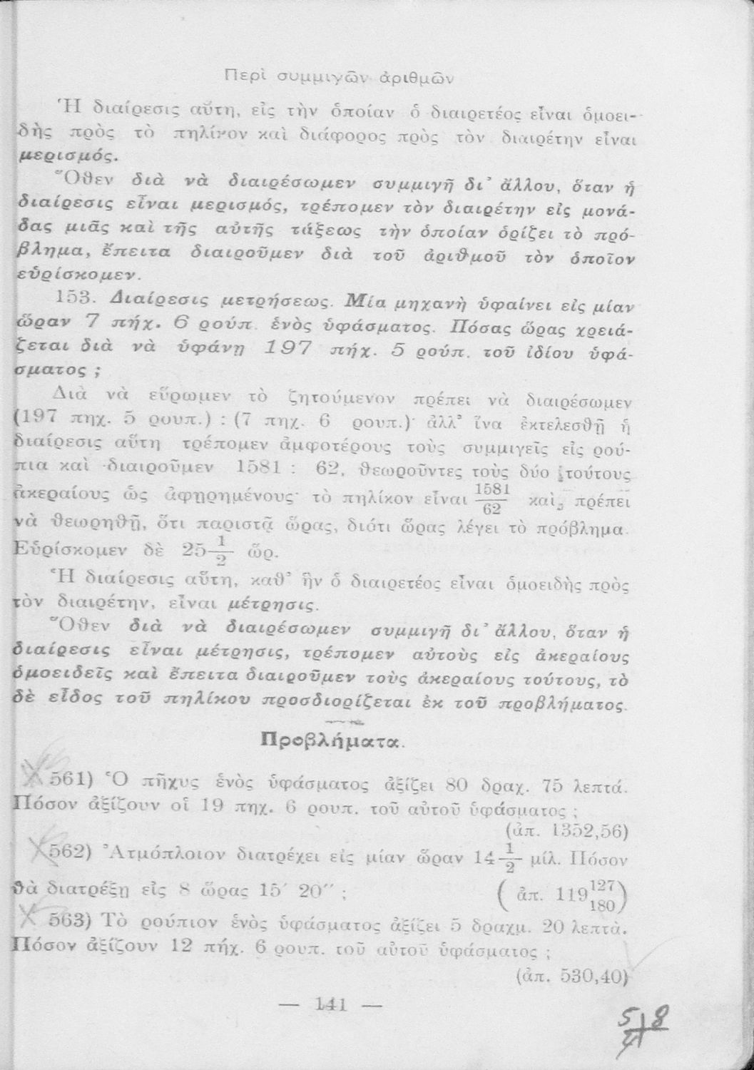 Σχολικό εγχειρίδιο Αριθμητικής για τις Α΄, Β΄ και Γ΄ τάξεις των Εξαταξίων Γυμνασίων που εστιάζει τις αριθμητικές πράξεις, τα κλάσματα, τους δεκαδικούς αριθμούς και είναι χωρισμένο σε θεωρία και ασκήσεις. Περιλαμβάνει και στοιχεία Θεωρητικής Αριθμητικής.
