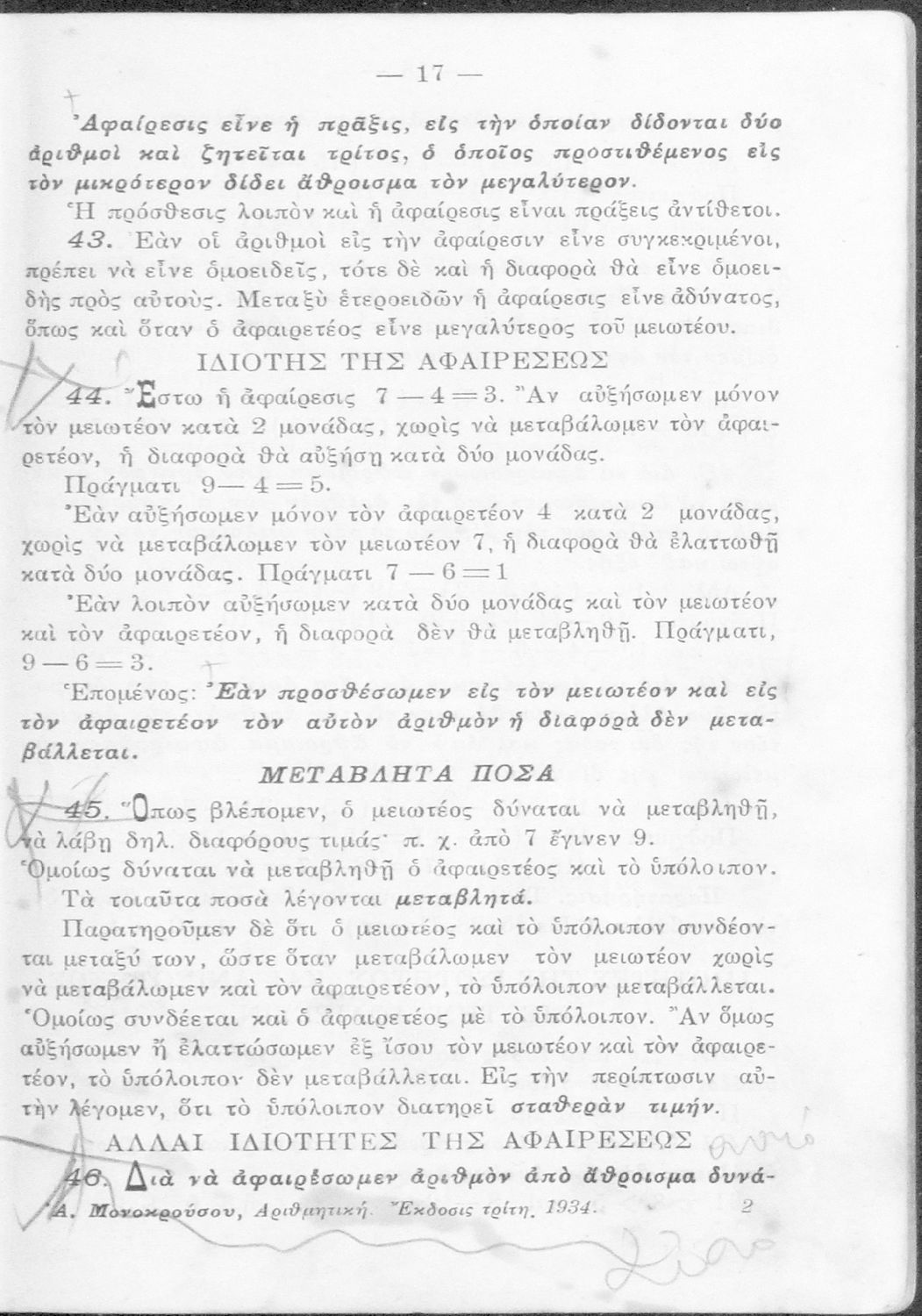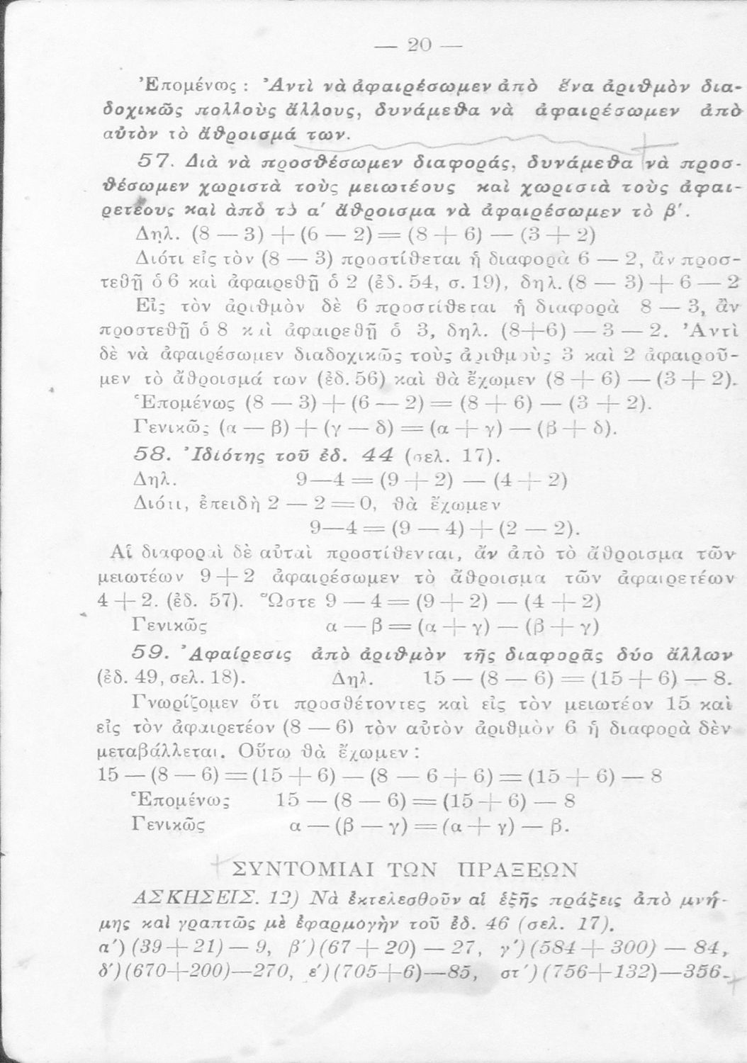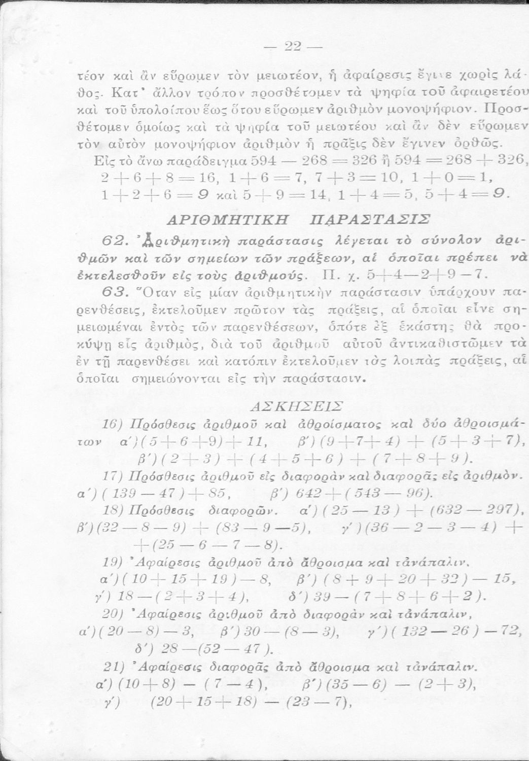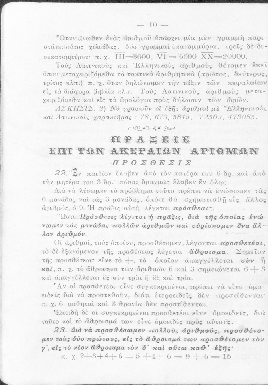 Σχολικό εγχειρίδιο Αριθμητικής για τα Γυμνάσια, τα Πρακτικά Λύκεια και τα Ανώτερα Παρθεναγωγεία που εστιάζει στις αριθμητικές πράξεις με κλάσματα και ακέραιους και συμμιγείς αριθμούς και περιέχει θεωρία και ασκήσεις με επιχειρηματικό προσανατολισμό.
