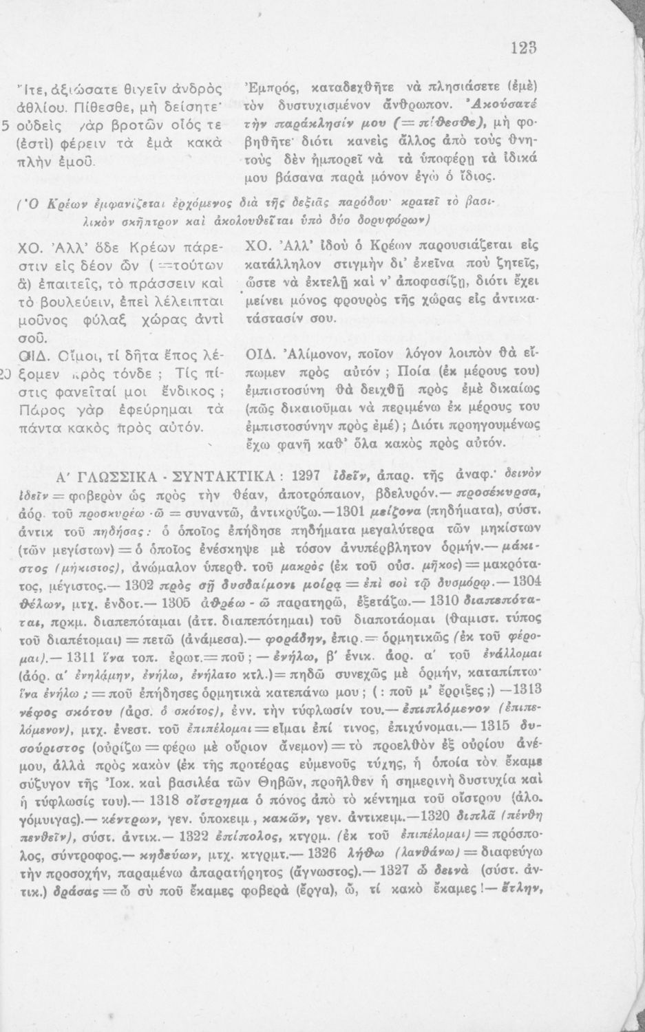 Σχολικό εγχειρίδιο του Γυμνασίου για το μάθημα των Αρχαίων Ελληνικών που περιέχει την τραγωδία του Σοφοκλή Οιδίπους Τύραννος, ερμηνευτικά και πραγματολογικά σχόλια και λεξιλογικές παρατηρήσεις.