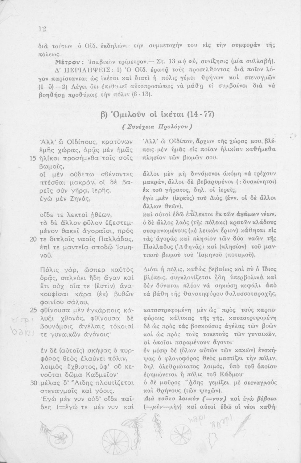 Σχολικό εγχειρίδιο Αρχαίων Ελληνικών που περιλαμβάνει τις τραγωδίες του Σοφοκλή Οιδίπους Τύραννος και Αντιγόνη, εισαγωγή και ερμηνευτικά σχόλια.