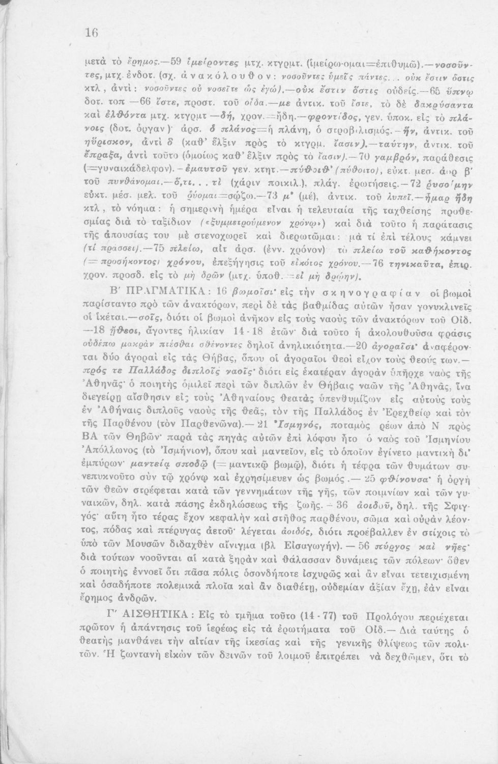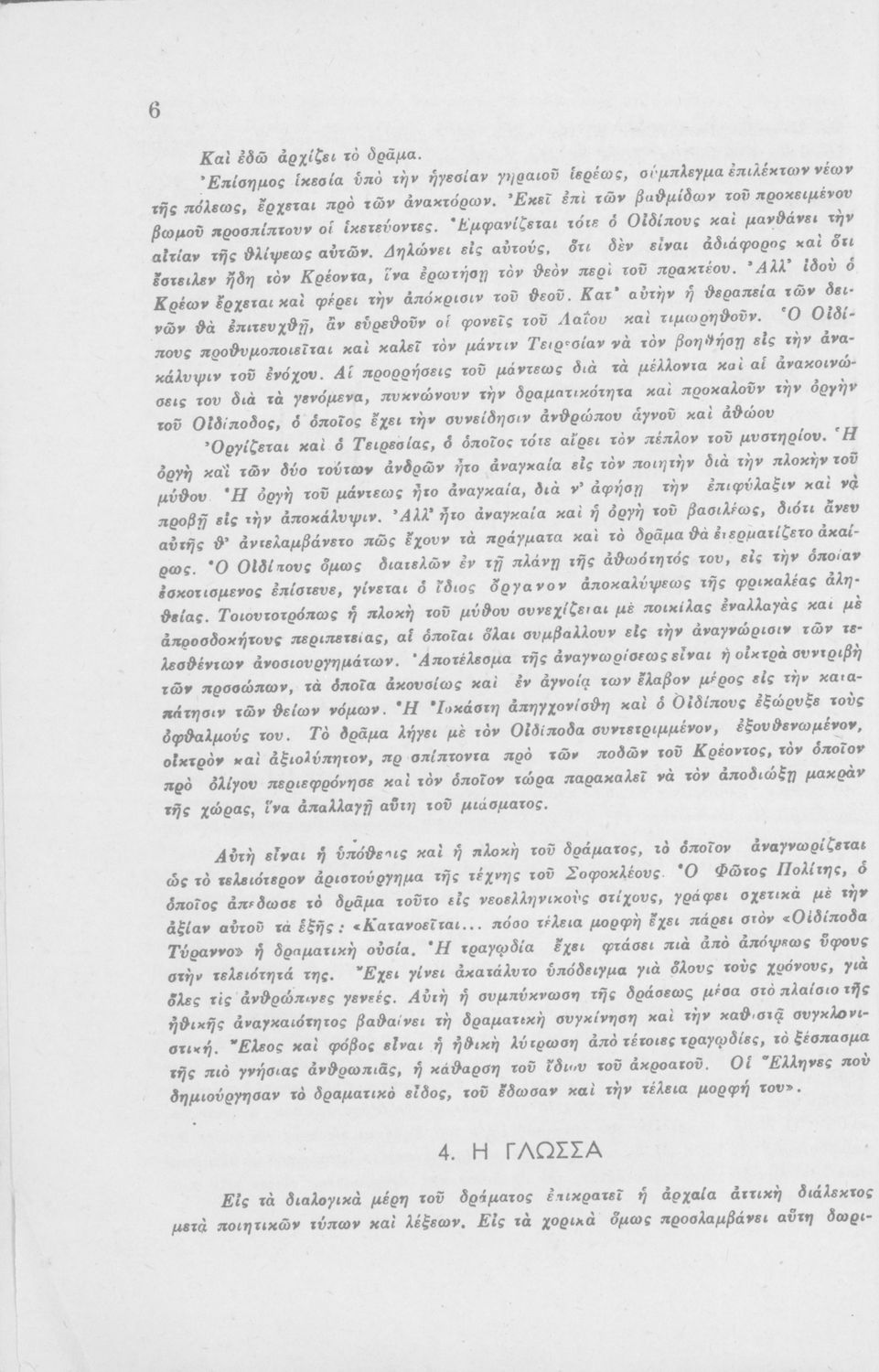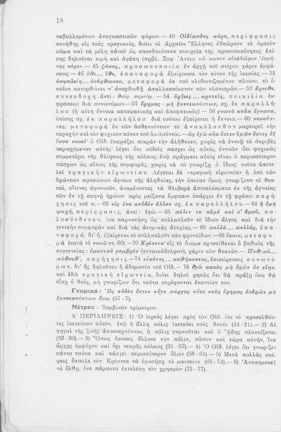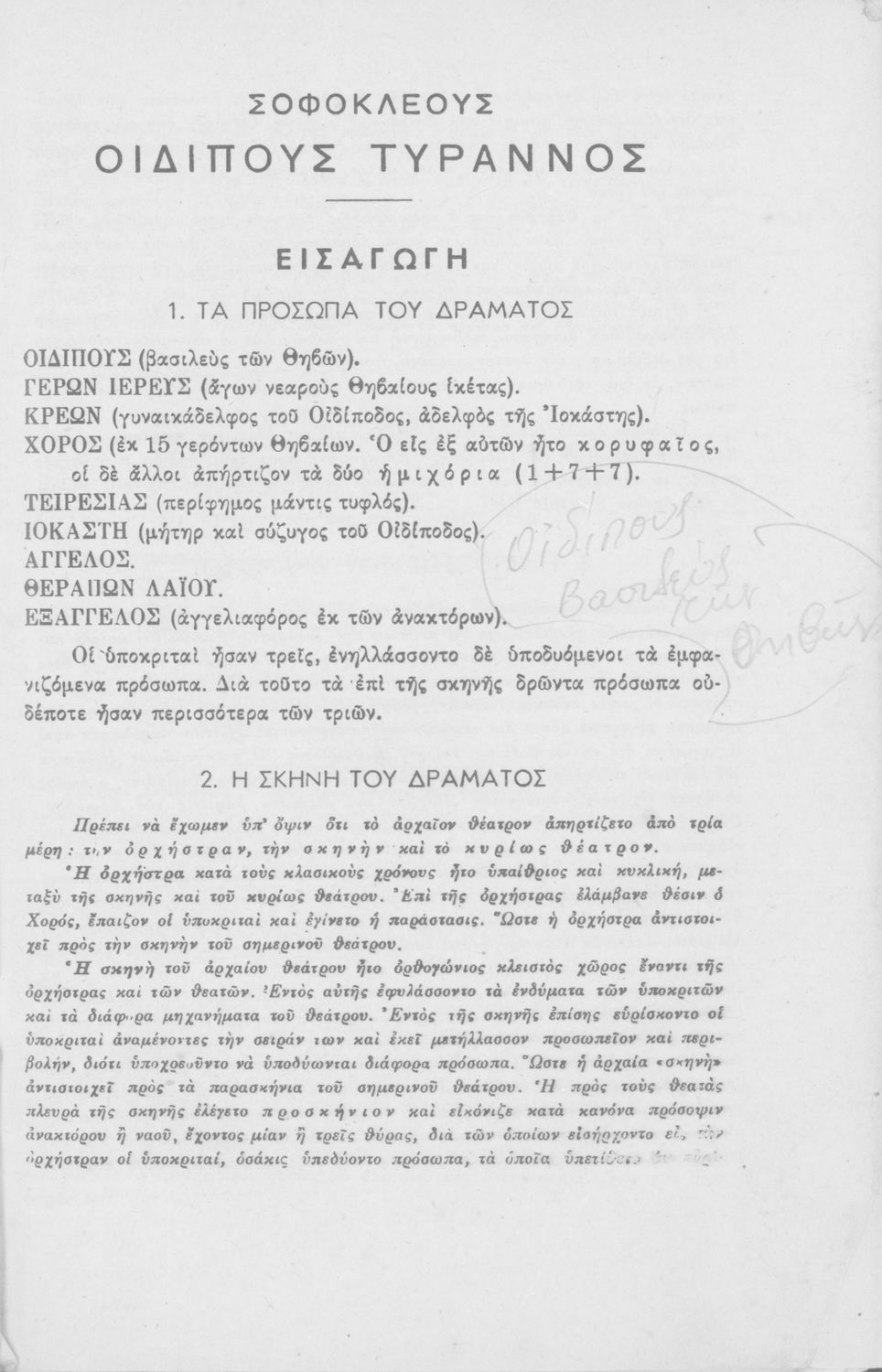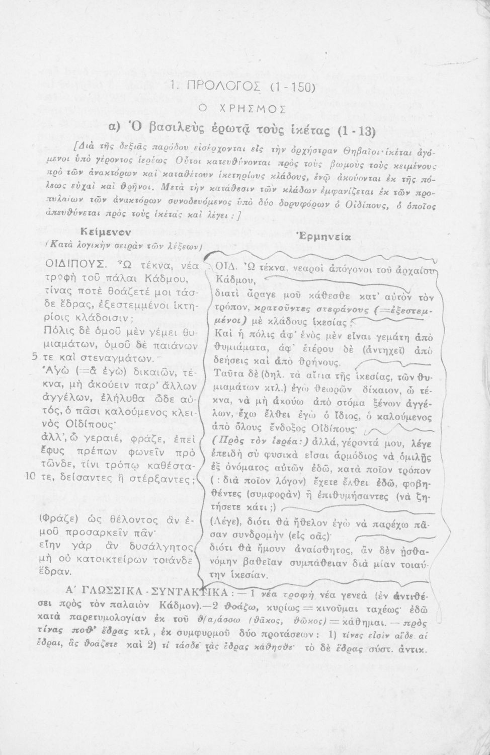 Σχολικό εγχειρίδιο του Γυμνασίου για το μάθημα των Αρχαίων Ελληνικών που περιέχει την τραγωδία του Σοφοκλή Οιδίπους Τύραννος, ερμηνευτικά και πραγματολογικά σχόλια και λεξιλογικές παρατηρήσεις.