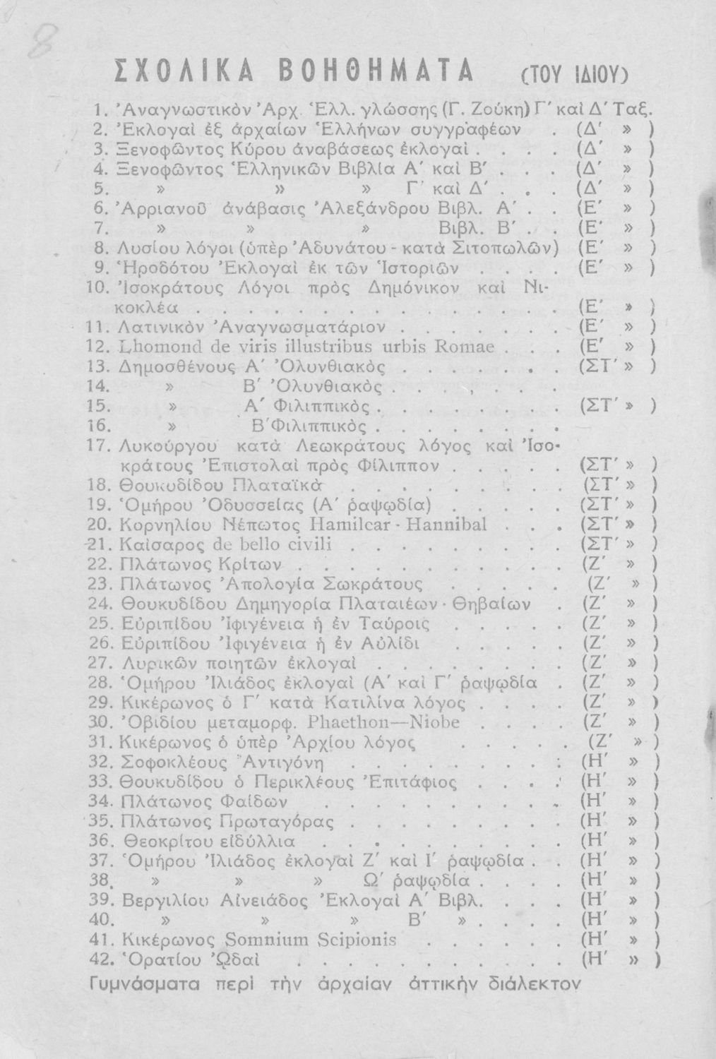 Δημοσθένης, Λυκούργος, Ισοκράτης, Κυριάκος Κοσμάς, Νικ. Φραγκίσκος, Μιχ. Περίδης, Γ. Παπαοικονόμου (σχόλια)