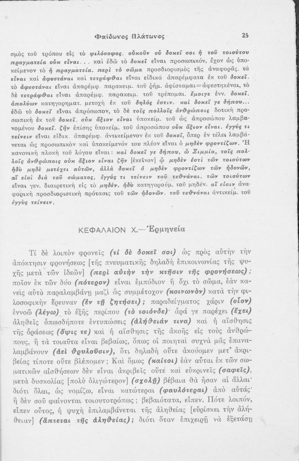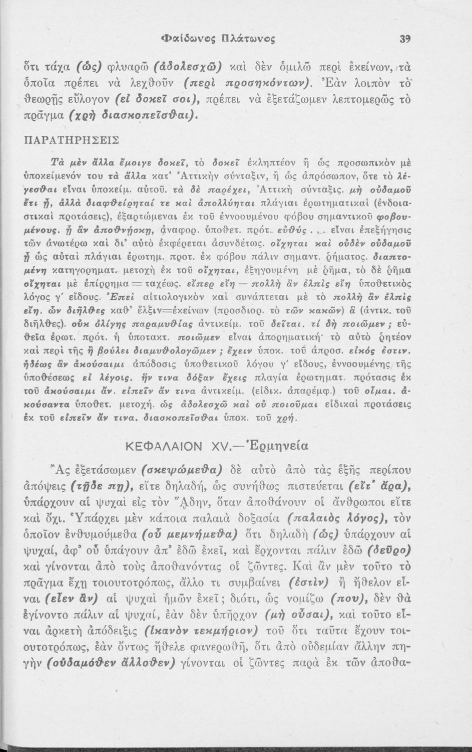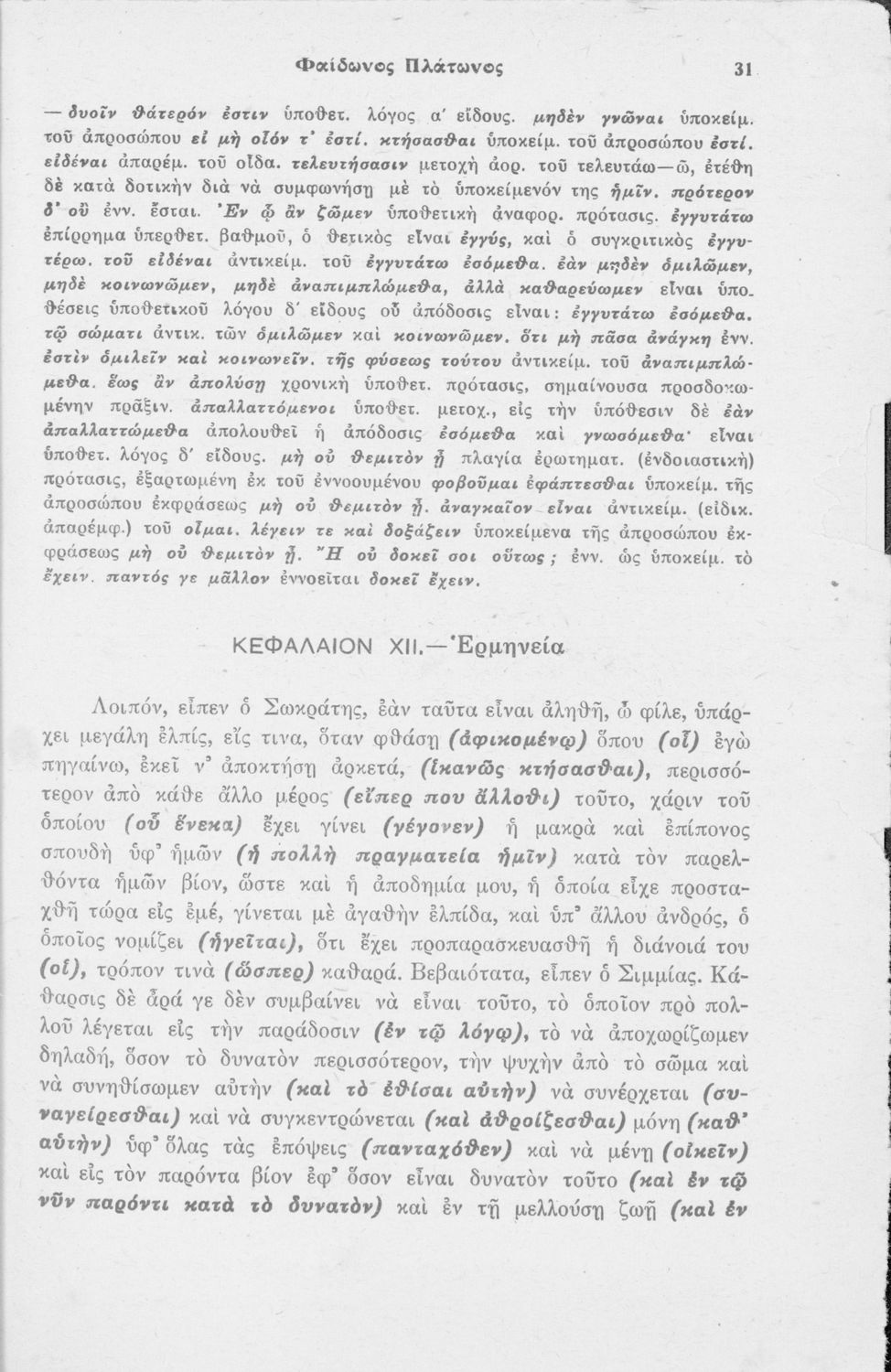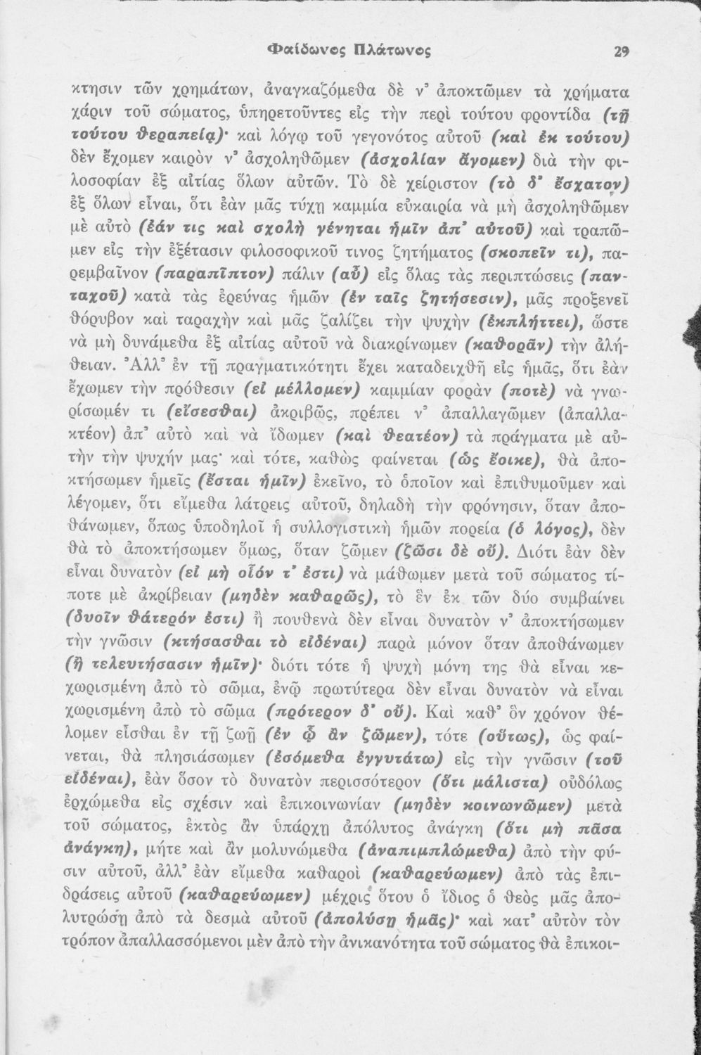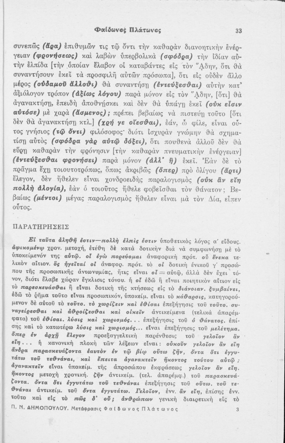 Παρουσίαση περιεχομένου: Μαθητικό βοήθημα του Γυμνασίου για το μάθημα των Αρχαίων Ελληνικών. Περιέχει τη μετάφραση του έργου Φαίδων του Πλάτωνα και ερμηνευτικά, πραγματολογικά σχόλια, καθώς και γραμματικές, συντακτικές παρατηρήσεις του συγγραφέα. Το σύγγραμμα έγινε σύμφωνα με το σχολικό βιβλίο που εγκρίθηκε το 1942.