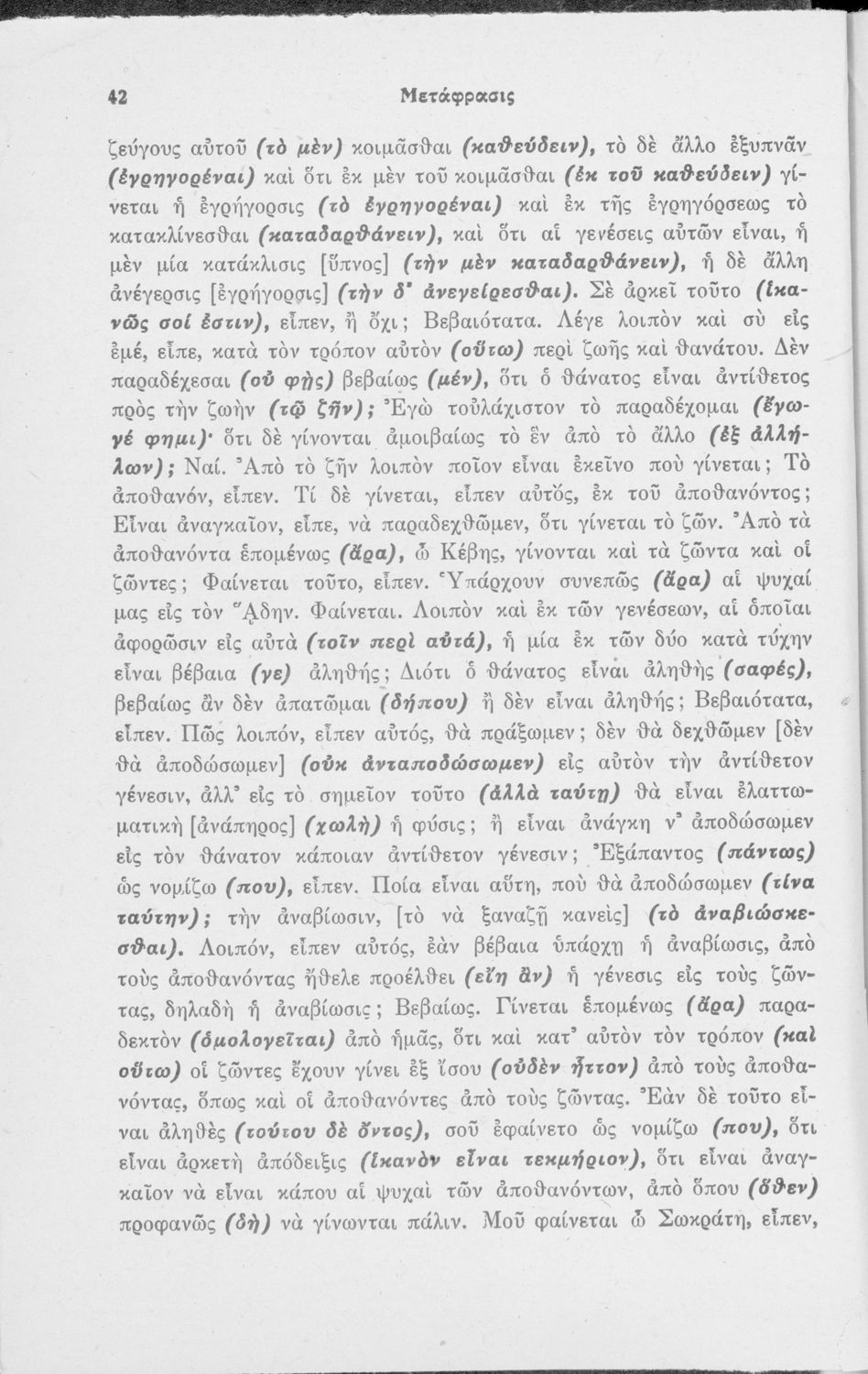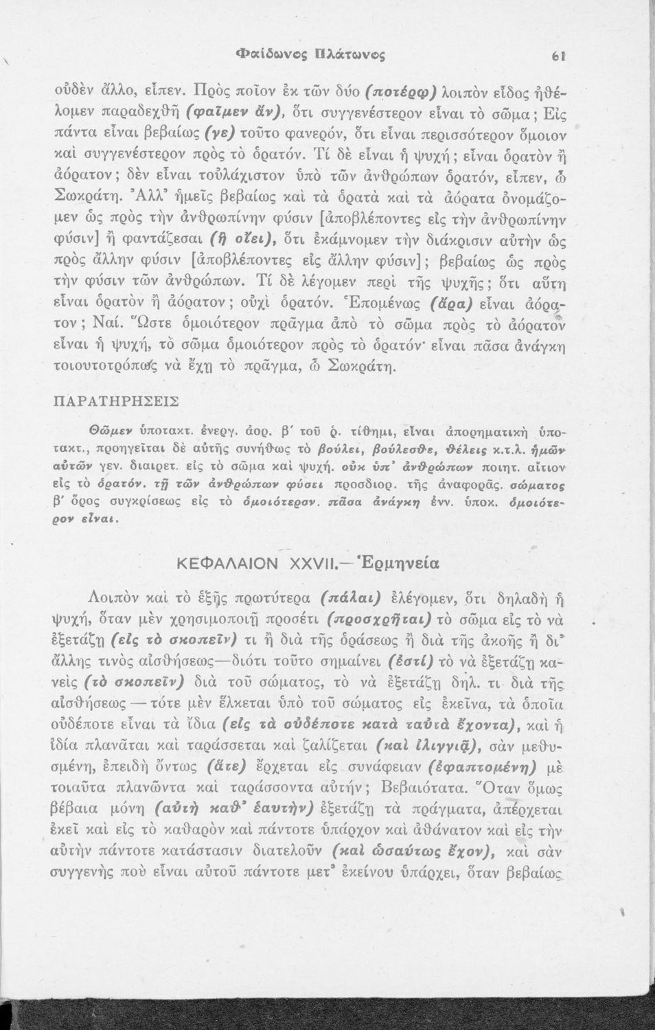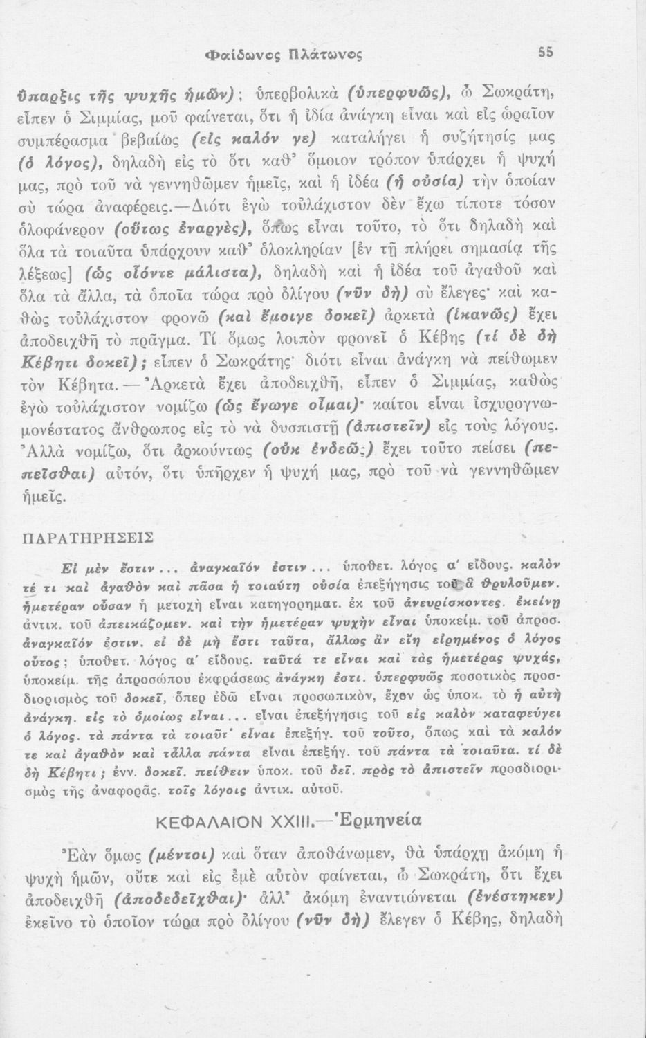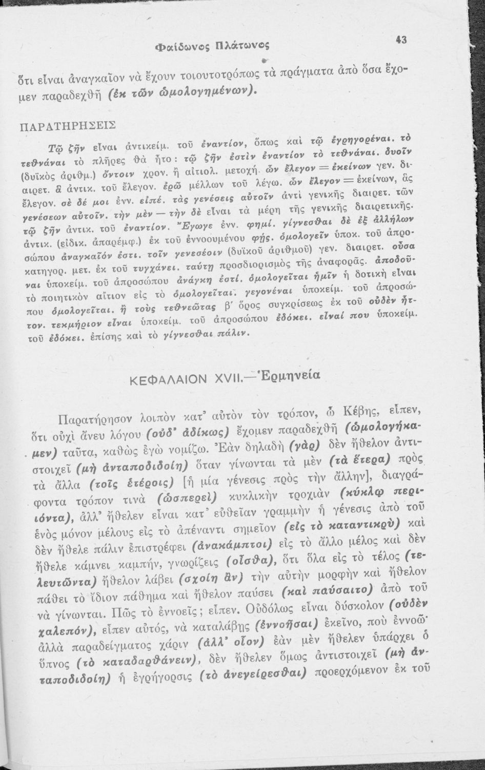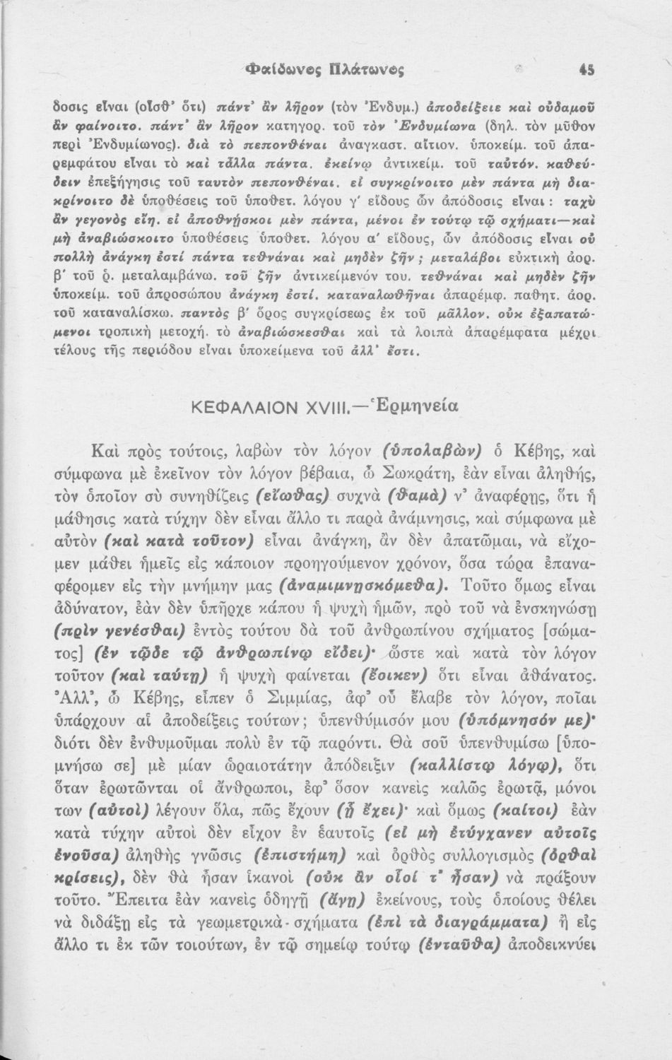 Μαθητικό βοήθημα του Γυμνασίου για το μάθημα των Αρχαίων Ελληνικών. Περιέχει τη μετάφραση του έργου Φαίδων του Πλάτωνα και ερμηνευτικά, πραγματολογικά σχόλια, καθώς και γραμματικές, συντακτικές παρατηρήσεις του συγγραφέα. Το σύγγραμμα έγινε σύμφωνα με το σχολικό βιβλίο που εγκρίθηκε το 1942.