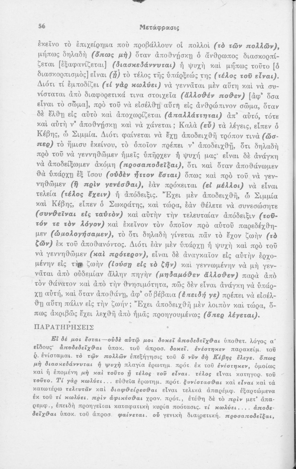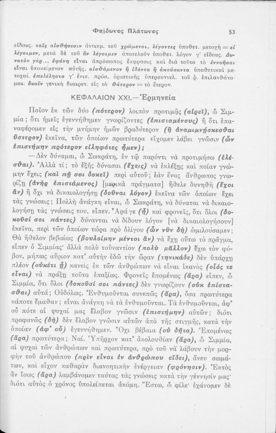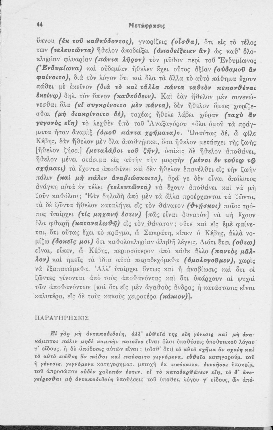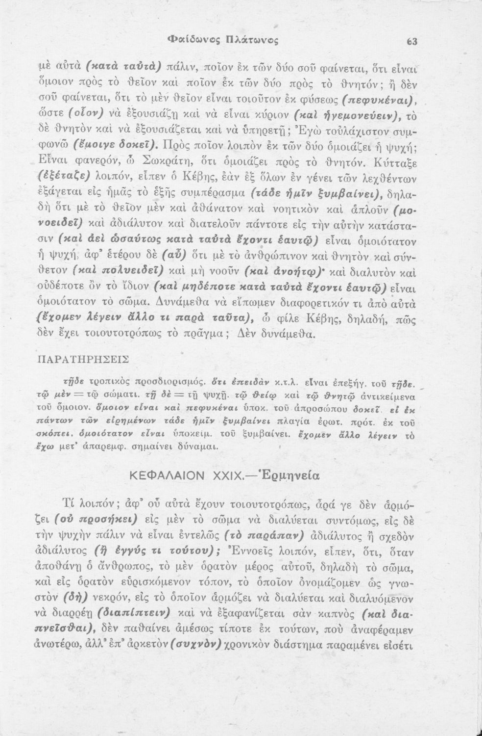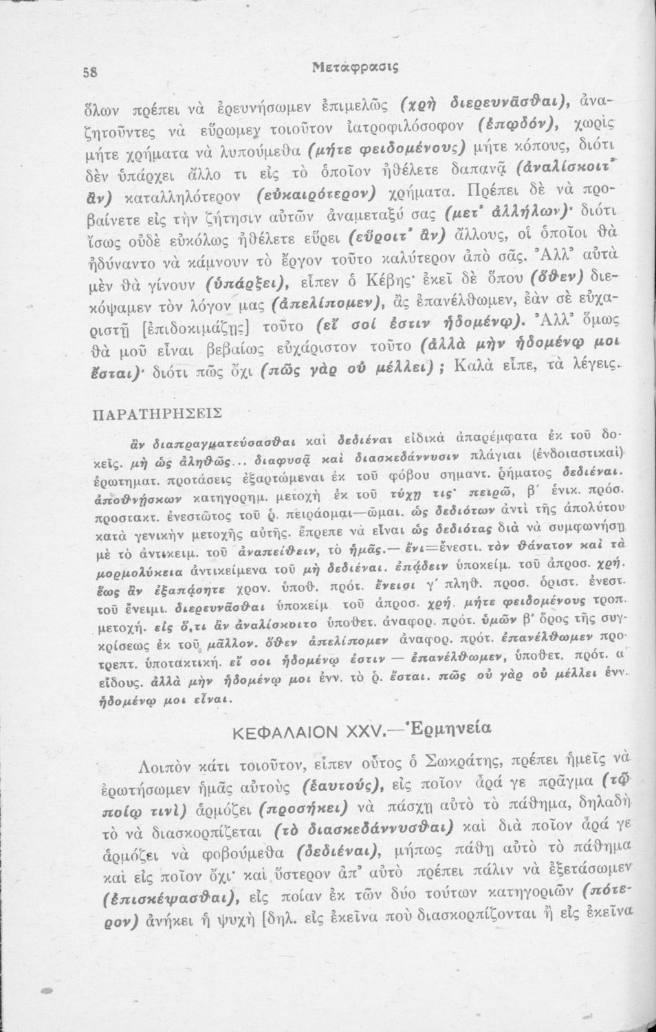 Μαθητικό βοήθημα του Γυμνασίου για το μάθημα των Αρχαίων Ελληνικών. Περιέχει τη μετάφραση του έργου Φαίδων του Πλάτωνα και ερμηνευτικά, πραγματολογικά σχόλια, καθώς και γραμματικές, συντακτικές παρατηρήσεις του συγγραφέα. Το σύγγραμμα έγινε σύμφωνα με το σχολικό βιβλίο που εγκρίθηκε το 1942.