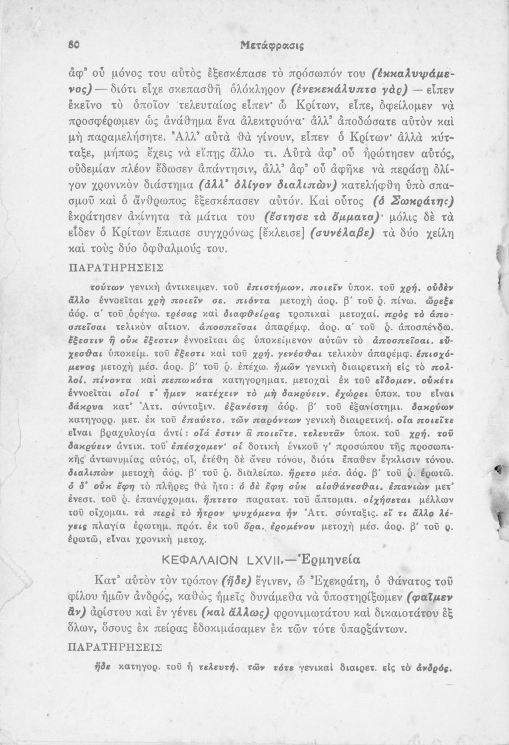Βαθμίδα εκπαίδευσης: Δευτεροβάθμια Τάξη: Γυμνάσιο Μάθημα: Αρχαία Ελληνικά Γλώσσα: Απλή καθαρεύουσα Παρουσίαση περιεχομένου: Μαθητικό βοήθημα του Γυμνασίου για το μάθημα των Αρχαίων Ελληνικών. Περιέχει τη μετάφραση του έργου Φαίδων του Πλάτωνα και ερμηνευτικά, πραγματολογικά σχόλια, καθώς και γραμματικές, συντακτικές παρατηρήσεις του συγγραφέα. Το σύγγραμμα έγινε σύμφωνα με το σχολικό βιβλίο που εγκρίθηκε το 1942. |
