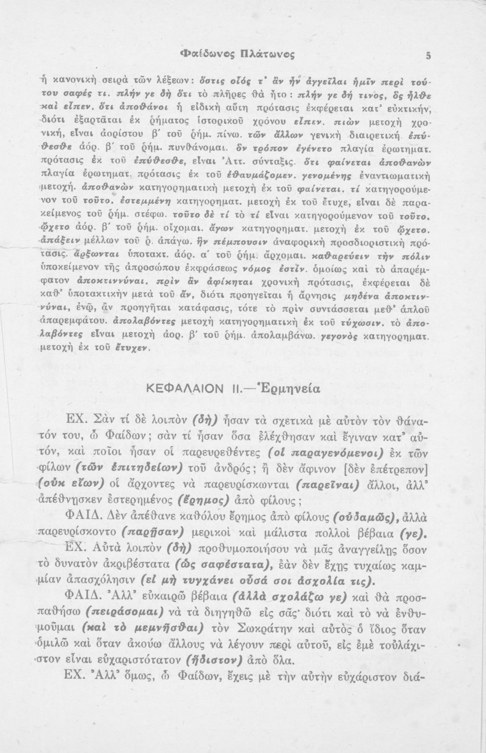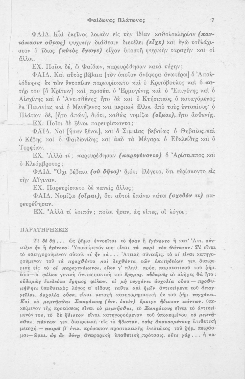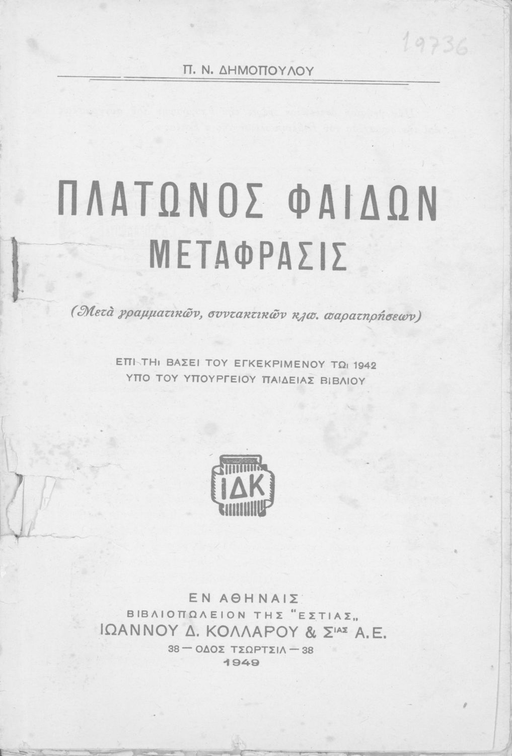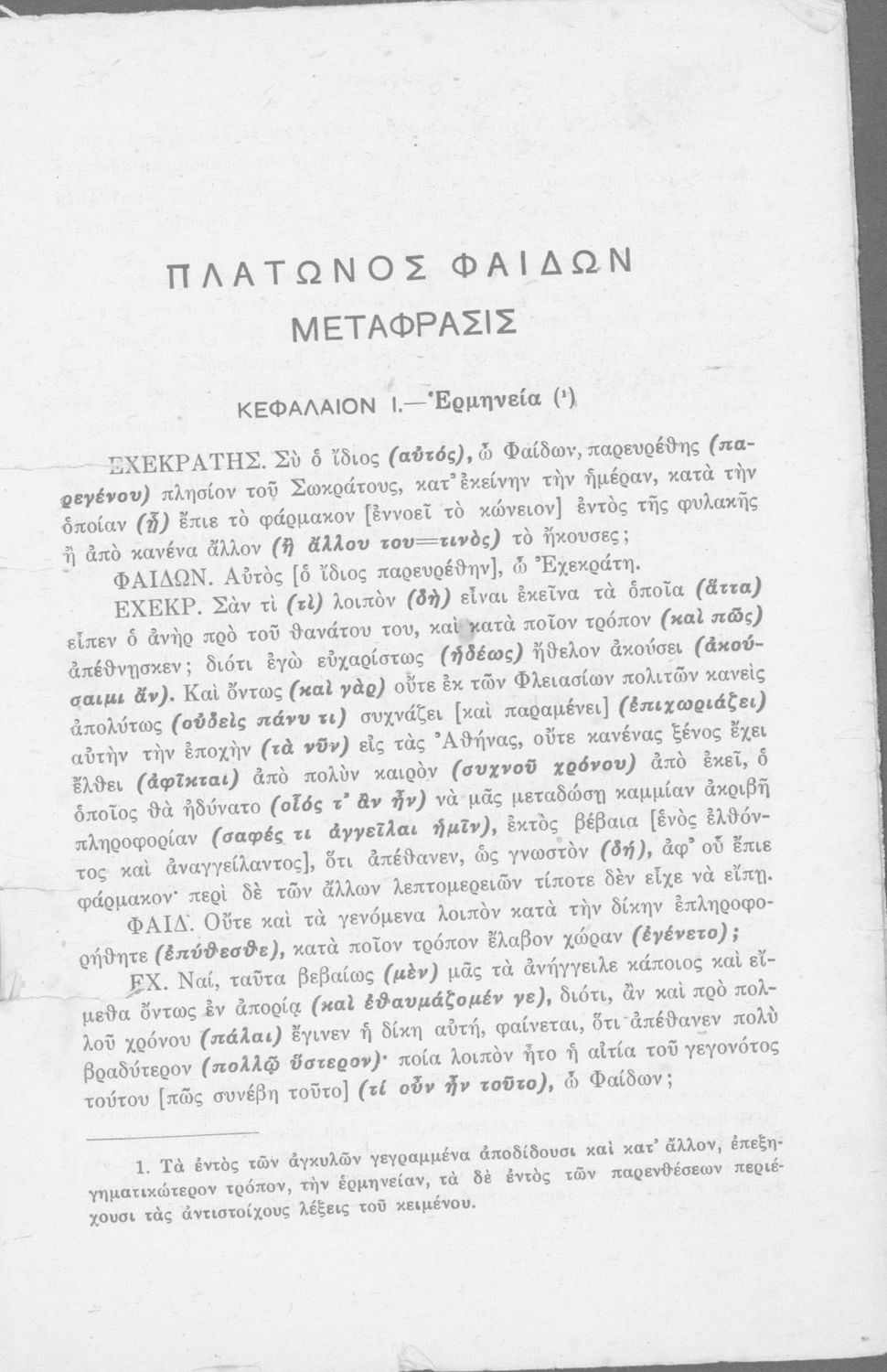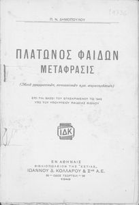 Παρουσίαση περιεχομένου: Μαθητικό βοήθημα του Γυμνασίου για το μάθημα των Αρχαίων Ελληνικών. Περιέχει τη μετάφραση του έργου Φαίδων του Πλάτωνα και ερμηνευτικά, πραγματολογικά σχόλια, καθώς και γραμματικές, συντακτικές παρατηρήσεις του συγγραφέα. Το σύγγραμμα έγινε σύμφωνα με το σχολικό βιβλίο που εγκρίθηκε το 1942.