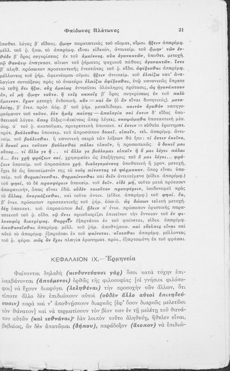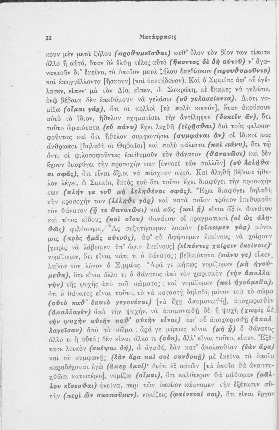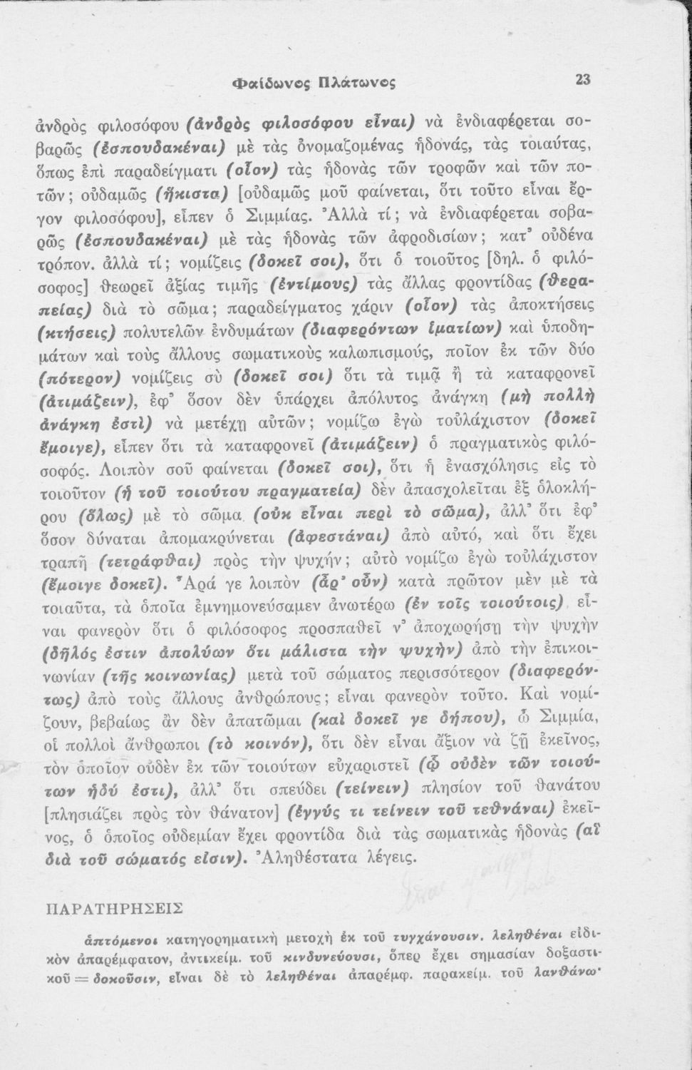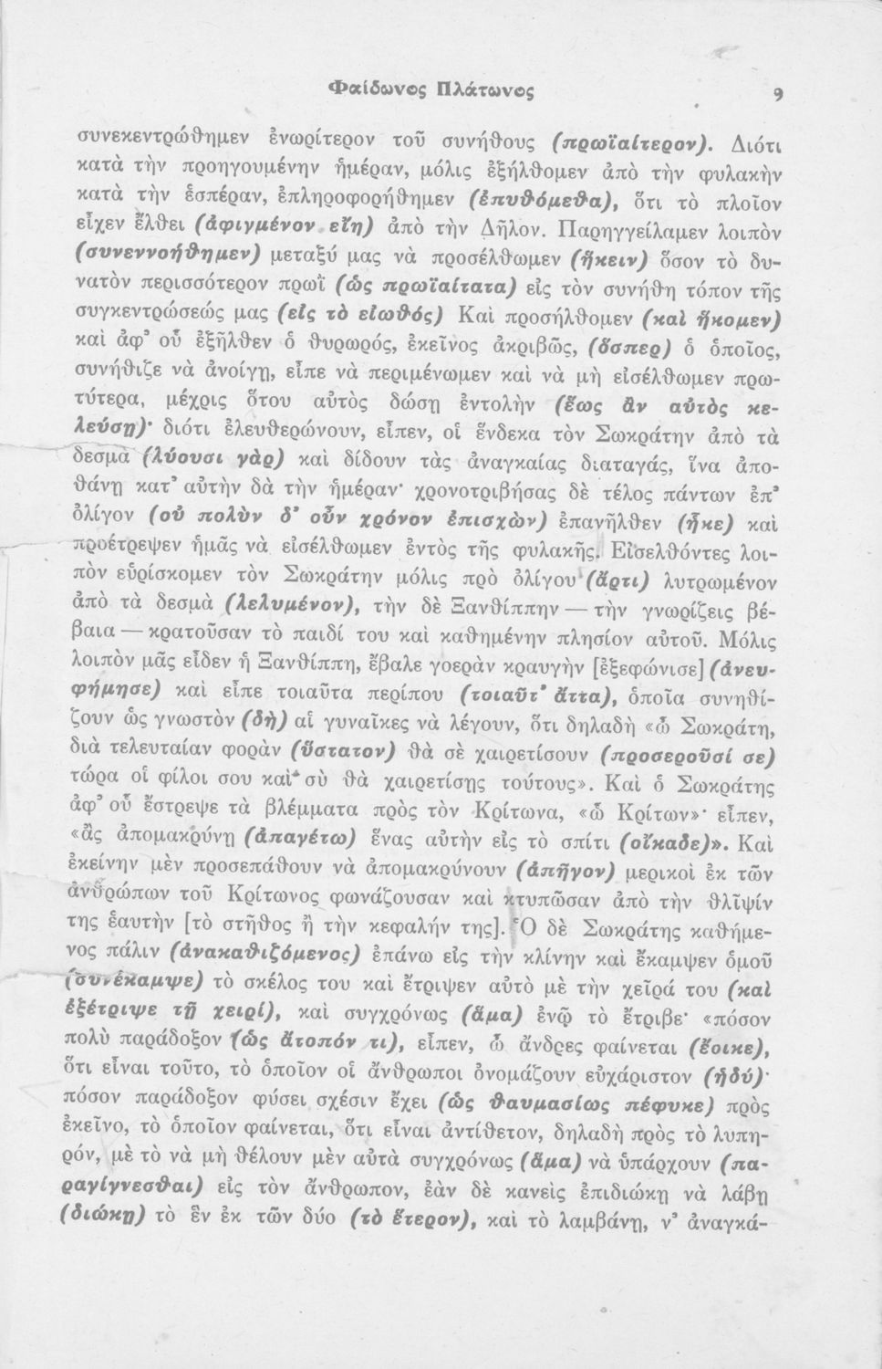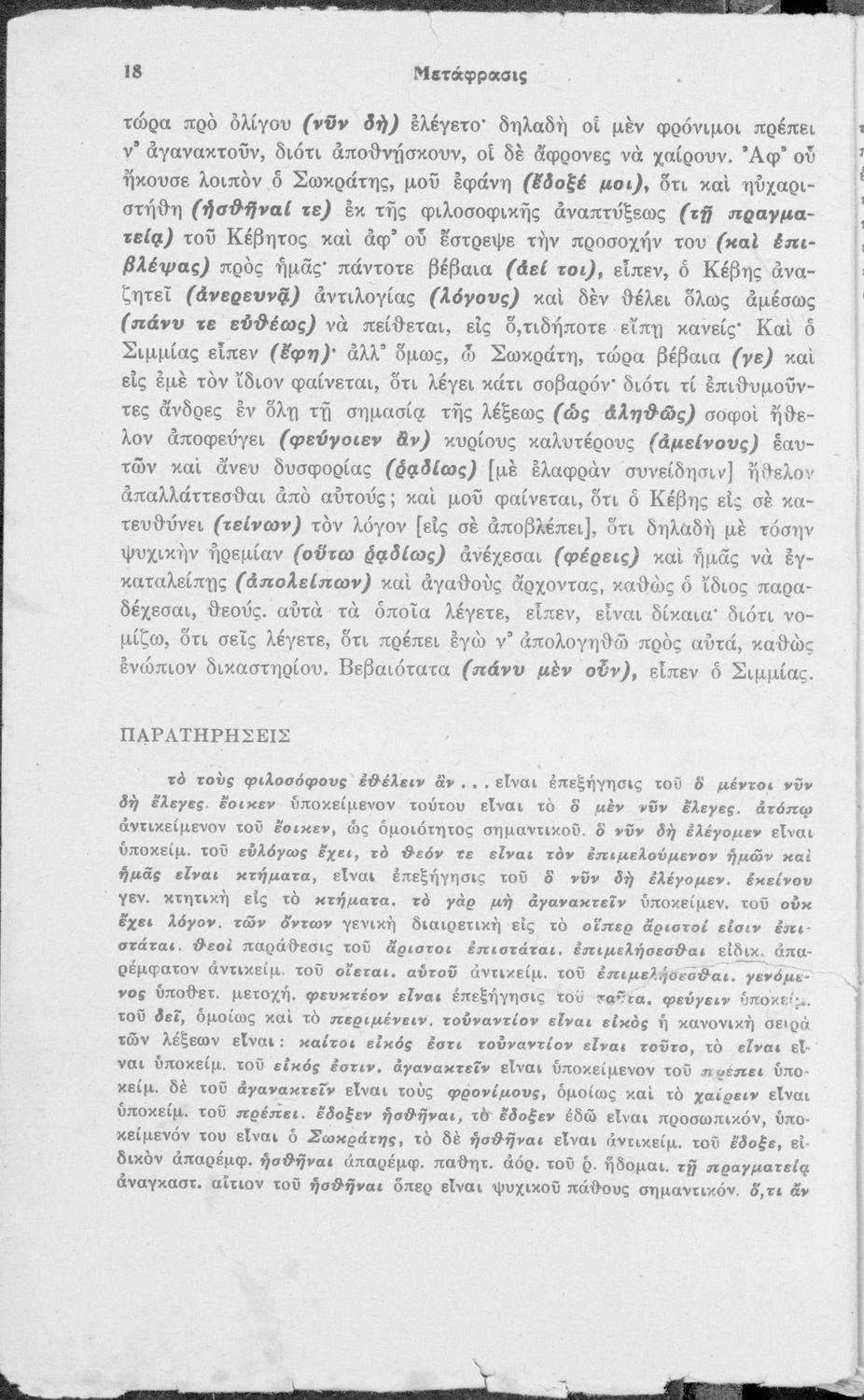 Παρουσίαση περιεχομένου: Μαθητικό βοήθημα του Γυμνασίου για το μάθημα των Αρχαίων Ελληνικών. Περιέχει τη μετάφραση του έργου Φαίδων του Πλάτωνα και ερμηνευτικά, πραγματολογικά σχόλια, καθώς και γραμματικές, συντακτικές παρατηρήσεις του συγγραφέα. Το σύγγραμμα έγινε σύμφωνα με το σχολικό βιβλίο που εγκρίθηκε το 1942.