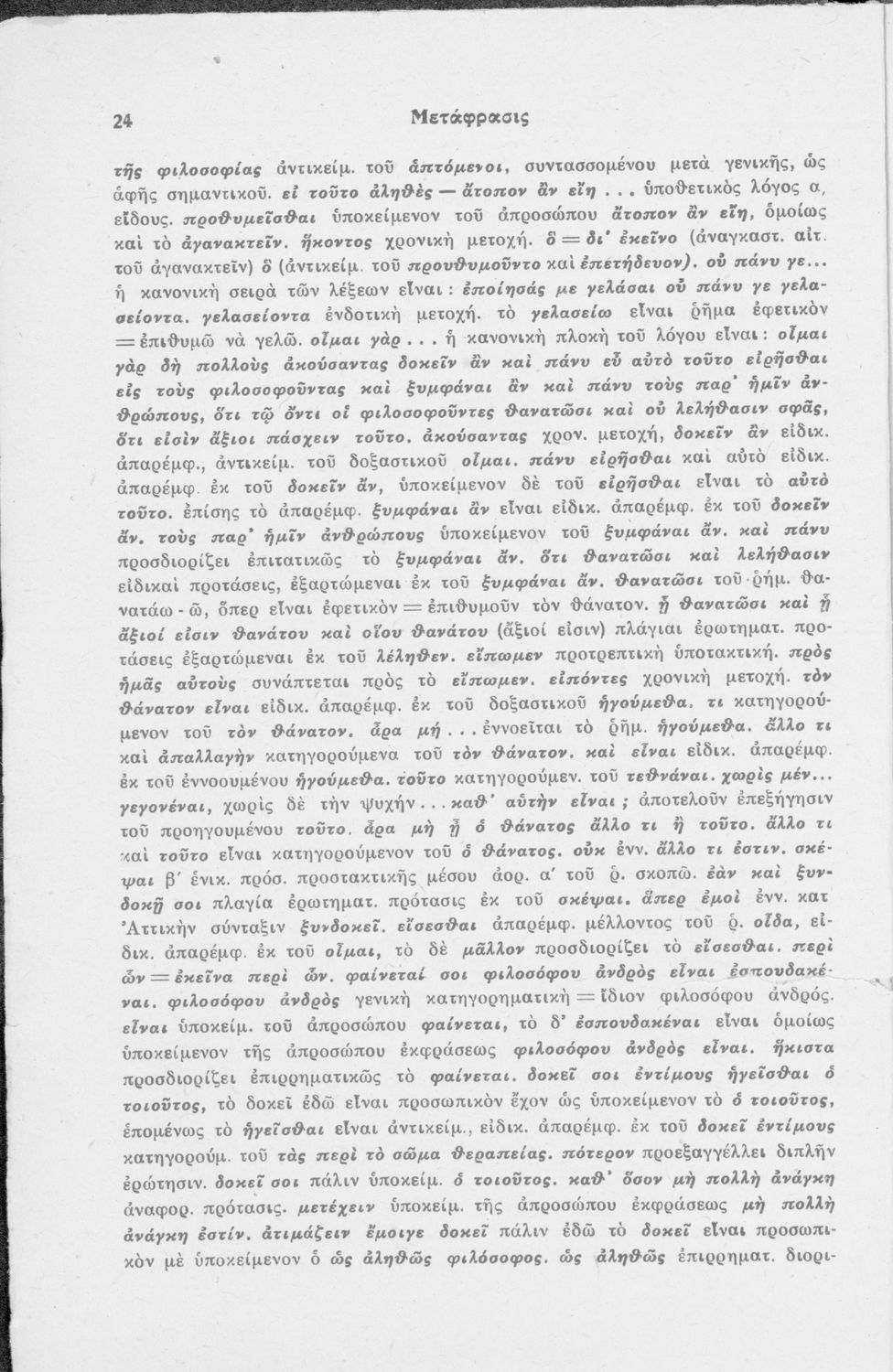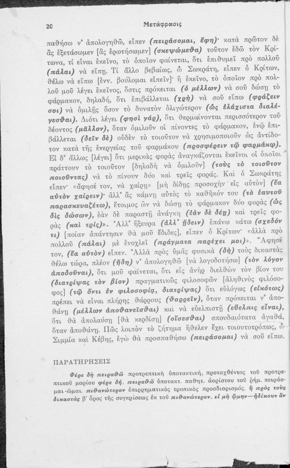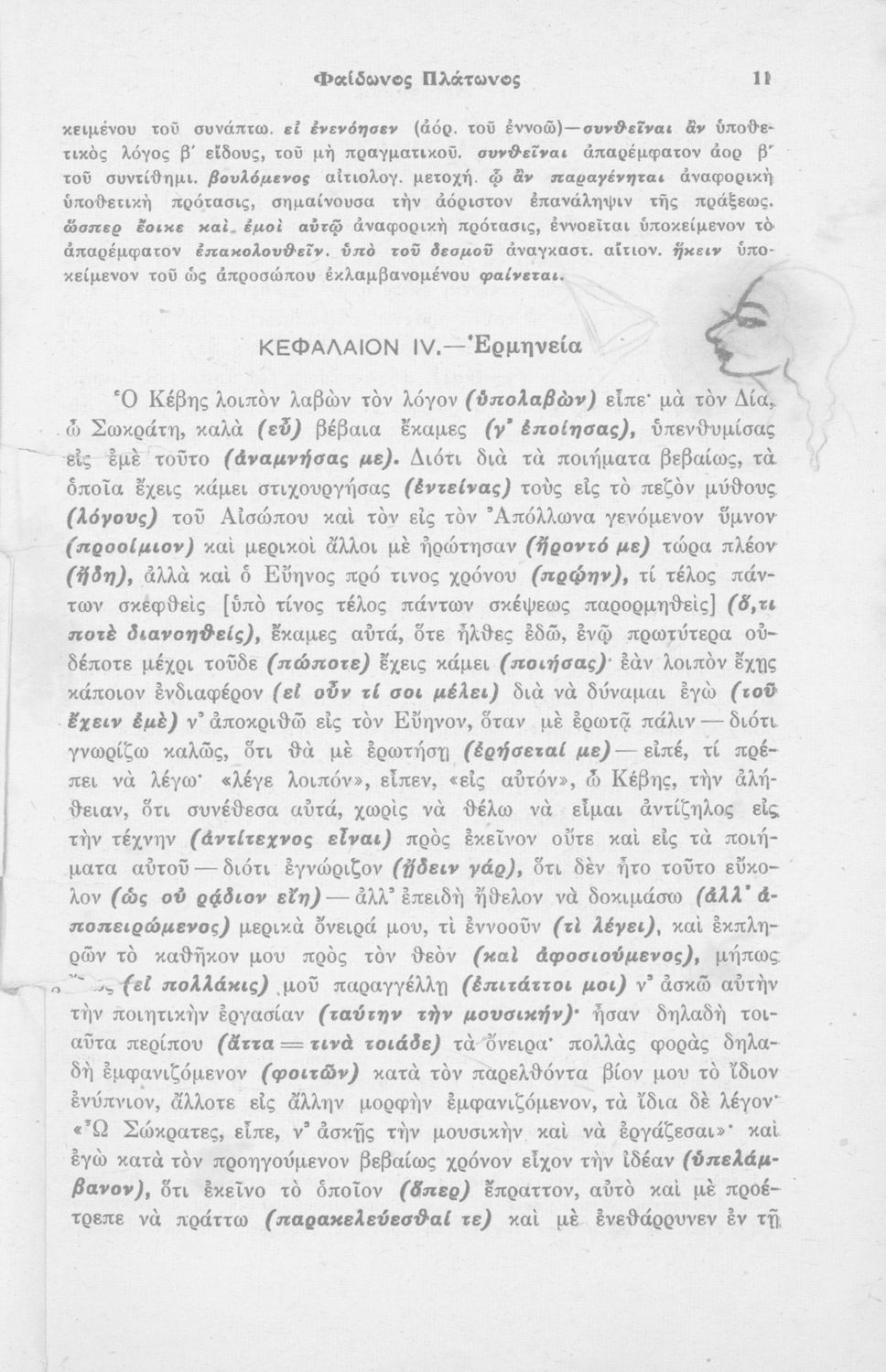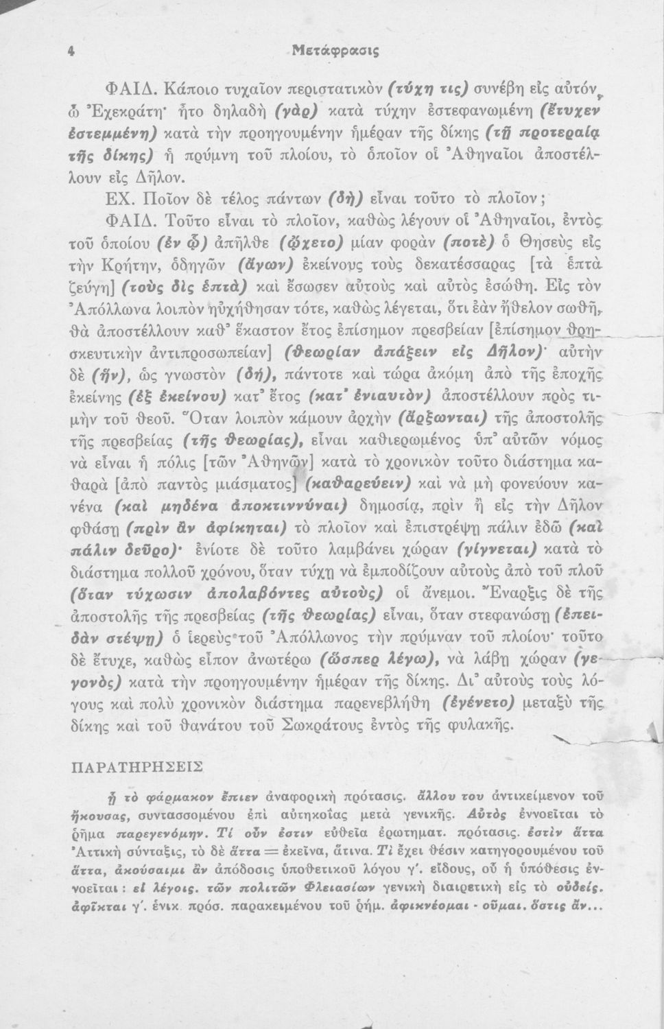 Παρουσίαση περιεχομένου: Μαθητικό βοήθημα του Γυμνασίου για το μάθημα των Αρχαίων Ελληνικών. Περιέχει τη μετάφραση του έργου Φαίδων του Πλάτωνα και ερμηνευτικά, πραγματολογικά σχόλια, καθώς και γραμματικές, συντακτικές παρατηρήσεις του συγγραφέα. Το σύγγραμμα έγινε σύμφωνα με το σχολικό βιβλίο που εγκρίθηκε το 1942.