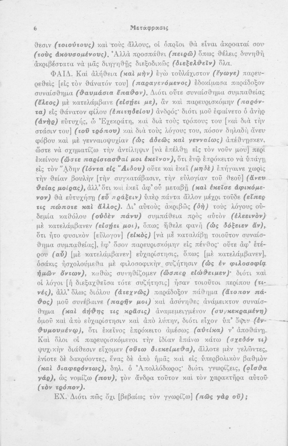 Σχολικό εγχειρίδιο Αρχαίων Ελληνικών ΣΤ΄ Γυμνασίου που περιέχει αποσπάσματα από το έργο του Πλάτωνα Φαίδων, λεξιλογικές παρατηρήσεις, και ερμηνευτικά, πραγματολογικά σχόλια και γραμματικές παρατηρήσεις.