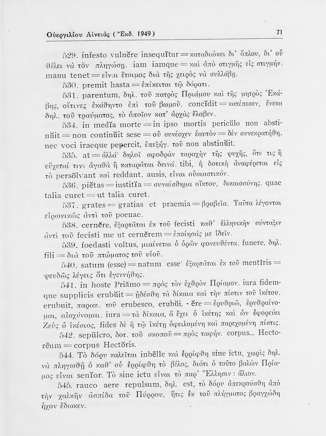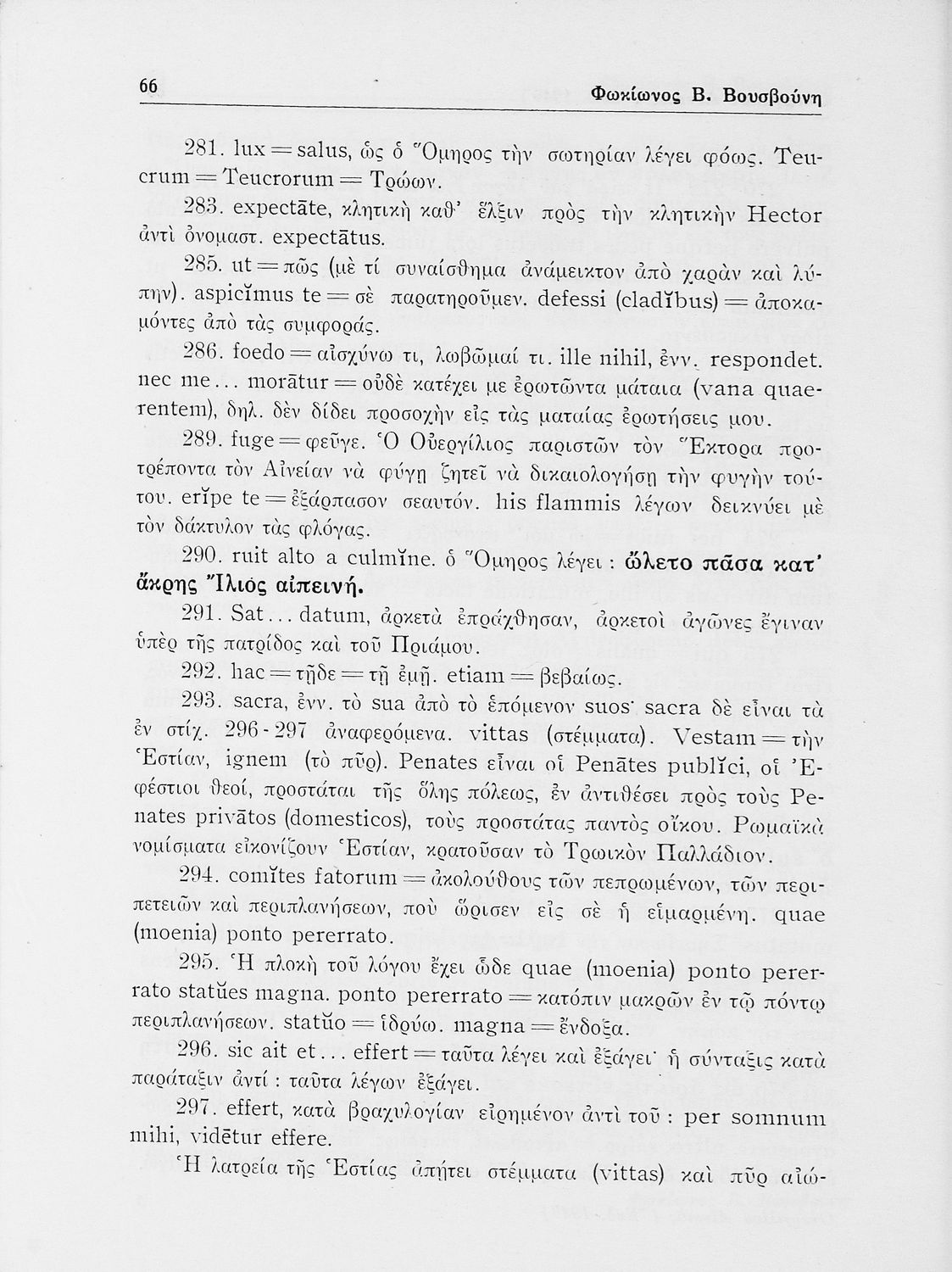 Βαθμίδα εκπαίδευσης: Δευτεροβάθμια Τάξη: ΣΤ' Γυμνασίου Μάθημα: Λατινικά Γλώσσα: Καθαρεύουσα Παρουσίαση περιεχομένου: Σχολικό εγχειρίδιο Λατινικών για τη ΣΤ΄ Γυμνασίου που περιέχει βιογραφικό σημείωμα του Βιργιλίου, εισαγωγικά σχόλια, περιλήψεις των τριών πρώτων βιβλίων της Αινειάδας, κείμενο και ερμηνευτικές σημειώσεις στo έργο. |