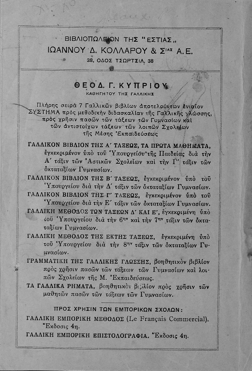 Τίτλος: Γαλλικόν βιβλίον της Γ' τάξεως εγκεκριμένον υπό του Υπουργείου της Παιδείας δια την Ε' τάξιν των Γυμνασίων νέου τύπου και τας αντιστοίχους τάξεις των λοιπών σχολείων της Μέσης Εκπαιδεύσεως