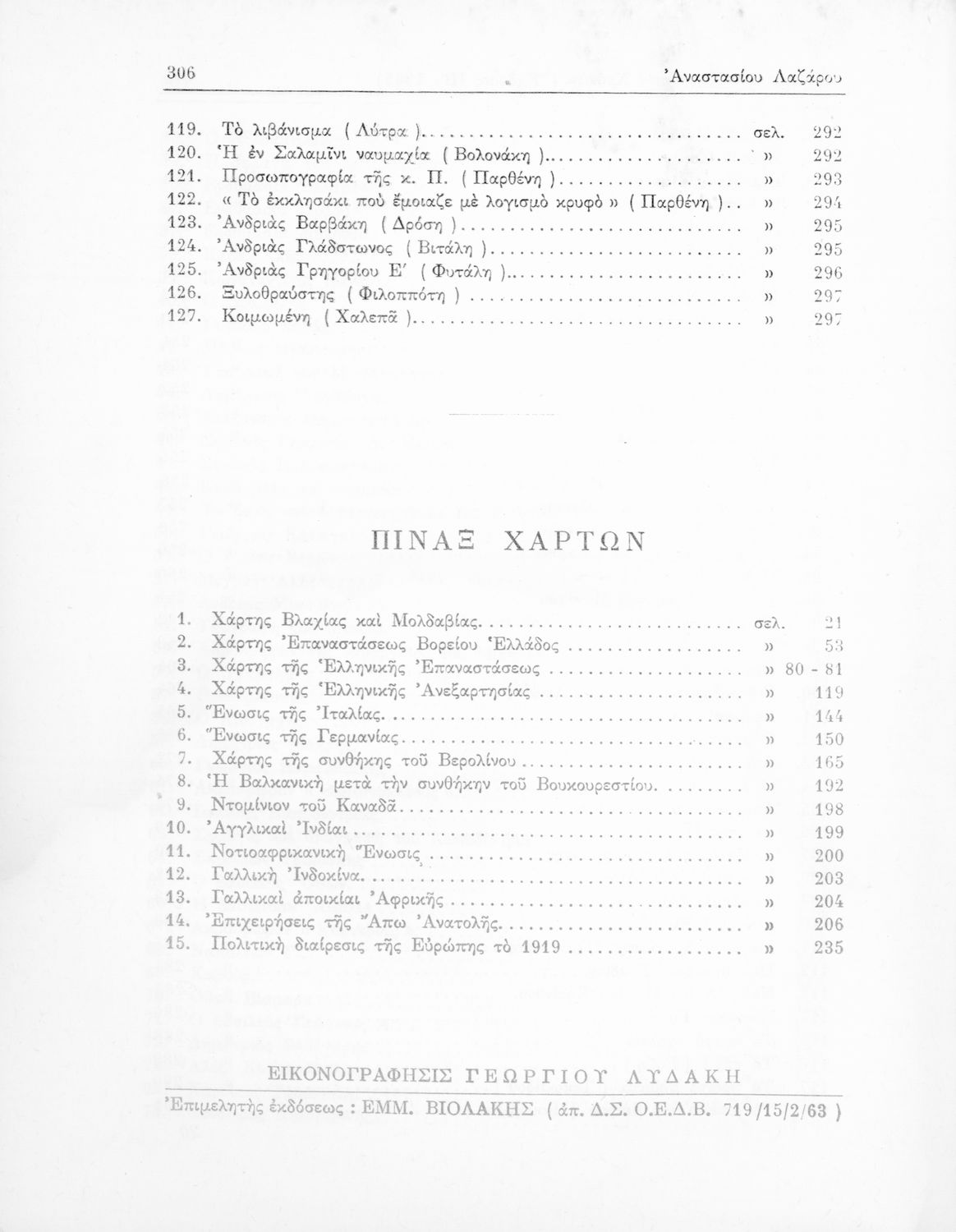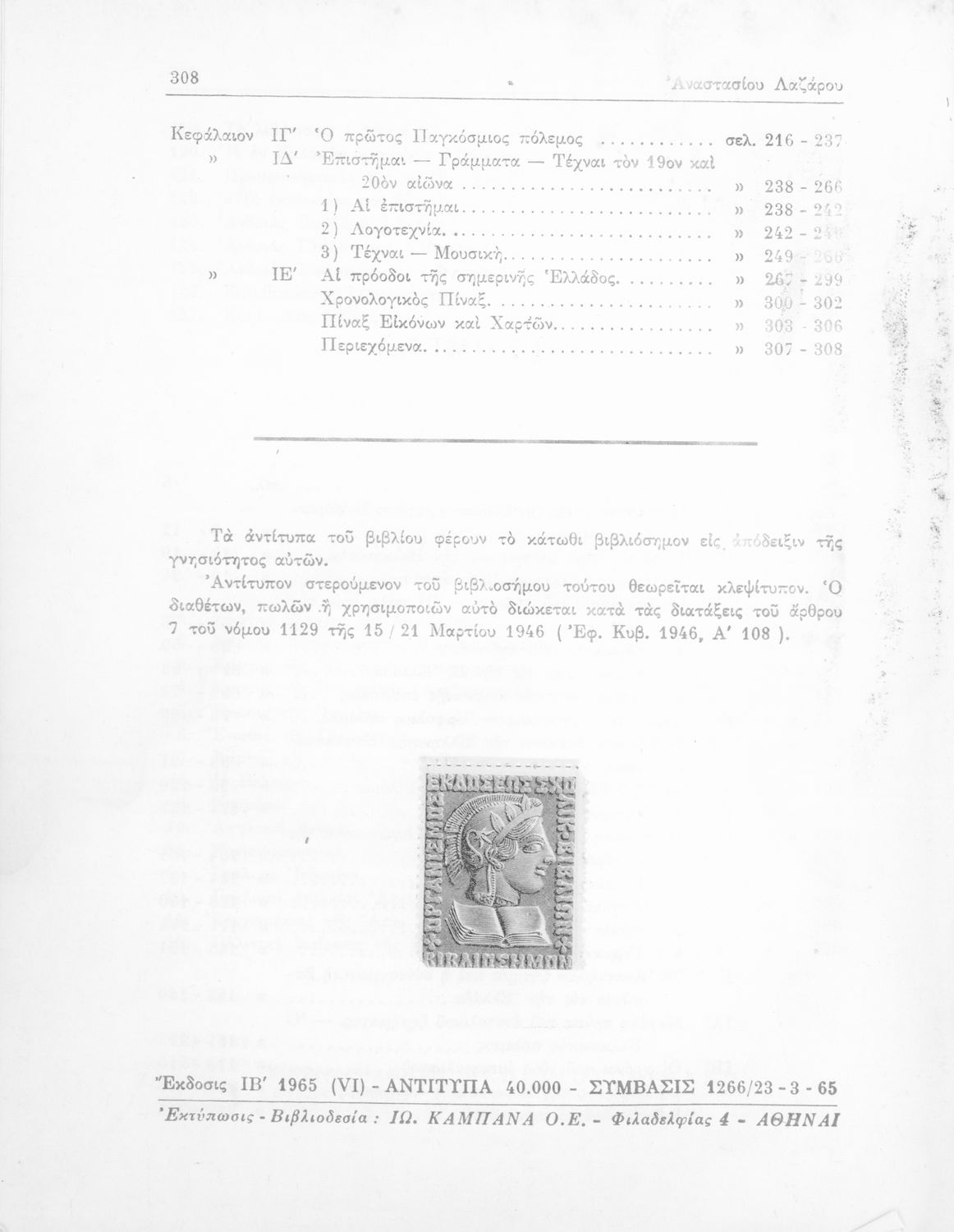 Κωδικός αναγνώρισης: 01-19751 Τίτλος: Ιστορία των Νεωτάτων Χρόνων. Από της Συνθήκης της Βιέννης (1815) μέχρι των ημερών μας. Δια την ΣΤ΄ Τάξιν των Γυμνασίων Συγγραφέας: Α. Λαζάρου Εικονογράφος: Γ. Λυδάκης Μέγεθος και υπόστρωμα: Σχολικό εγχειρίδιο, σκληρό εξώφυλλο, 308 σελίδες. Σκίτσα, χάρτης, εικόνες (ασπρόμαυρα). |