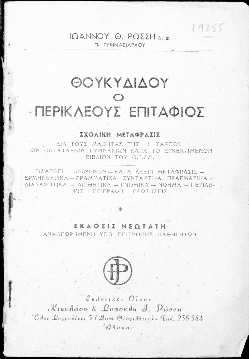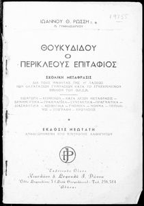Τίτλος: Θουκυδίδου Ο Περικλέους Επιτάφιος Σχολική μετάφρασις διά τους μαθητάς της Η΄ τάξεως των Οκταταξίων Γυμνασίων κατά το εγκεκριμένον βιβλίον του Ο.Ε.Σ.Β