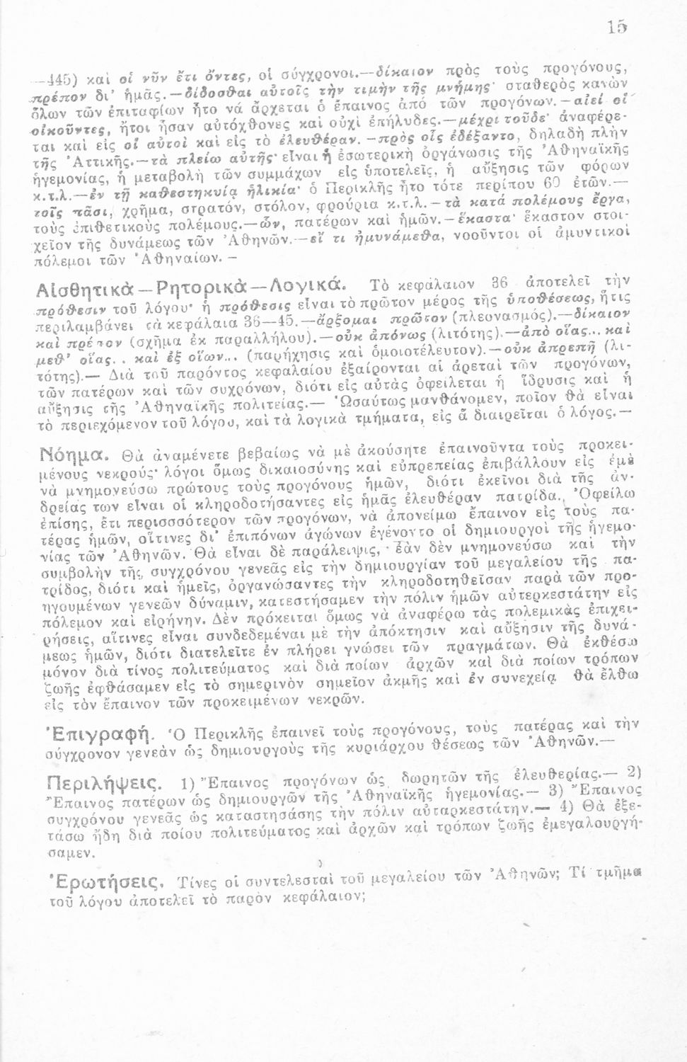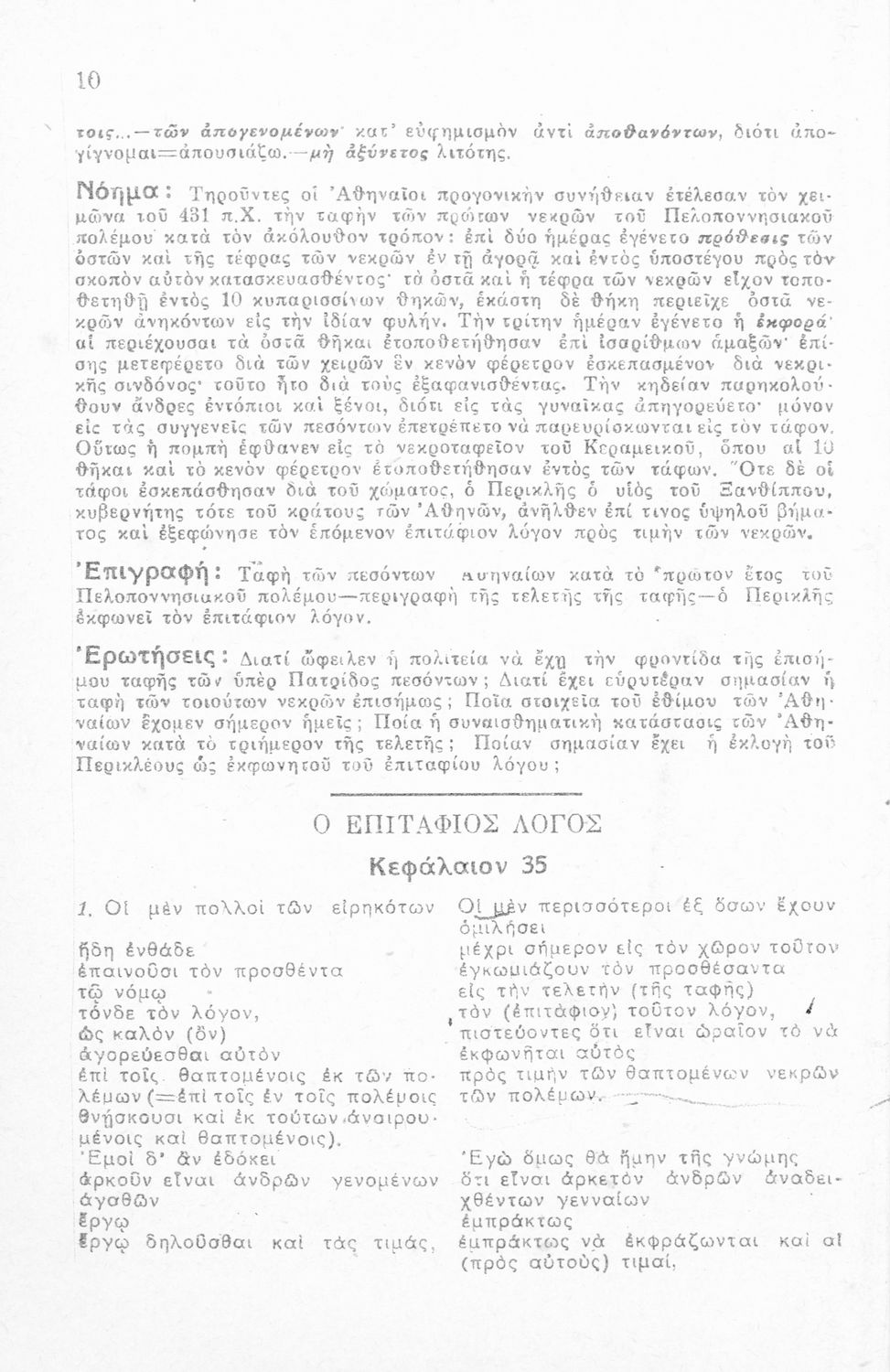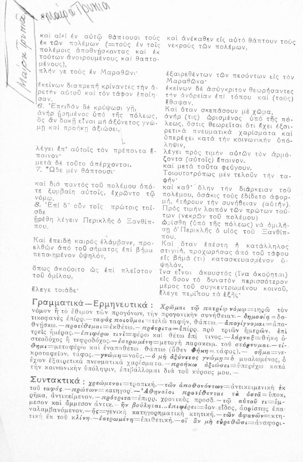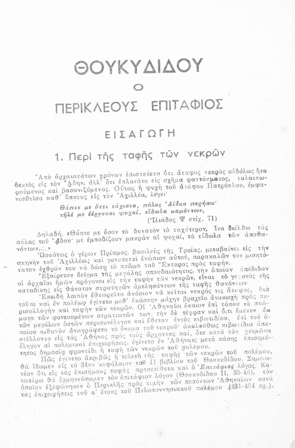 Μαθητικό βοήθημα Αρχαίων Ελληνικών για τους μαθητές της Η' τάξης των Οκταταξίων Γυμνασίων που περιέχει τον Επιτάφιο του Περικλή, μετάφραση, και γραμματικά και συντακτικά σχόλια.