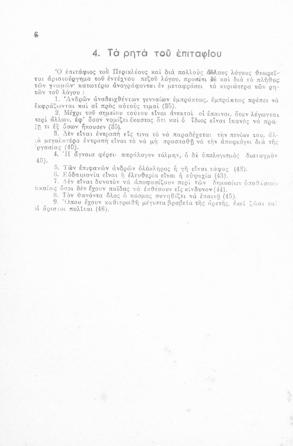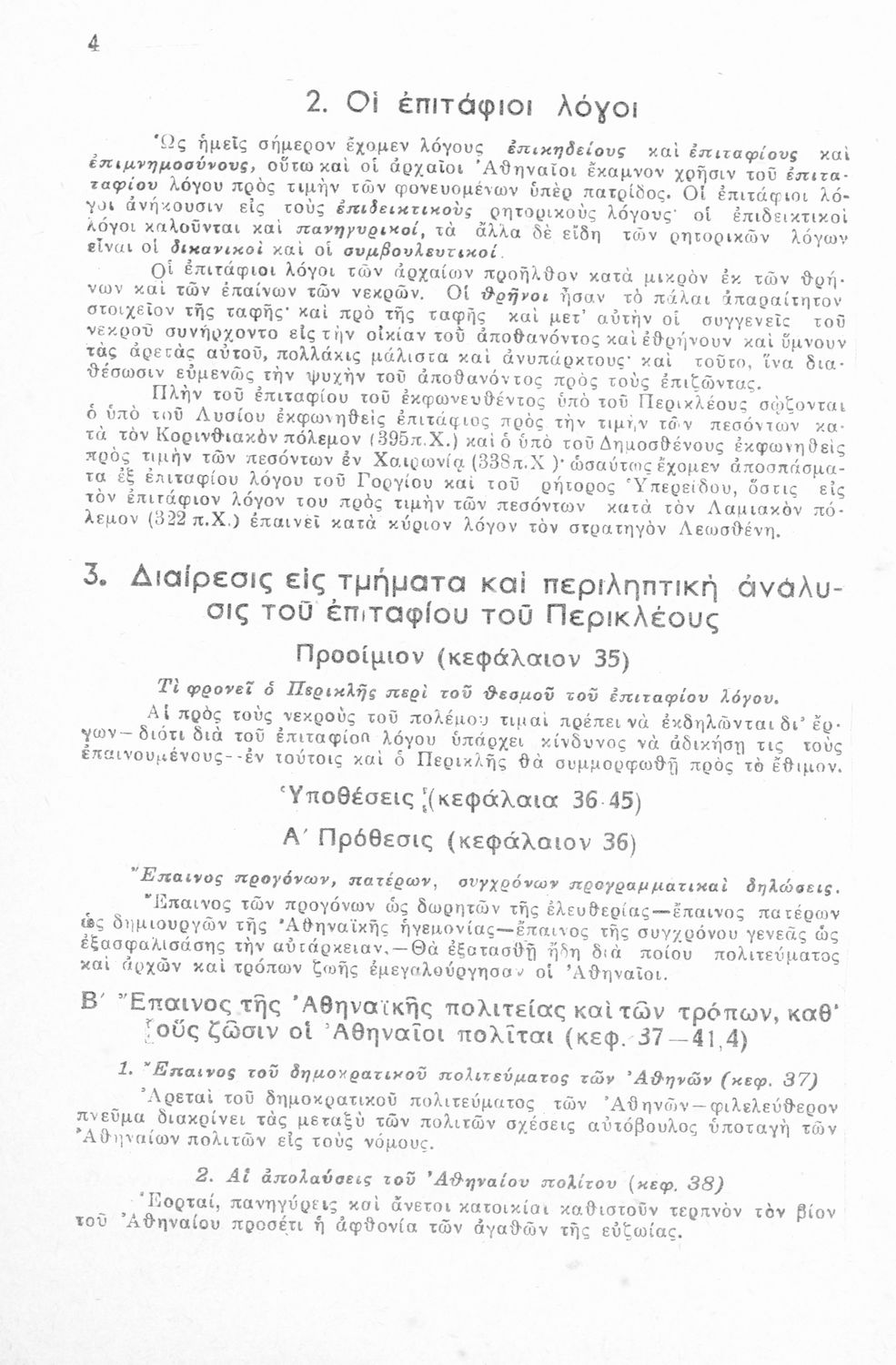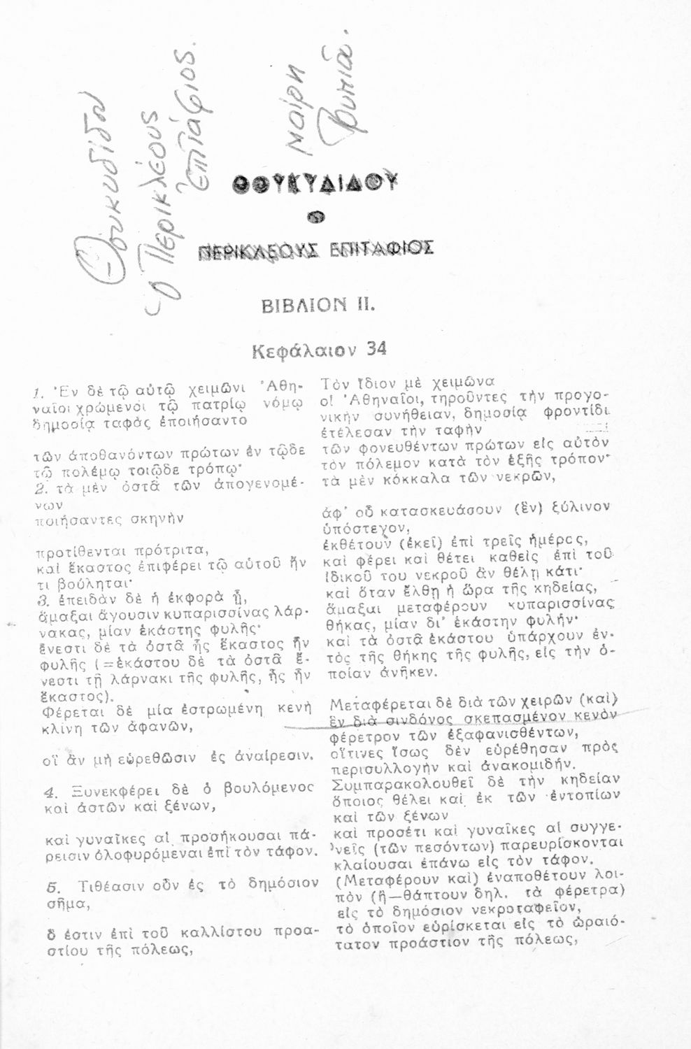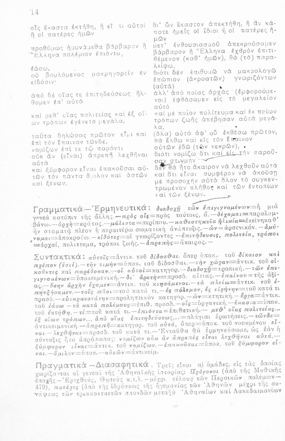Μαθητικό βοήθημα Αρχαίων Ελληνικών για τους μαθητές της Η' τάξης των Οκταταξίων Γυμνασίων που περιέχει τον Επιτάφιο του Περικλή, μετάφραση, και γραμματικά και συντακτικά σχόλια.