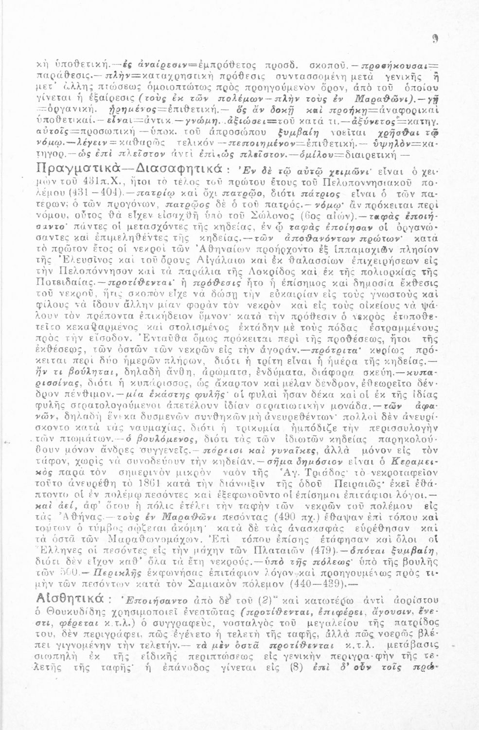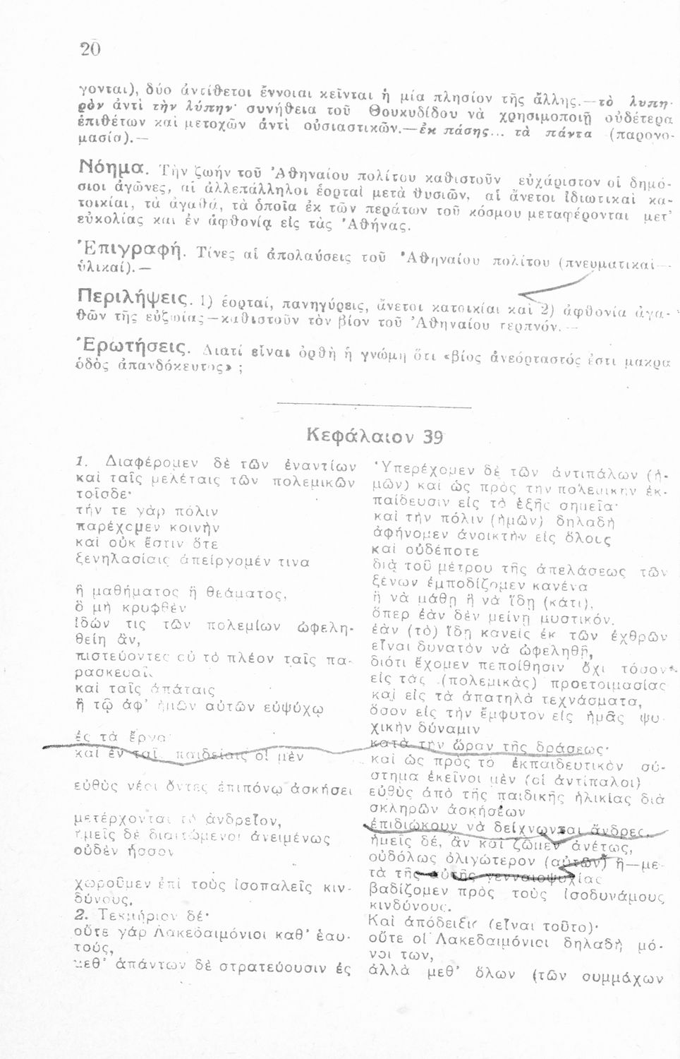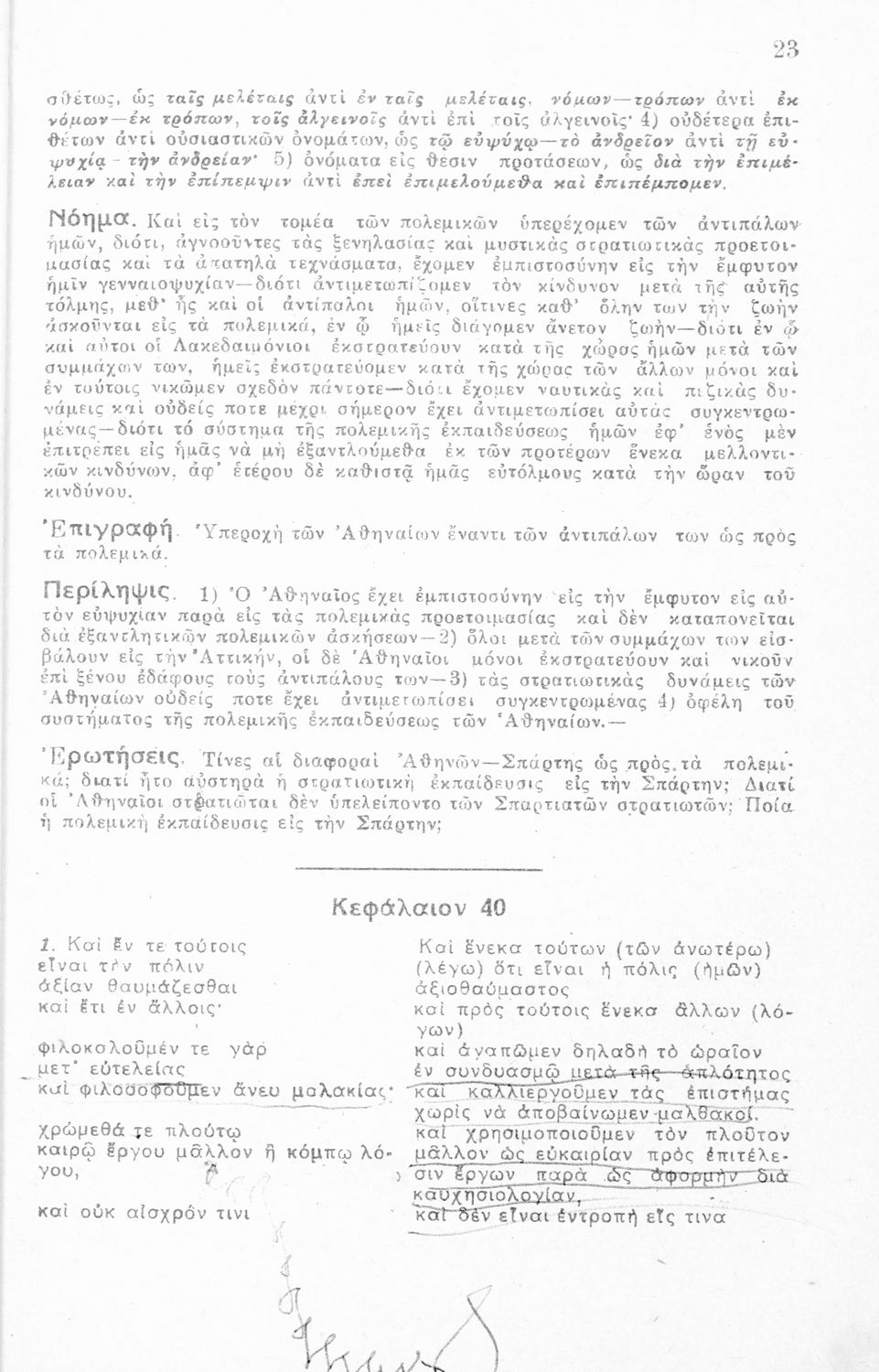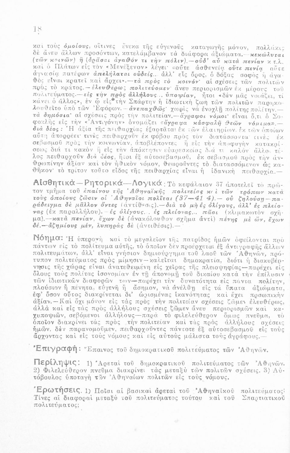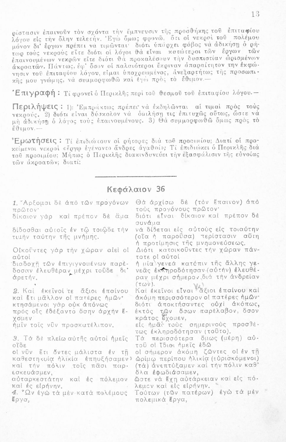 Μαθητικό βοήθημα Αρχαίων Ελληνικών για τους μαθητές της Η' τάξης των Οκταταξίων Γυμνασίων που περιέχει τον Επιτάφιο του Περικλή, μετάφραση, και γραμματικά και συντακτικά σχόλια.