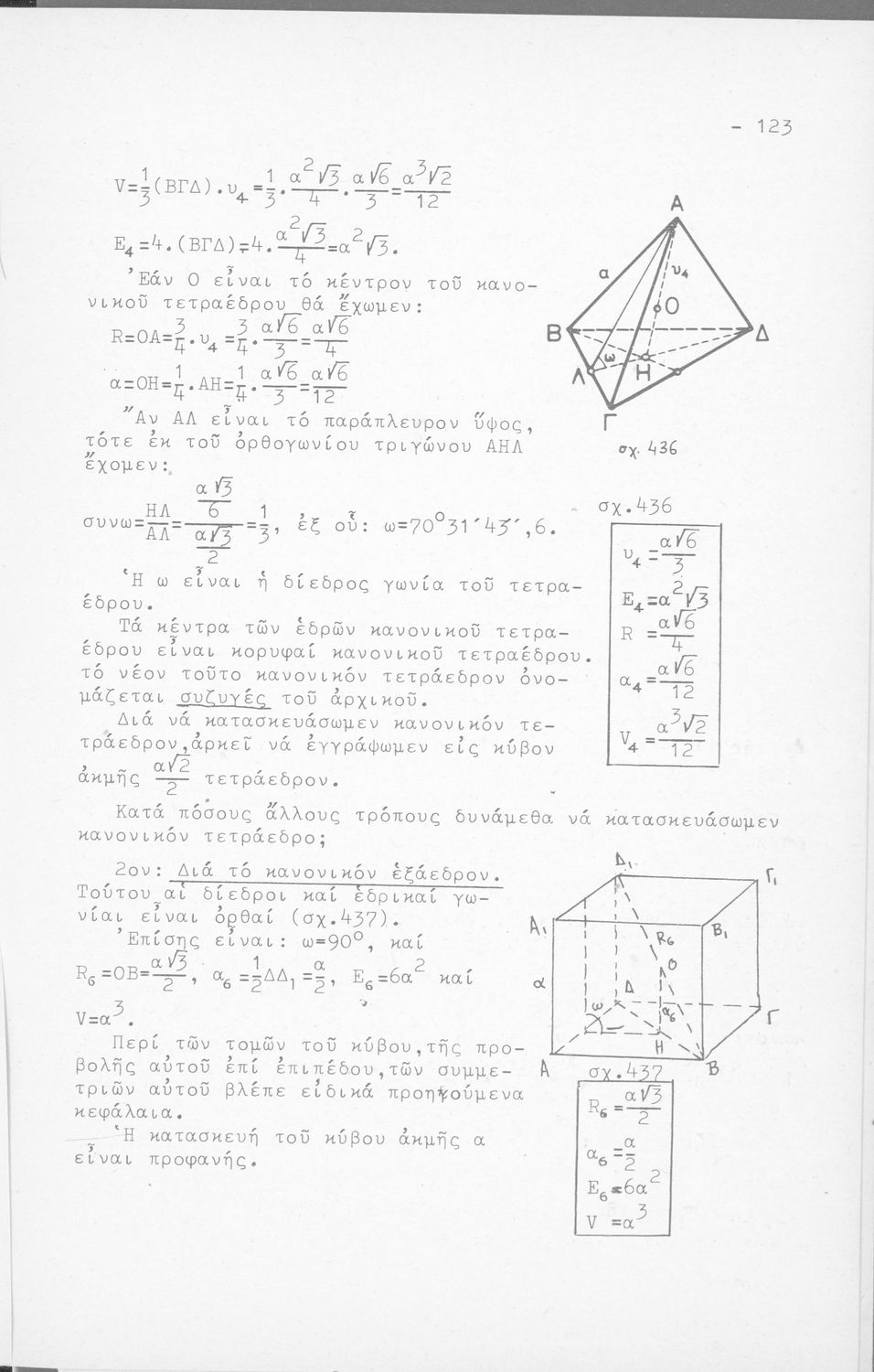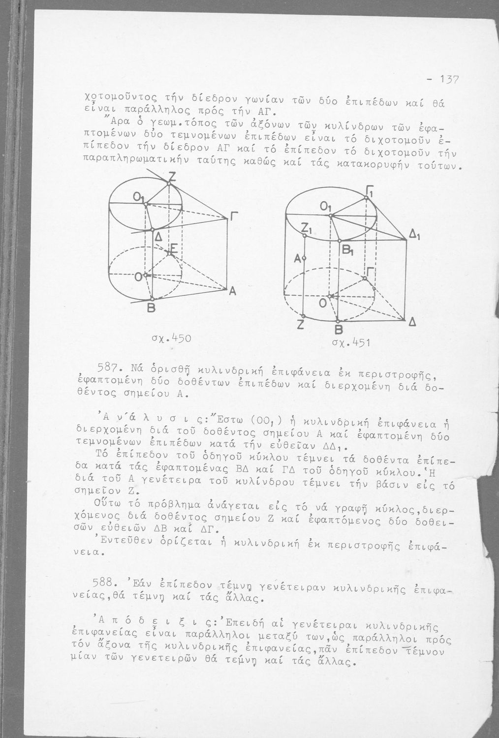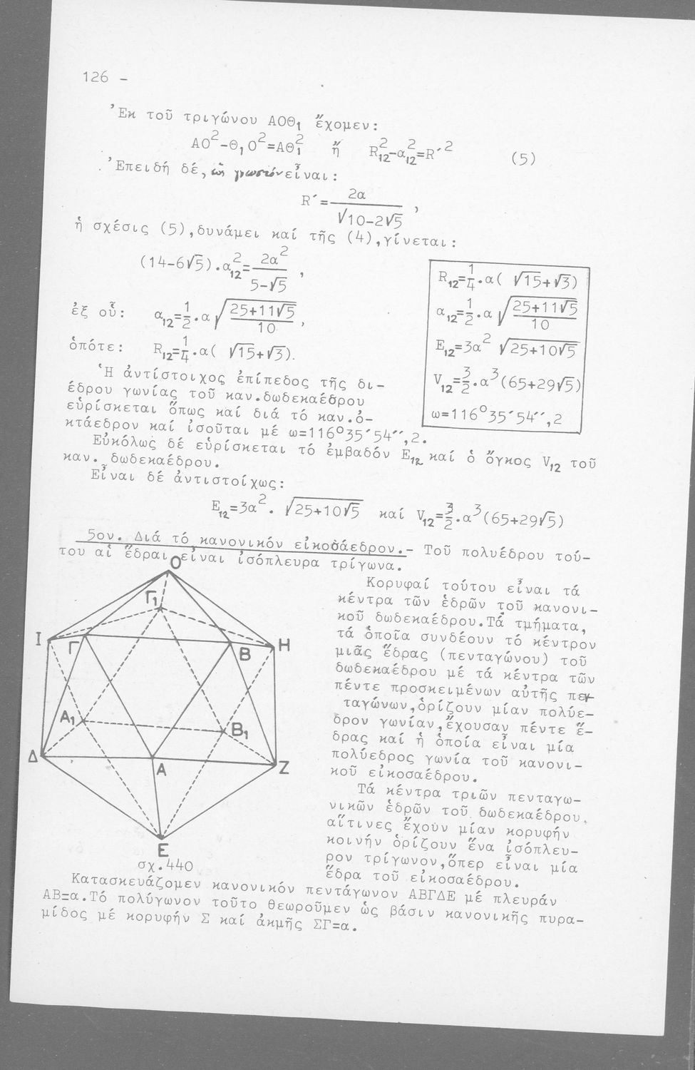 Σχολικό εγχειρίδιο Μαθηματικών Δ΄ και Ε΄ Γυμνασίου που είναι χωρισμένο σε θεωρήματα και ασκήσεις και εστιάζει στη Γεωμετρία. Φέρει το σύμβολο της δικτατορίας.