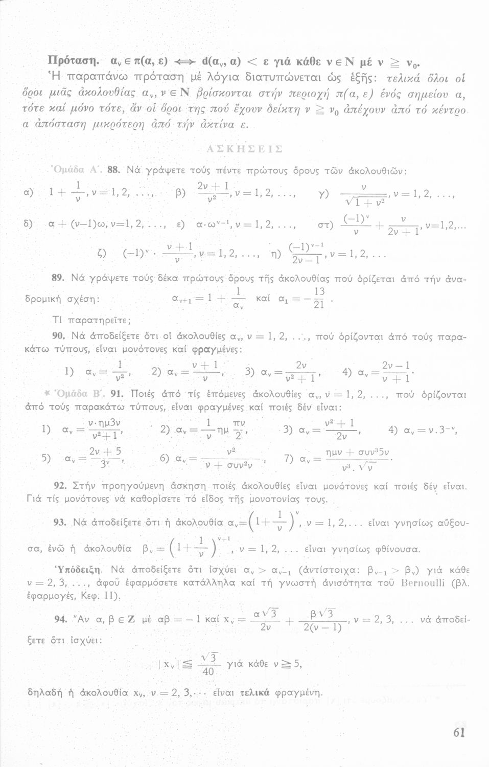 Σχολικό εγχειρίδιο Άλγεβρας Β΄ Λυκείου χωρισμένο σε αξιώματα, θεωρήματα, παρατηρήσεις και ασκήσεις που εστιάζει στα σύνολα, τις ακολουθίες και τις προόδους.