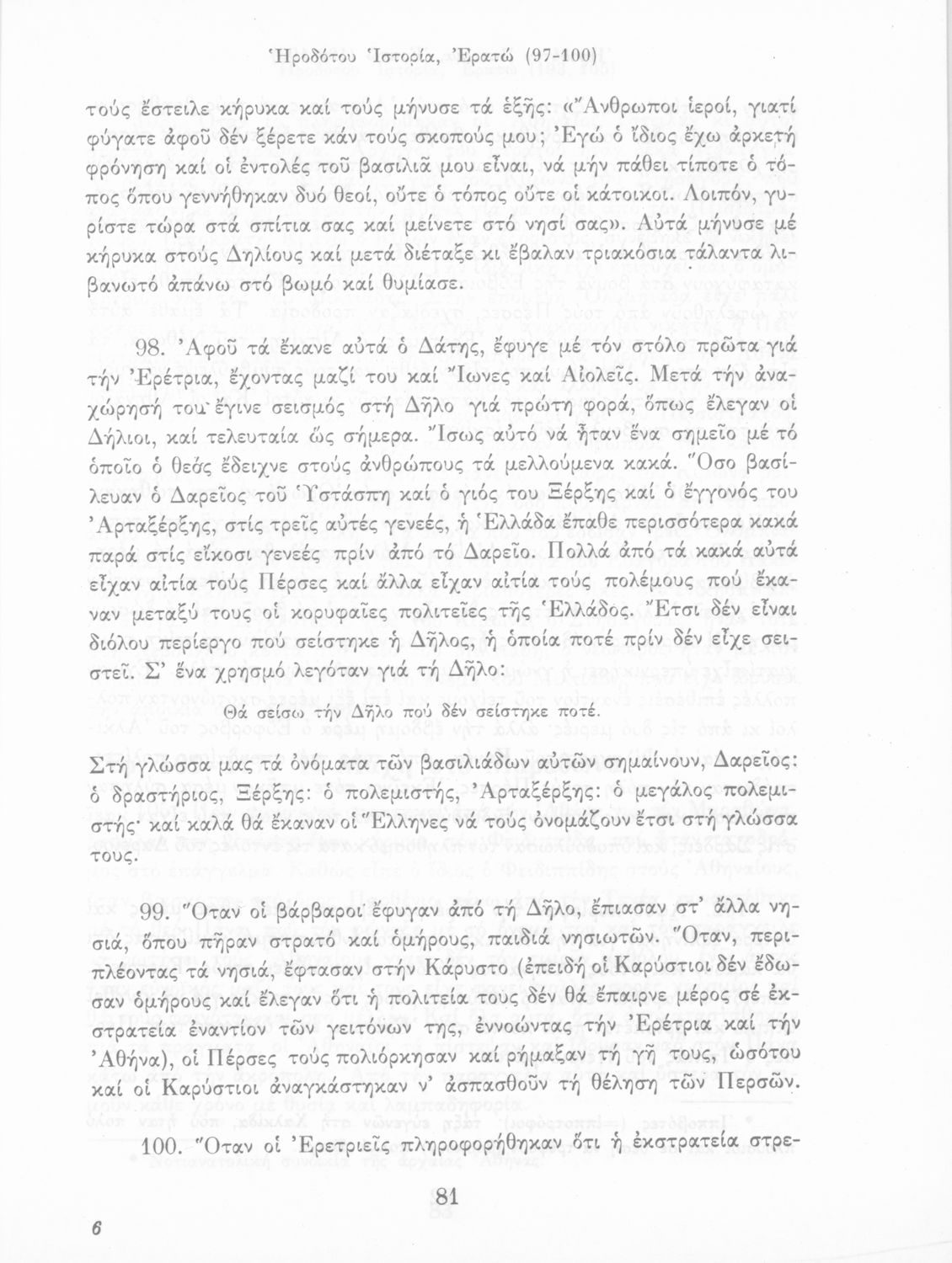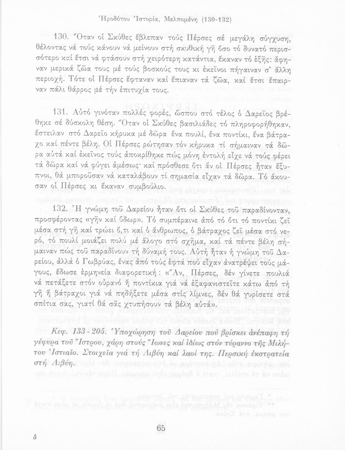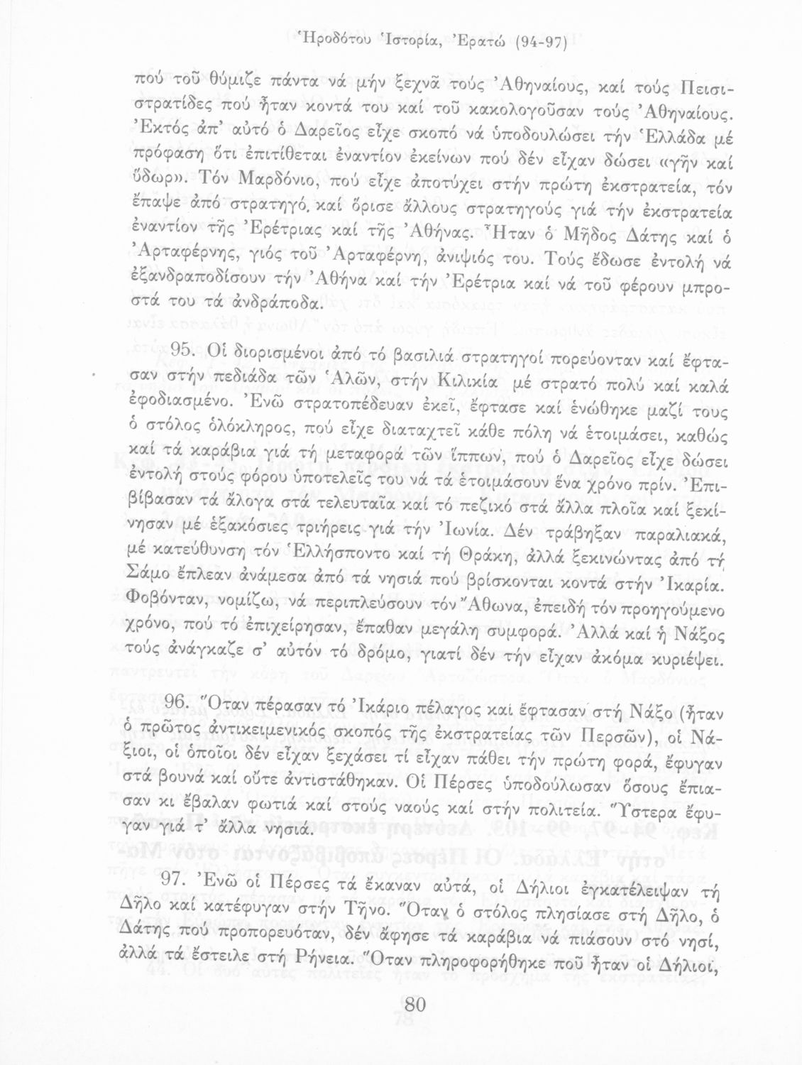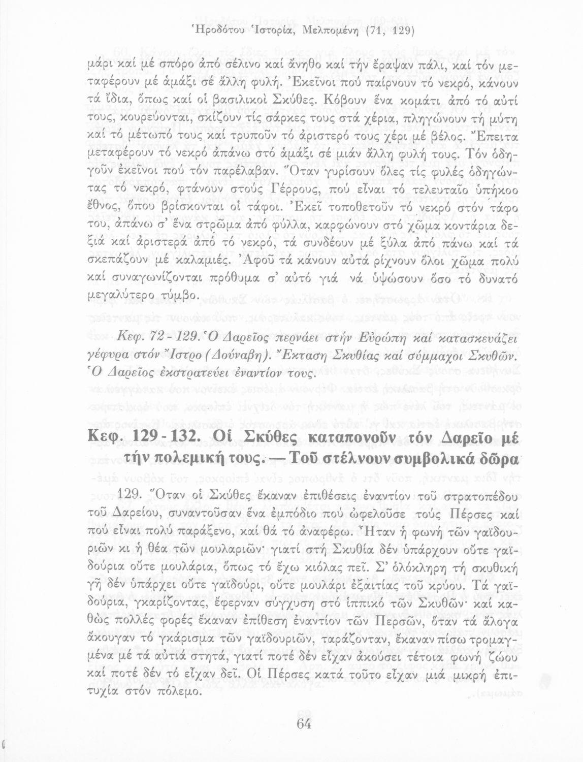 Σχολικό εγχειρίδιο Αρχαίων Ελληνικών Α΄ Γυμνασίου που περιλαμβάνει αποσπάσματα από την Ιστορία του Ηρόδοτου σε μετάφραση, εισαγωγή στη ζωή, το έργο και τη διάλεκτό του και ερμηνευτικά και πραγματολογικά σχόλια.